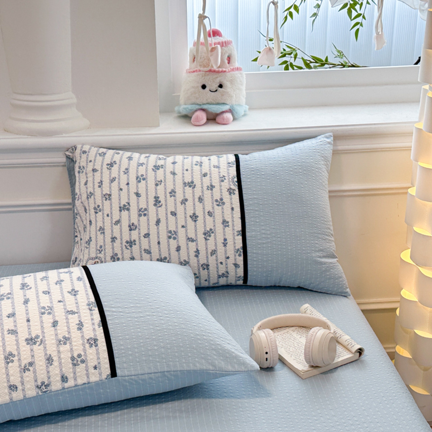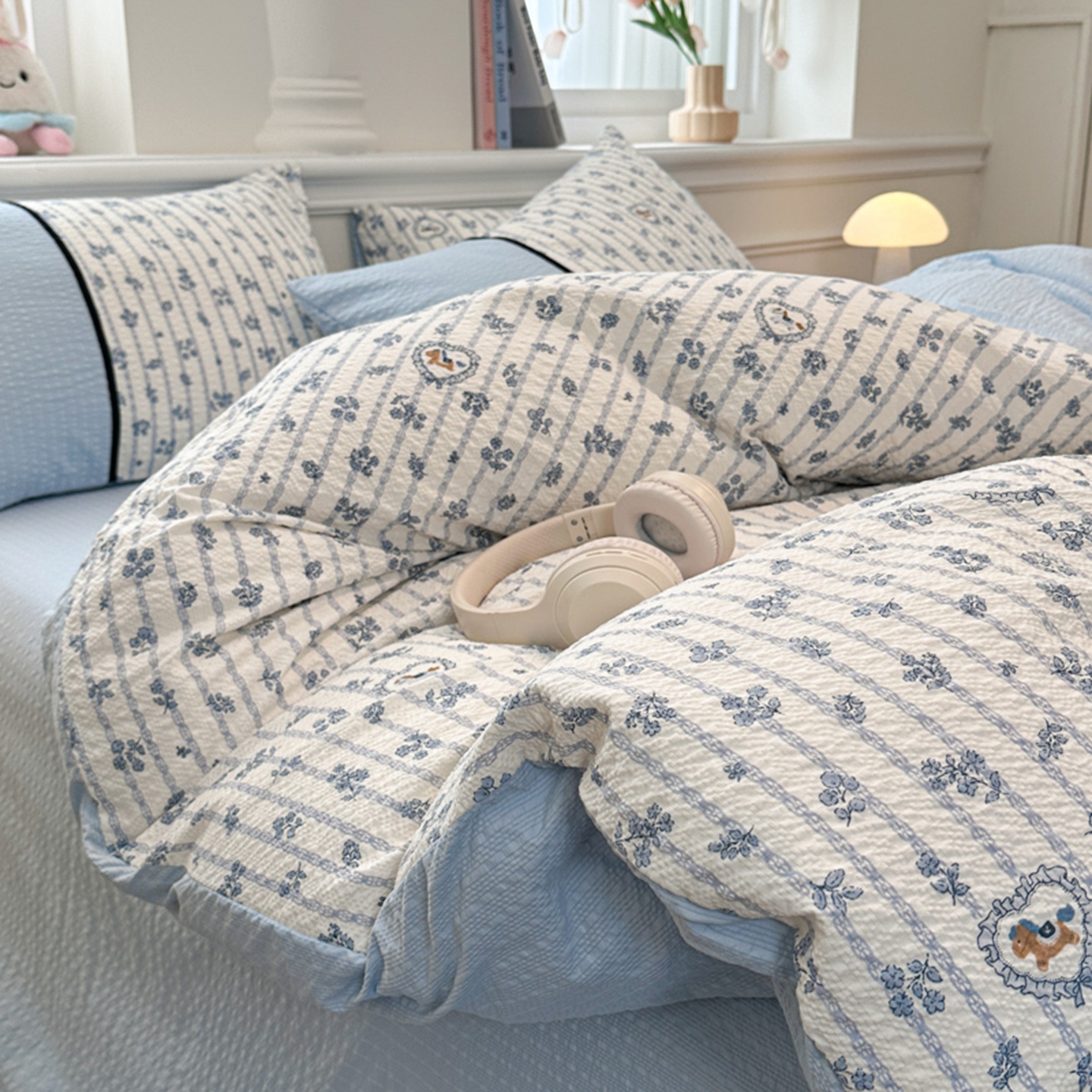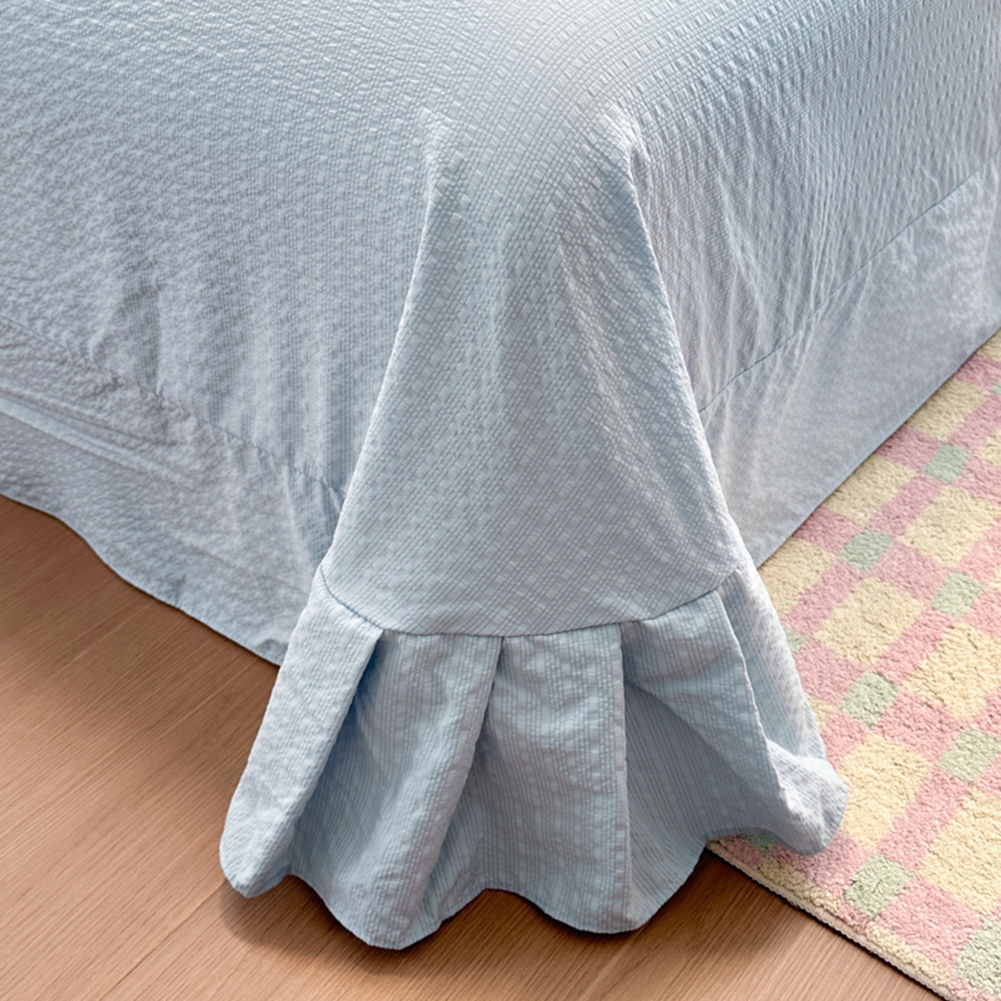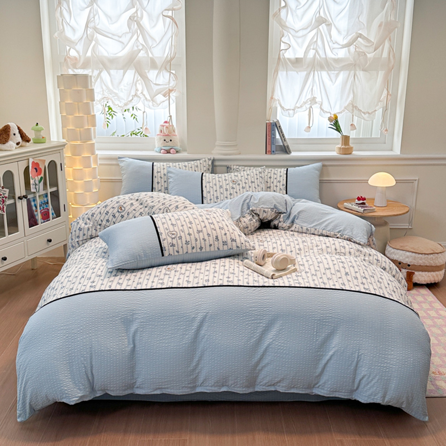 诺梵家纺 2026春夏新品高克重拼接泡芙纱泡泡皱皱纱四件套 蓝雾花