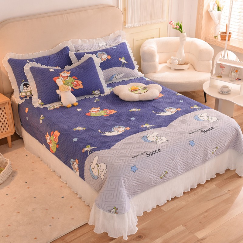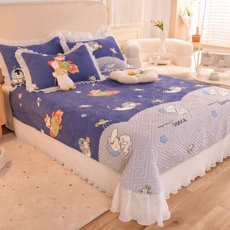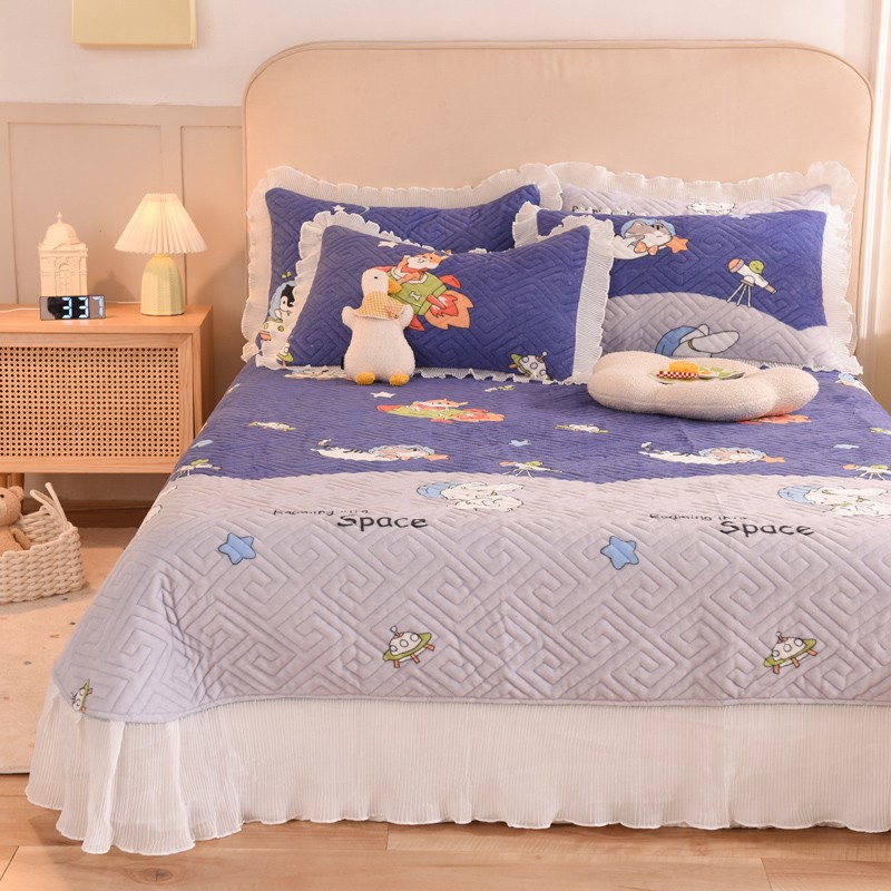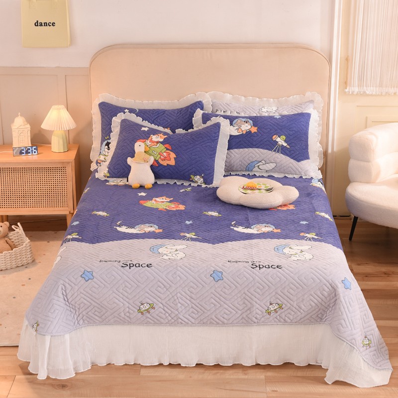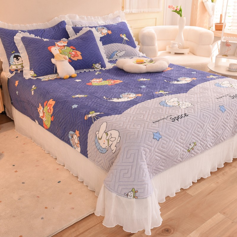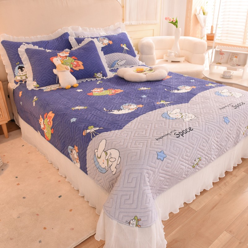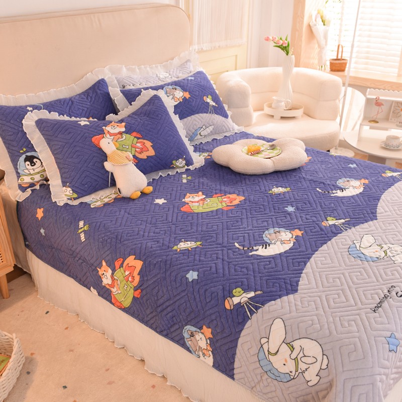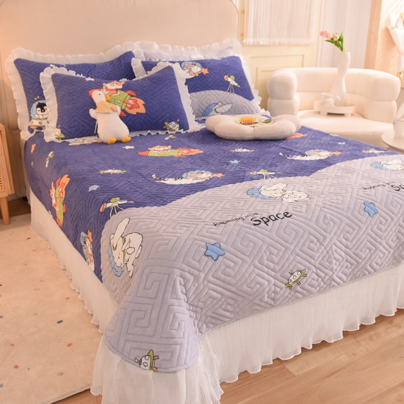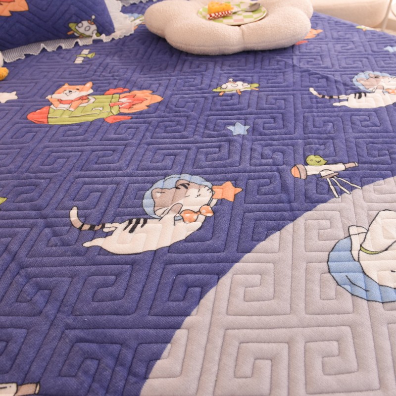 2025新款牛奶绒印花夹棉花边 单品床盖 喵星球