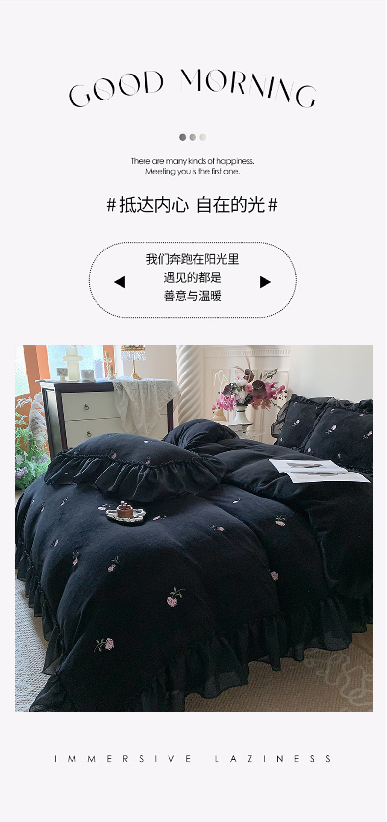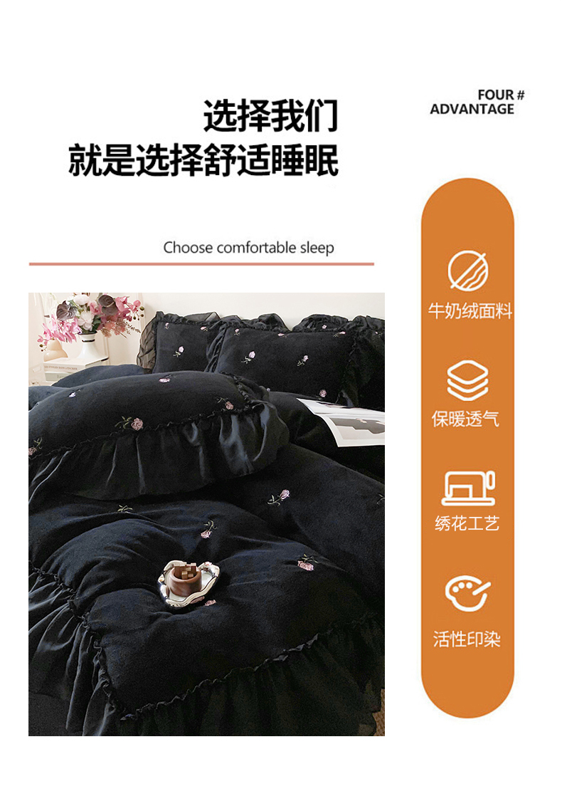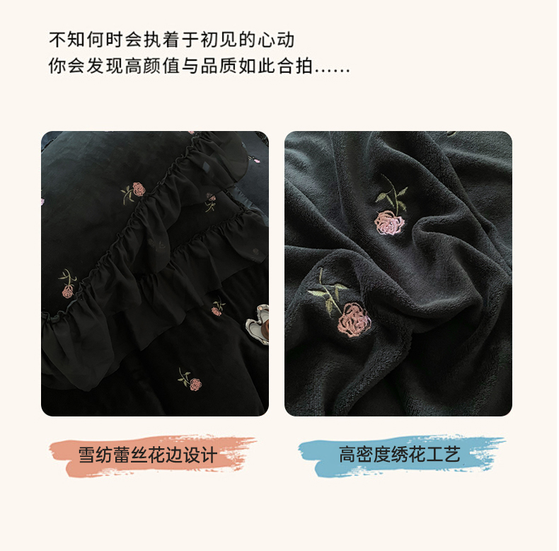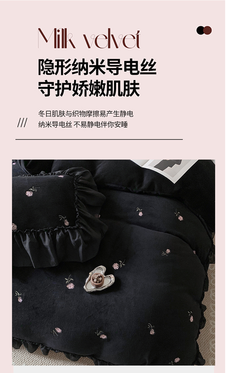 当前位置: 91家纺网 > 商品网购 > 床品套件 > 四件套 > 牛奶绒四件套 > 你好美丽 2025新款200克A类牛奶绒蕾丝花边工艺款四件套 安娜黑
