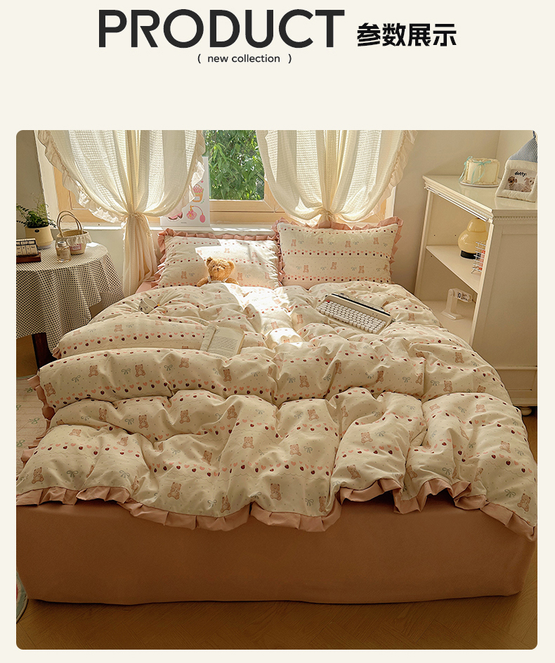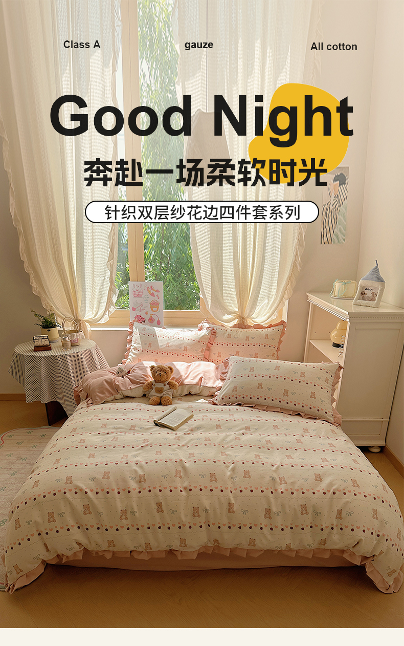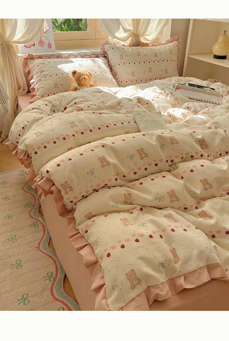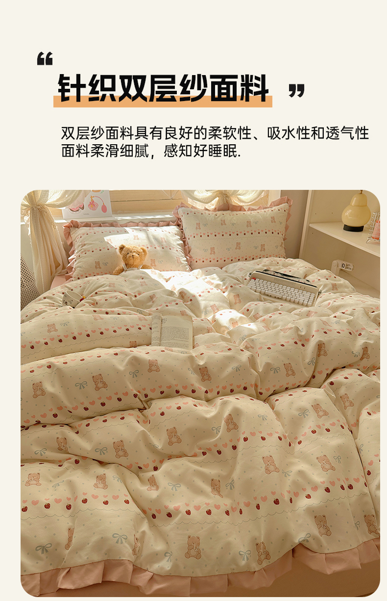 当前位置: 91家纺网 > 商品网购 > 床品套件 > 四件套 > 双层纱四件套 > 韩巢家纺 2025新款针织双层纱花边款被套直播热销款四件套学生宿舍床单三件套-(提供卖家秀) 可爱熊