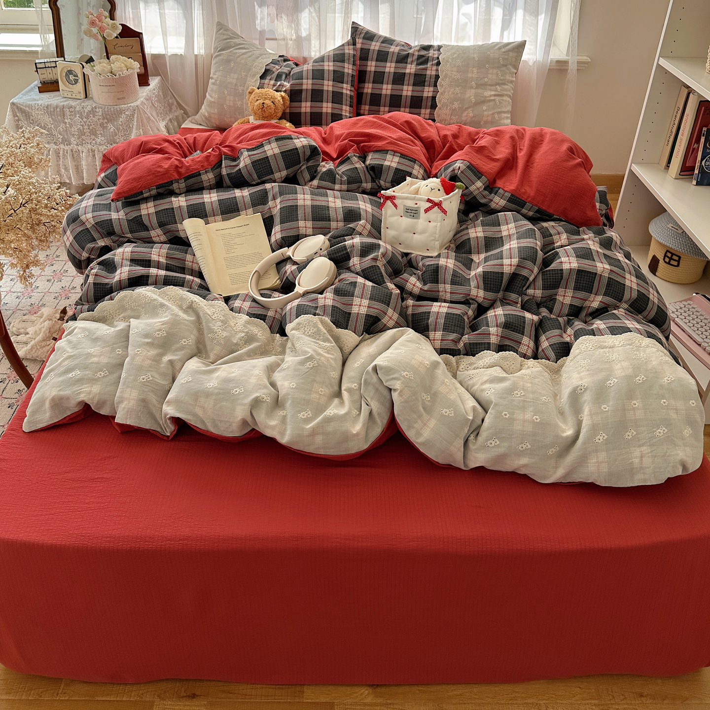 当前位置: 91家纺网 > 商品网购 > 床品套件 > 四件套 > 其它四件套 > 顾里家纺 2025新款韩系ins复古蕾丝格纹套件四件套 红莓糖霜