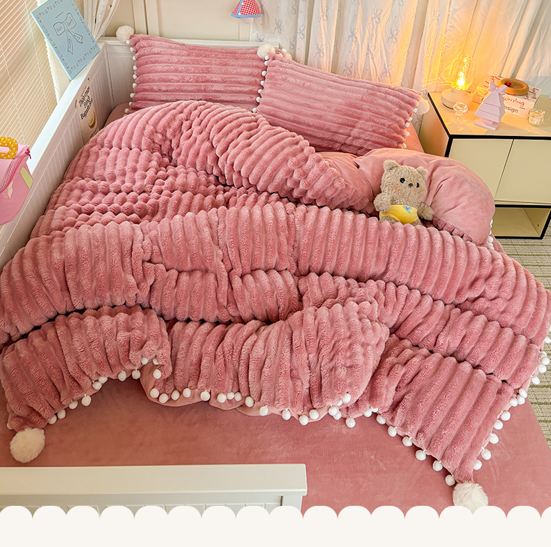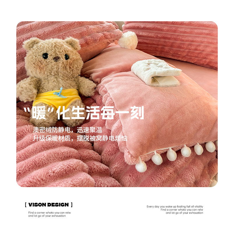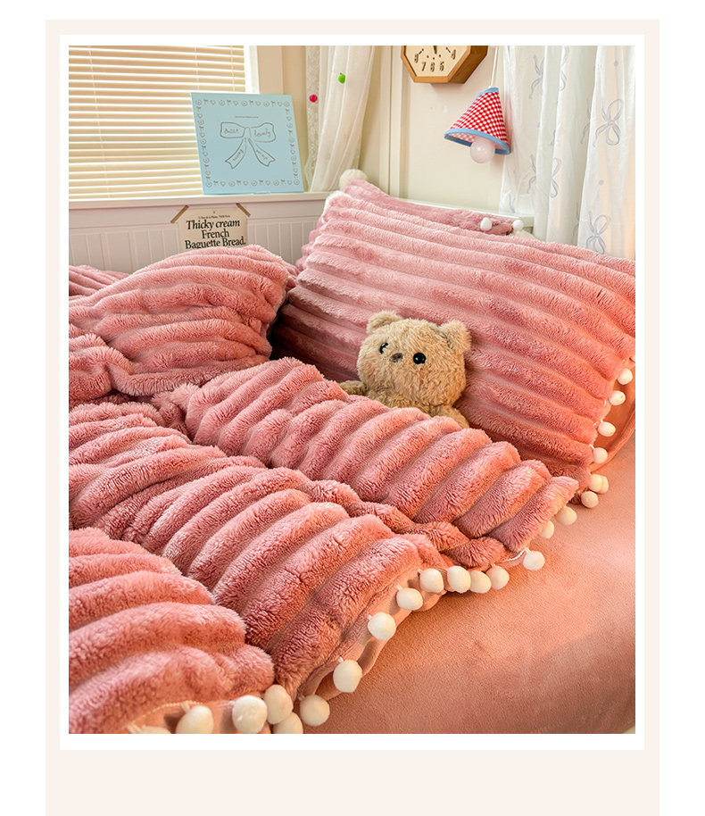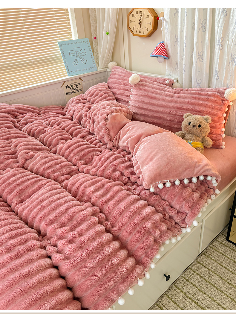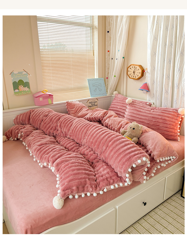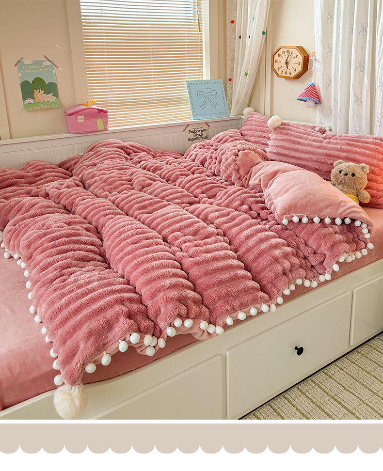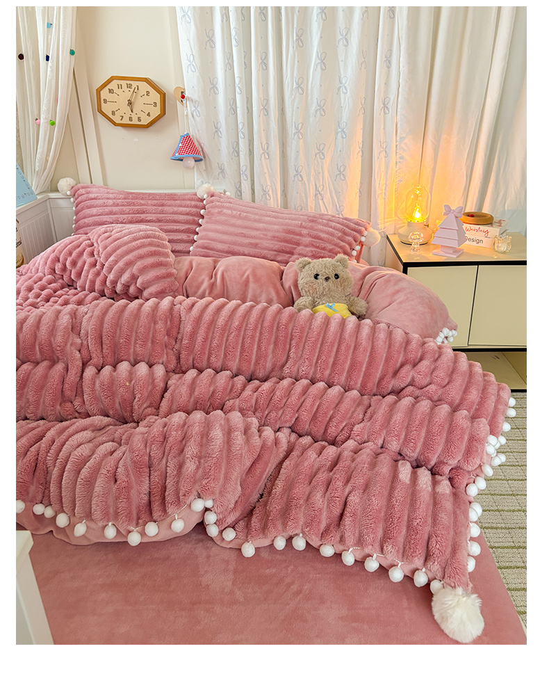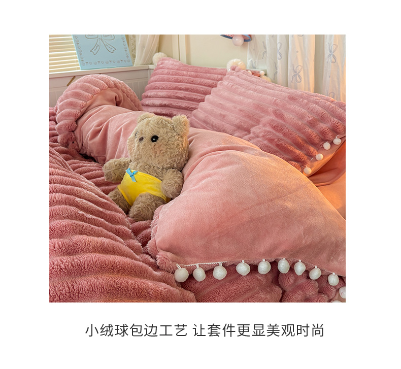 当前位置: 91家纺网 > 商品网购 > 床品套件 > 四件套 > 牛奶绒四件套 > 潮邦创意家居 2025新款宽条小球工艺款牛奶绒四件套-绒条织梦系列 绒条织梦-粉色