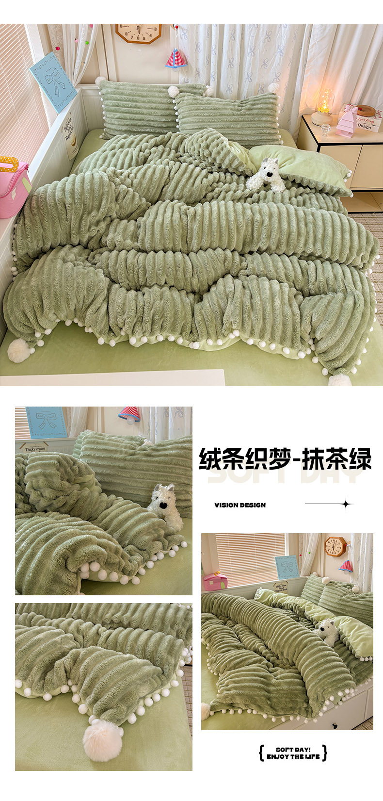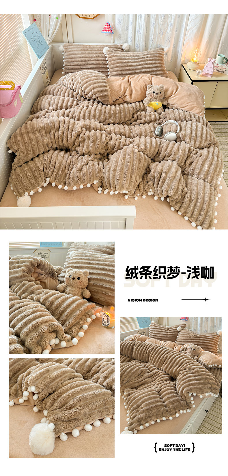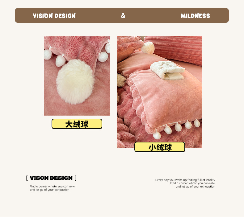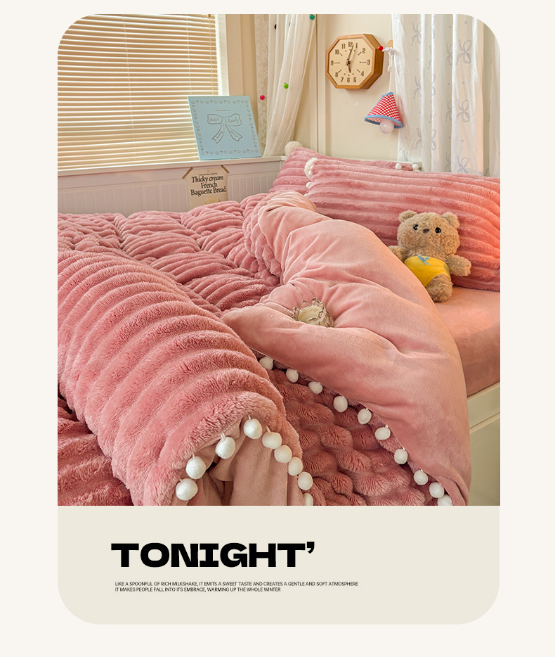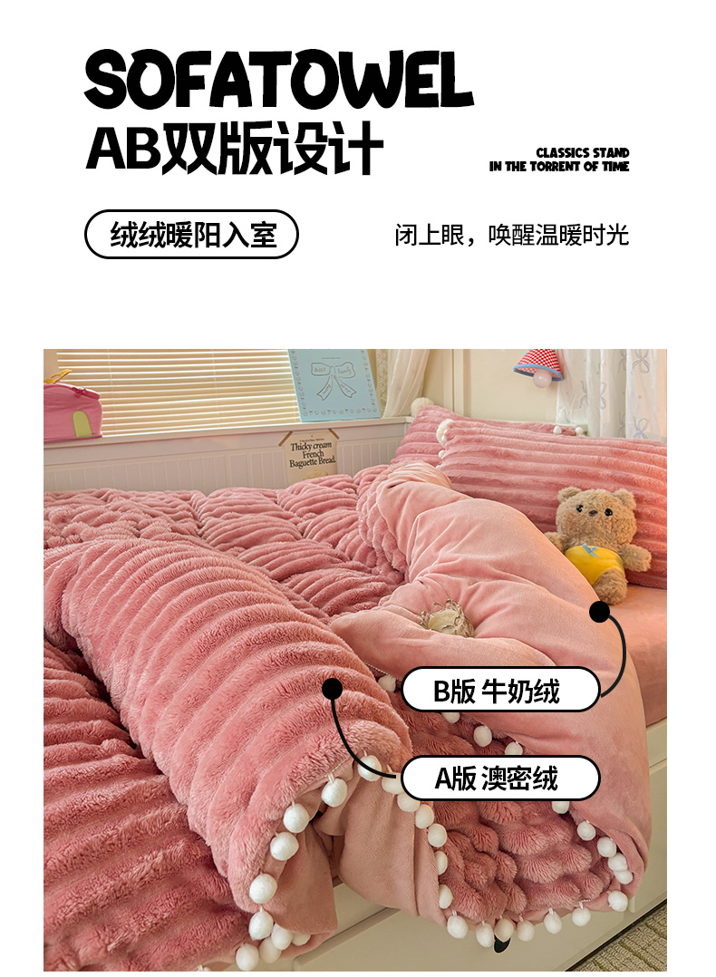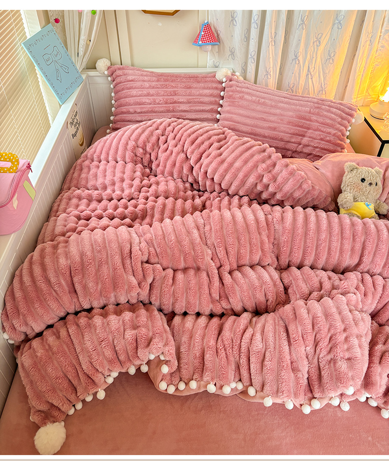 当前位置: 91家纺网 > 商品网购 > 床品套件 > 四件套 > 牛奶绒四件套 > 潮邦创意家居 2025新款宽条小球工艺款牛奶绒四件套-绒条织梦系列 绒条织梦-粉色