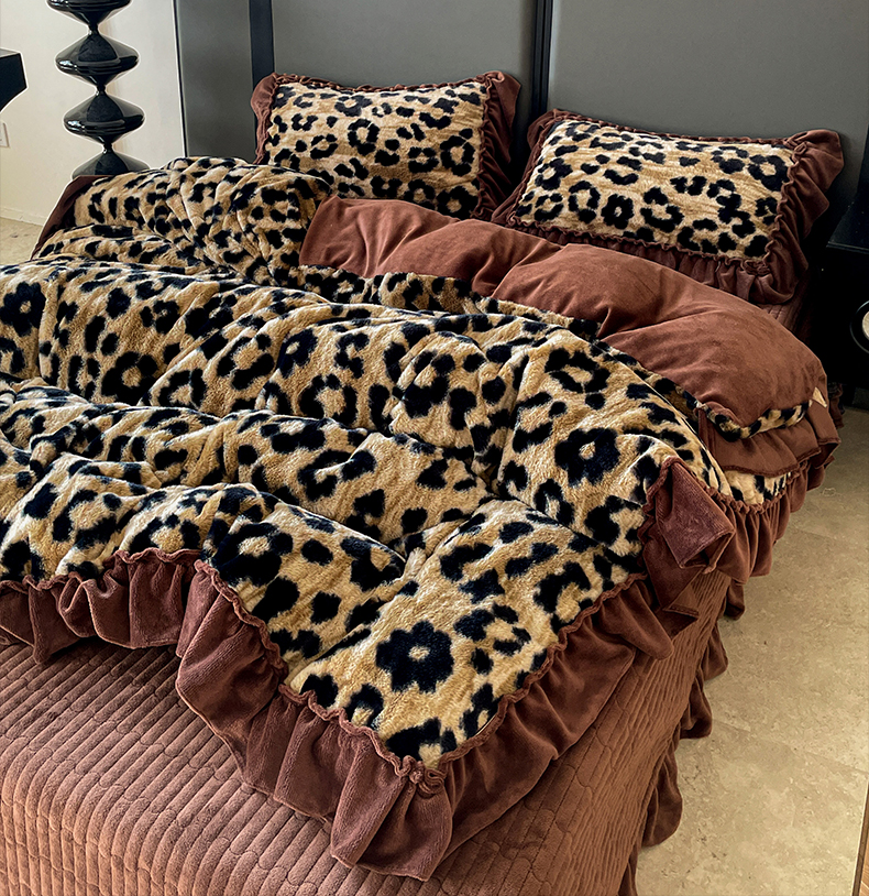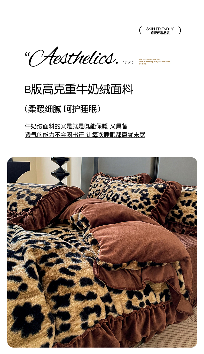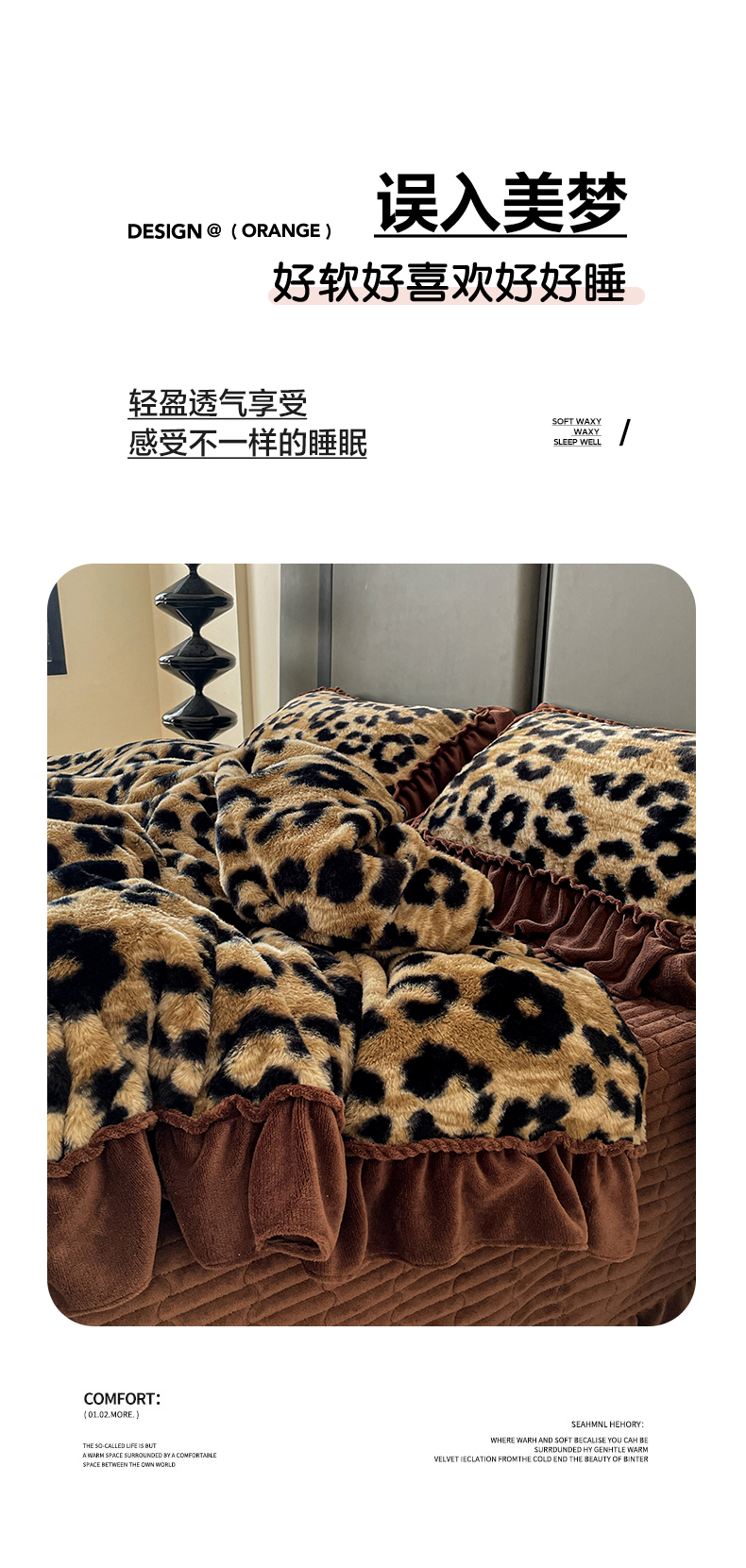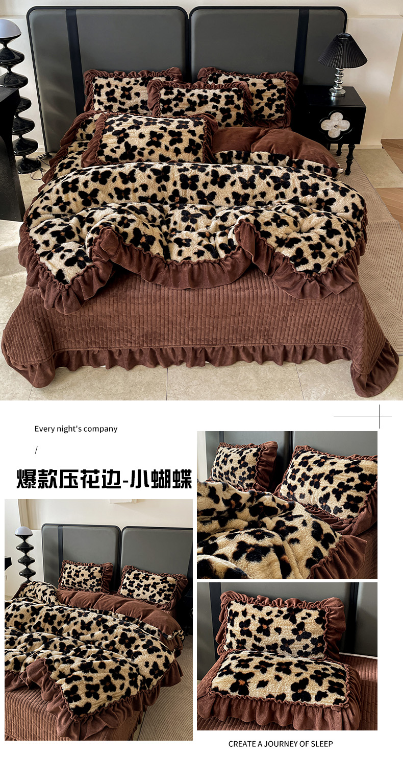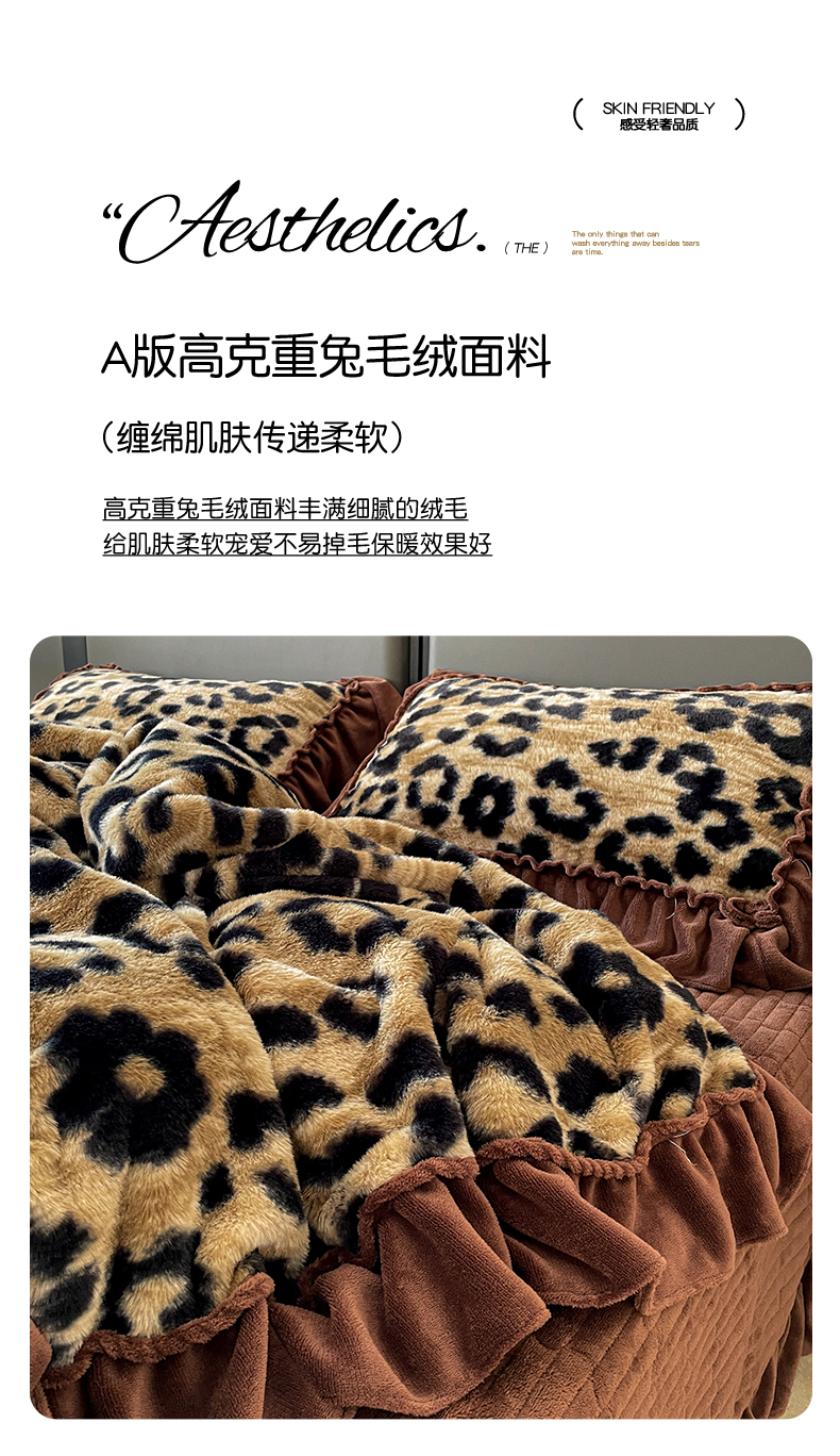 当前位置: 91家纺网 > 商品网购 > 床品套件 > 四件套 > 兔毛绒四件套 > 富米莱(原臻工厂) 2025新款美拉德高克重兔毛大花边床盖床裙四件套-花边系列 爆款压花边-豹纹