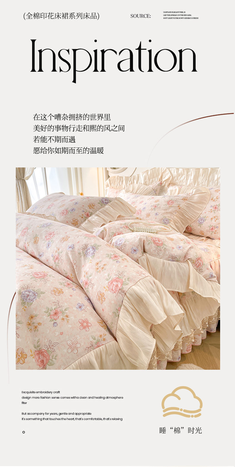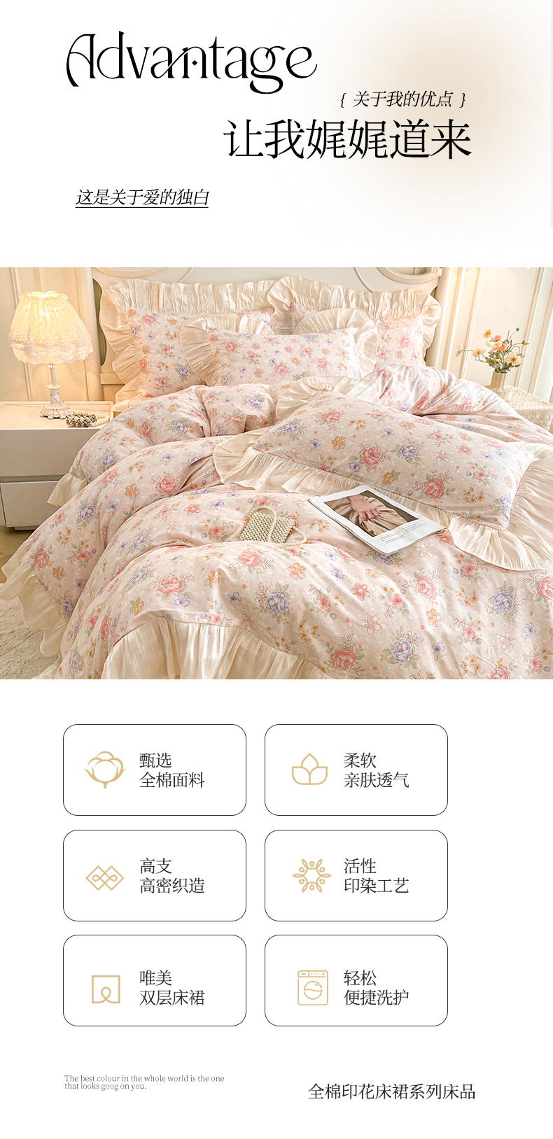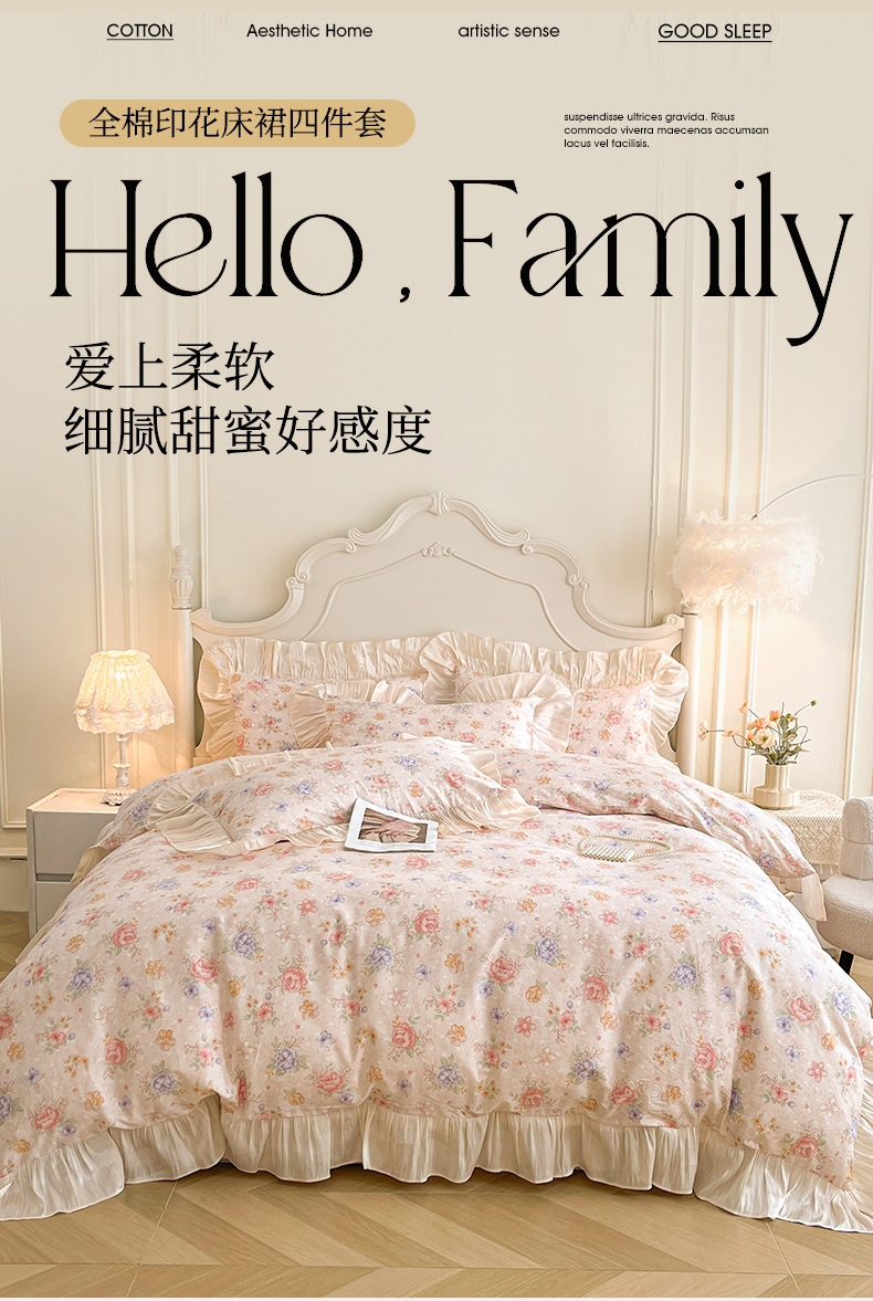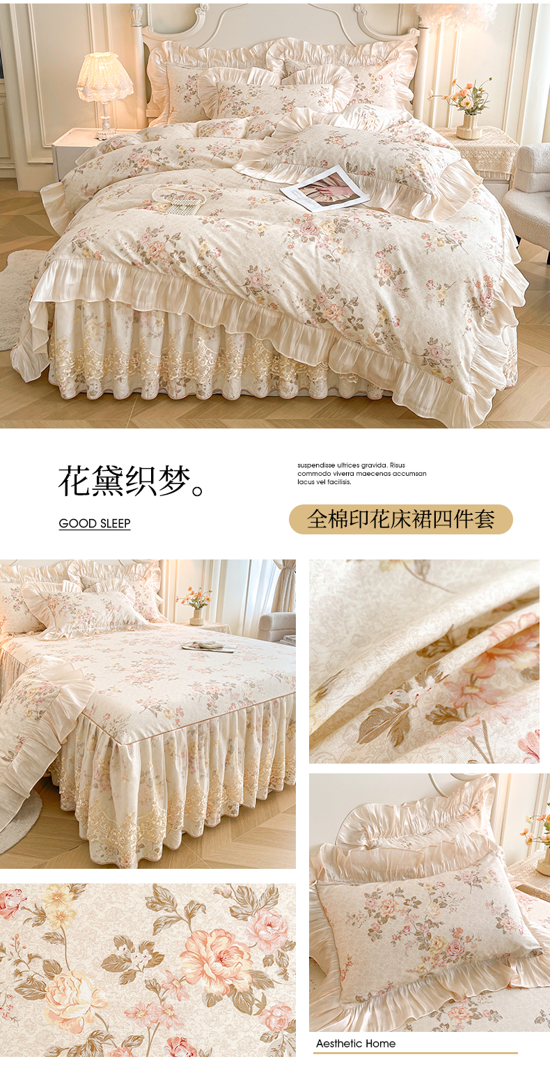 当前位置: 91家纺网 > 商品网购 > 床品套件 > 四件套 > 全棉普通四件套 > 宜凡家纺 2026新款全棉印花床裙款四件套 寻觅花季
