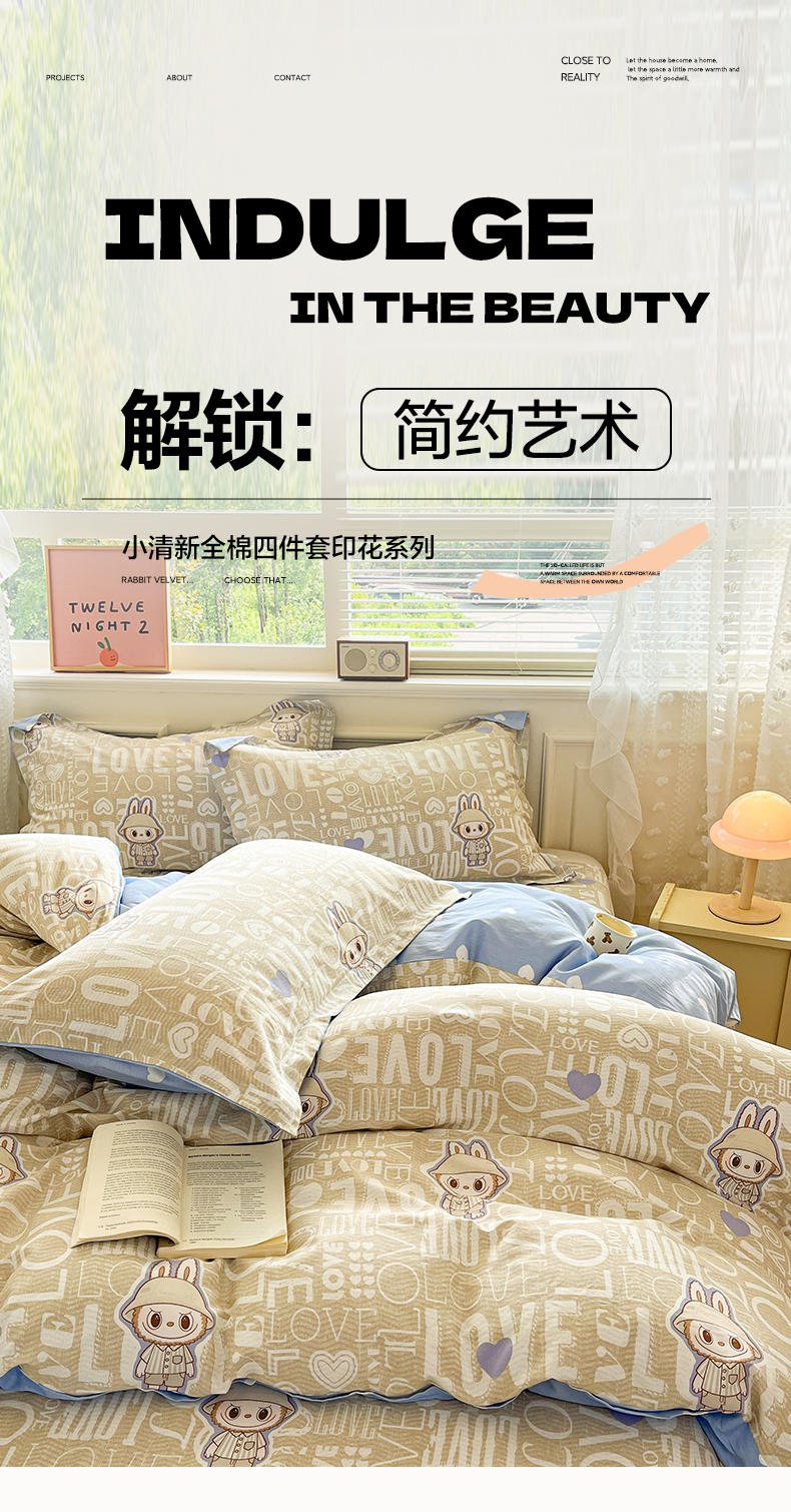 当前位置: 91家纺网 > 商品网购 > 床品套件 > 四件套 > 全棉普通四件套 > 花梦欣 2025新款全棉印花单品系列-四件套 拉布兔兔