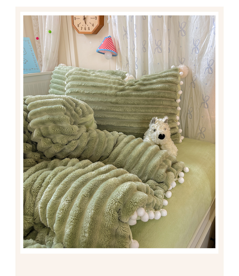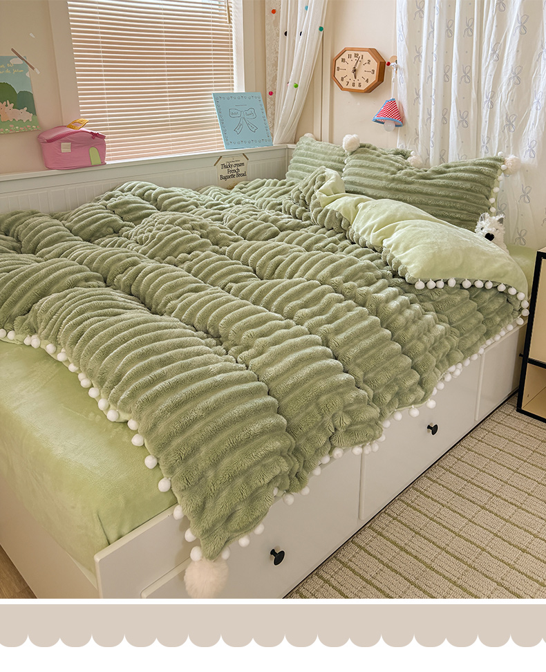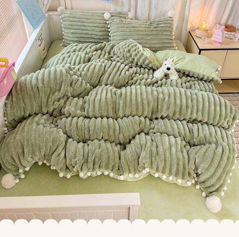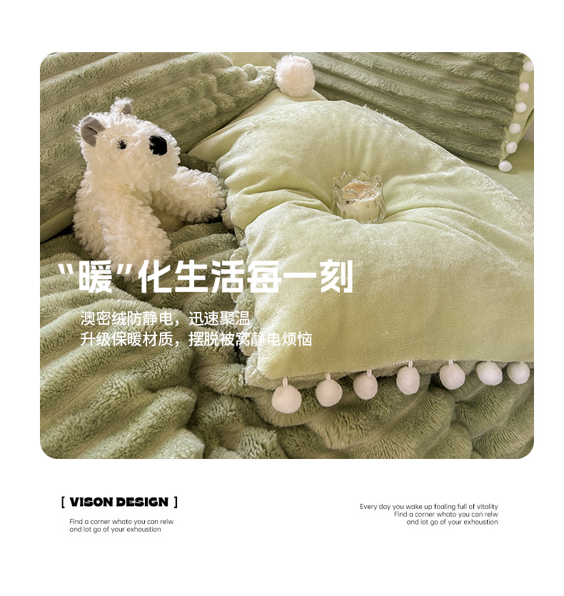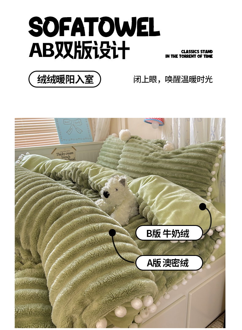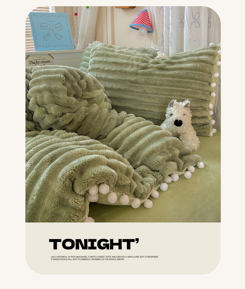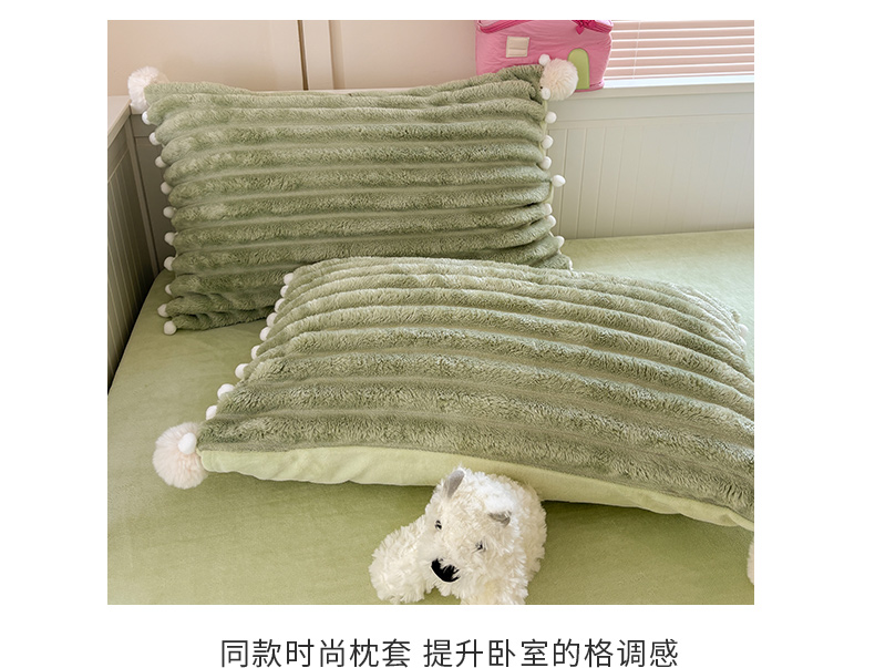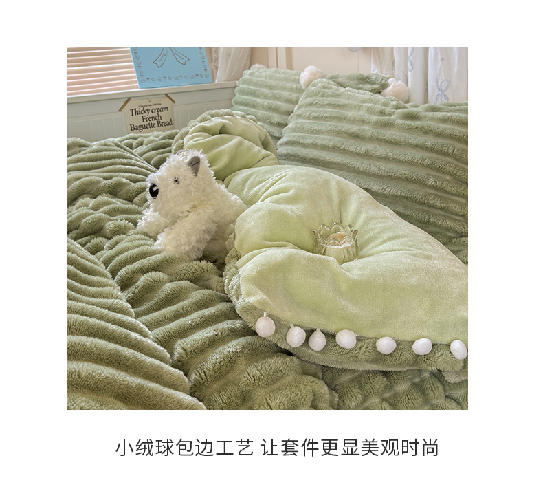 当前位置: 91家纺网 > 商品网购 > 床品套件 > 四件套 > 牛奶绒四件套 > 潮邦创意家居 2025新款宽条小球工艺款牛奶绒四件套-绒条织梦系列 绒条织梦-抹茶绿
