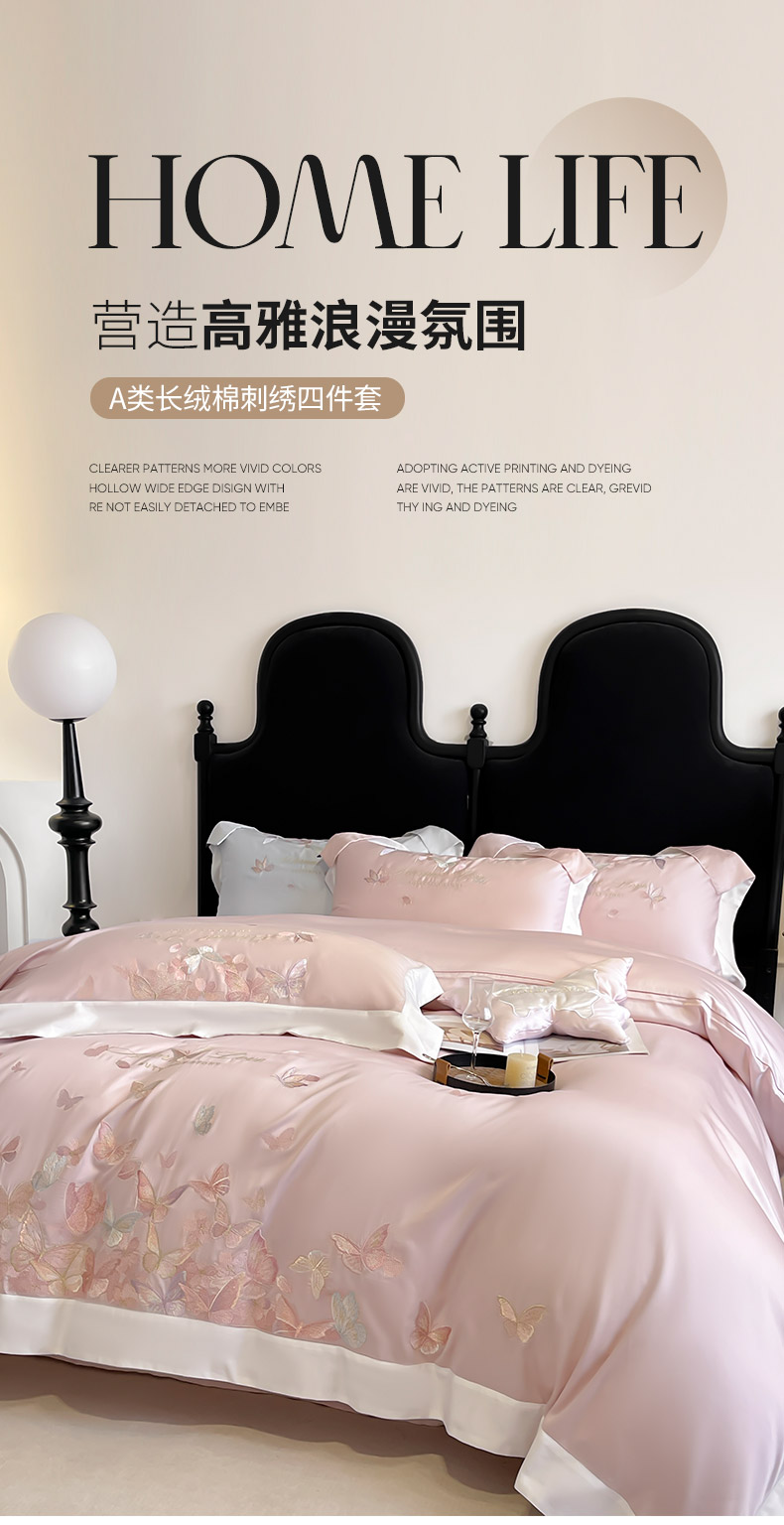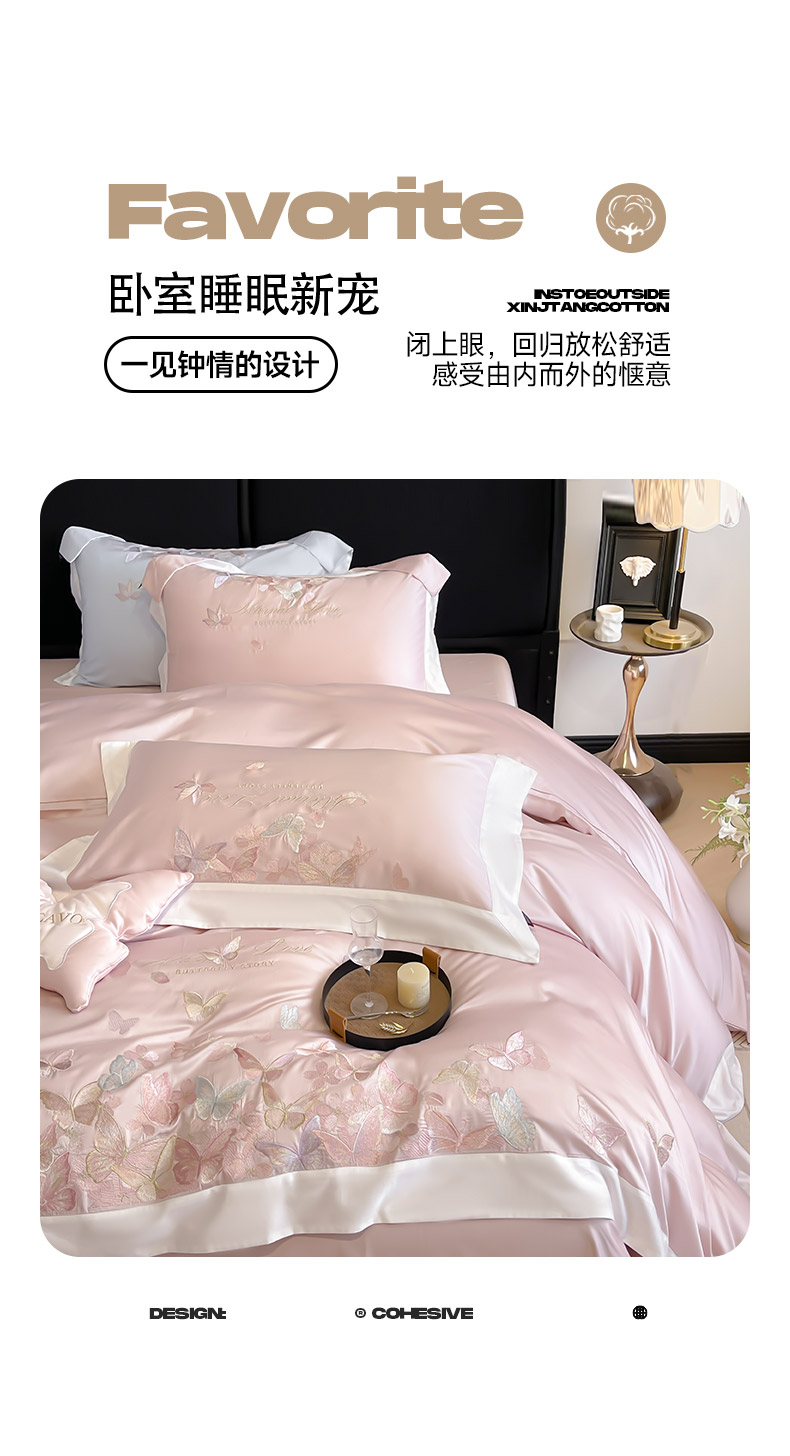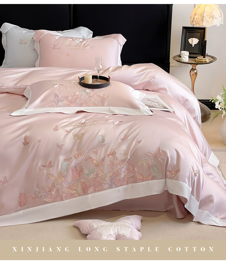 2025直播爆款A类贡缎长绒棉四件套纯棉全棉重工刺绣被套床单高端拼接床上用品 七彩蝶梦-落樱粉