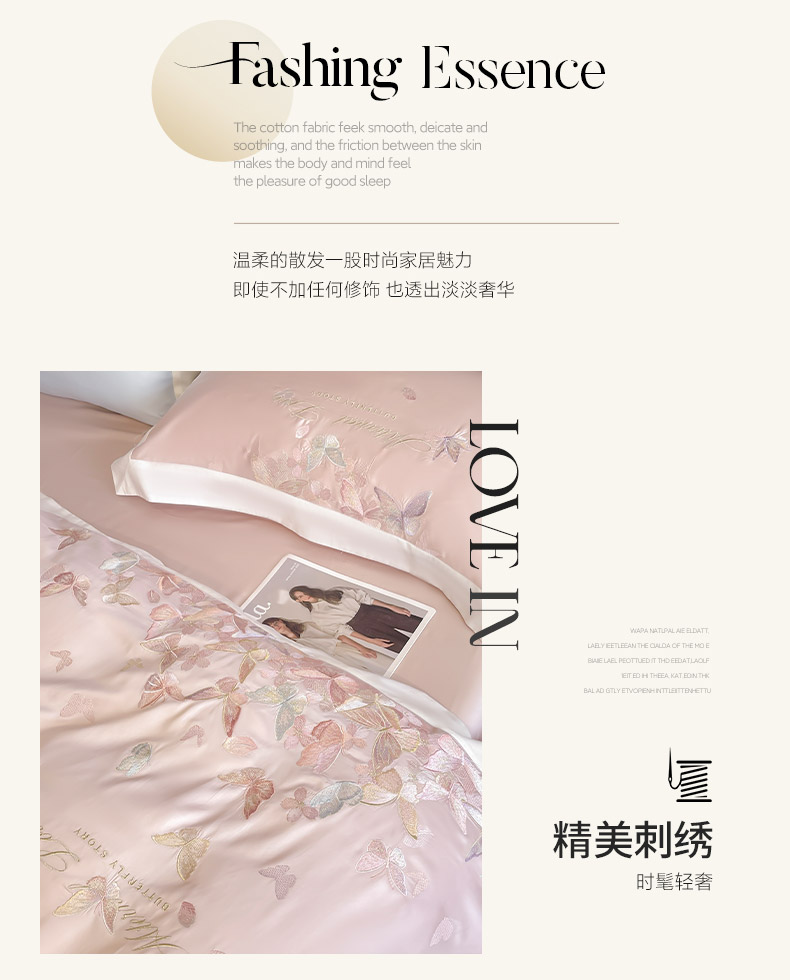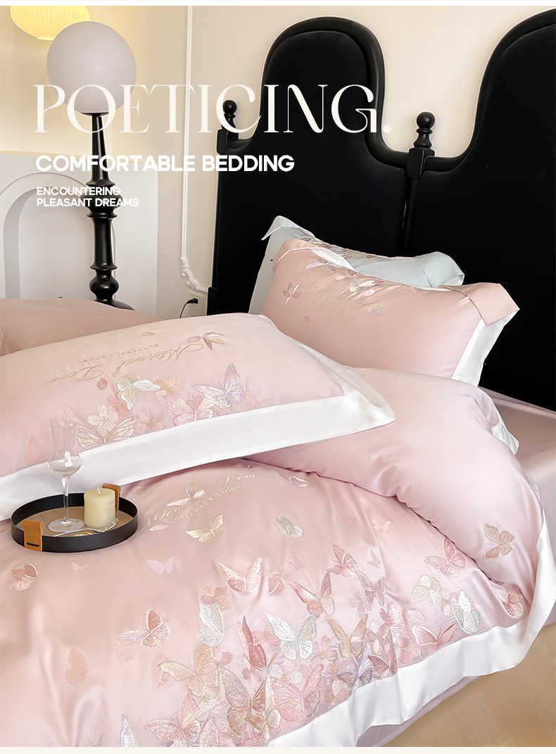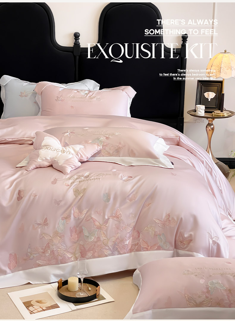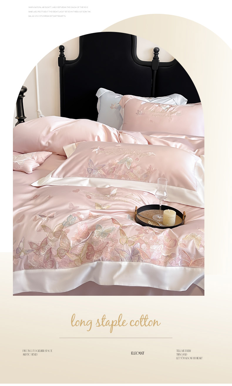 2025直播爆款A类贡缎长绒棉四件套纯棉全棉重工刺绣被套床单高端拼接床上用品 七彩蝶梦-落樱粉