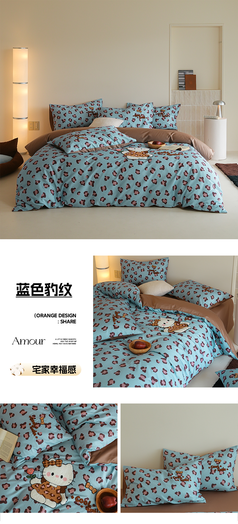 (总)雅居纺家纺 2026新款50长绒棉豹纹绣花四件套,灰色豹纹,咖啡豹纹,蓝色豹纹