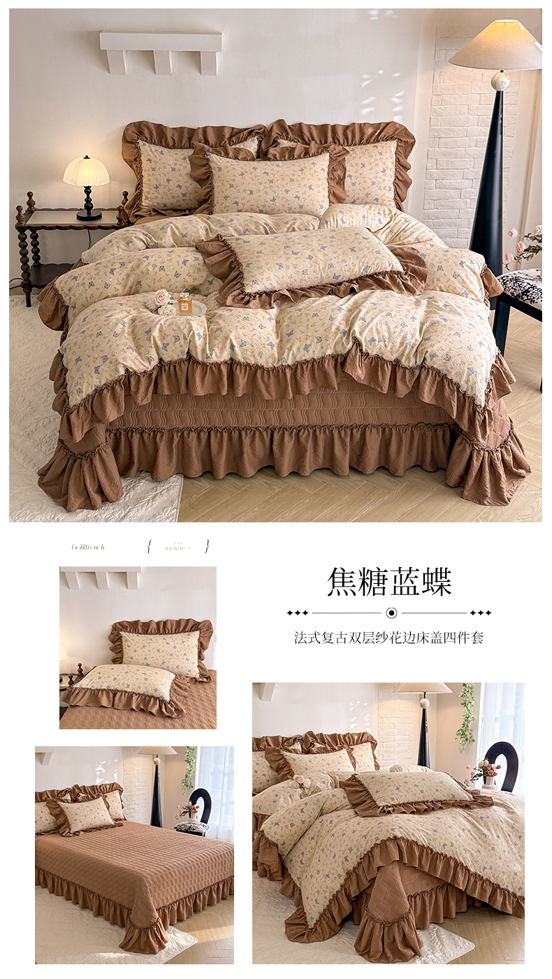 当前位置: 91家纺网 > 商品网购 > 床品套件 > 四件套 > 双层纱四件套 > 贝凯瑞 2026新款双层纱木棉水洗棉法式复古花边床盖单件三件四件套-焦糖系列 焦糖蝴蝶结