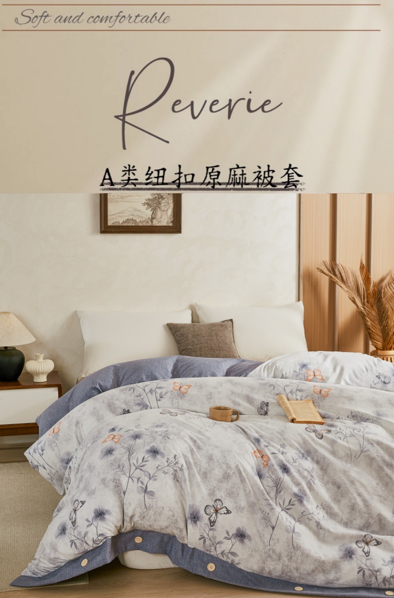 商品名称:圣比熊 2026新款A类原麻纽扣加厚被套床单宿舍双人床仿亚麻被子 花与蝶