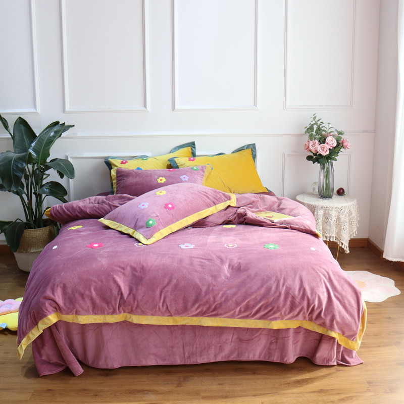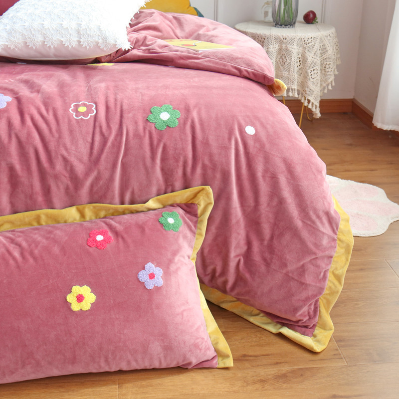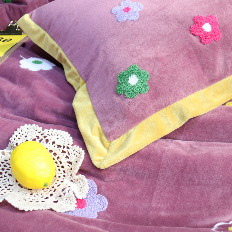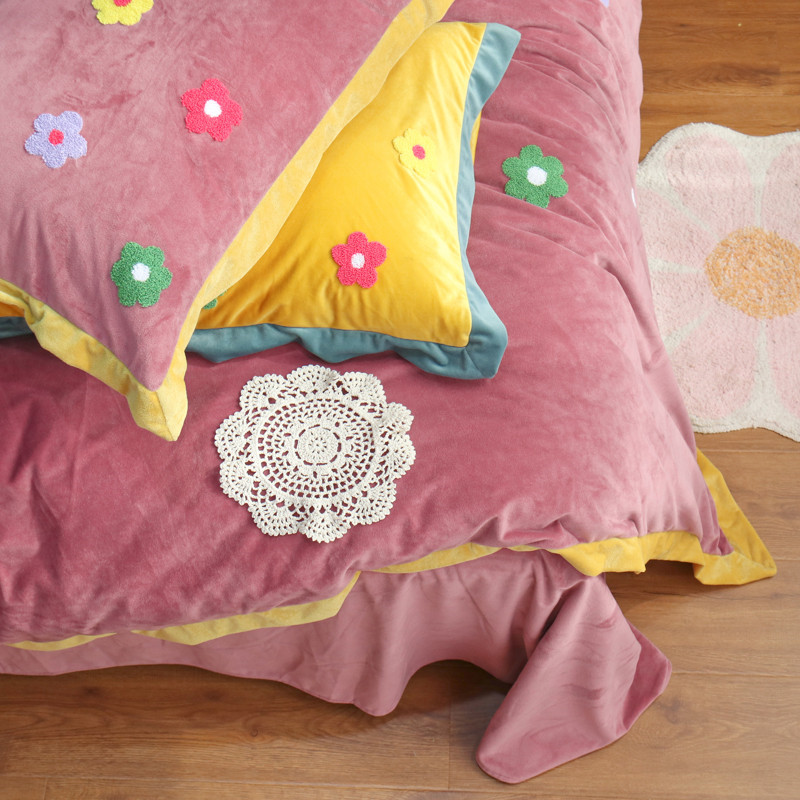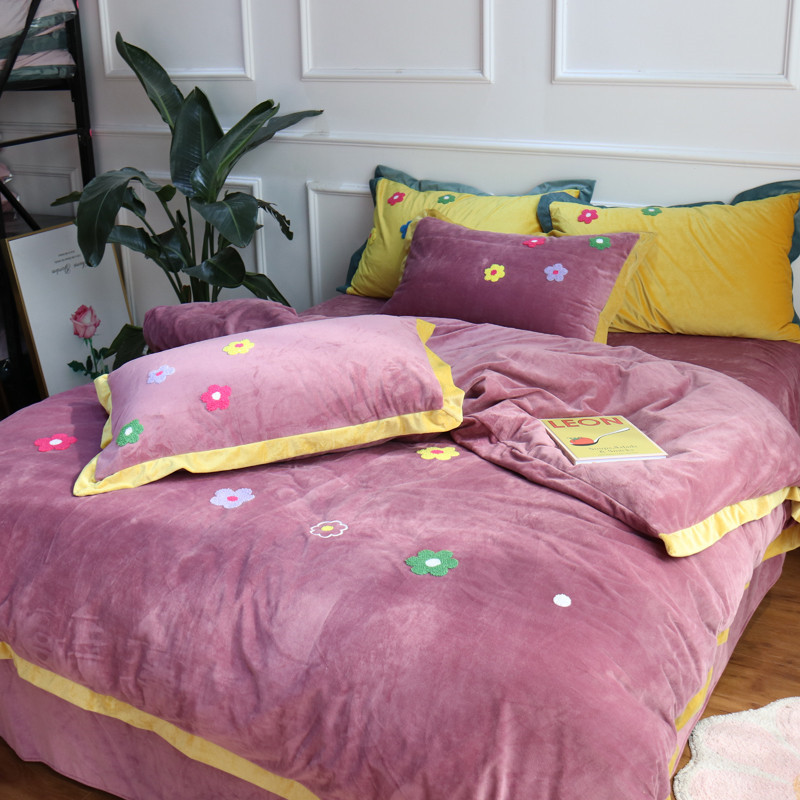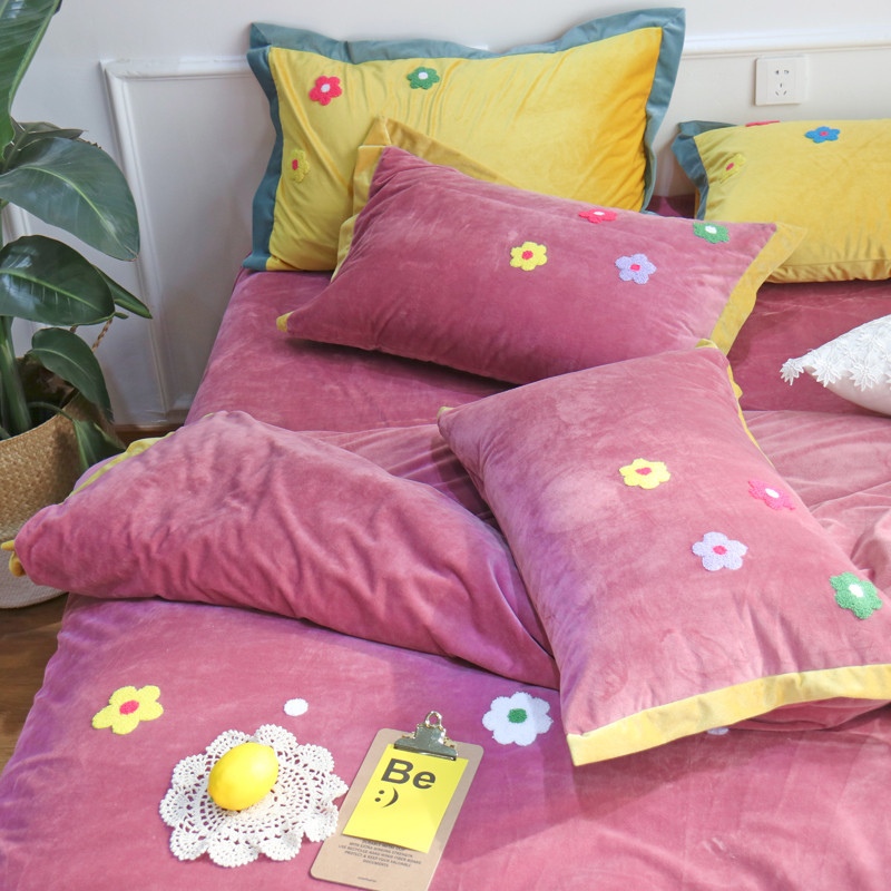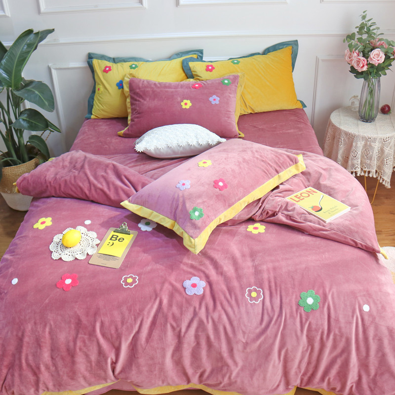 润缦 2019 ins泫雅风宝宝绒四件套牛奶绒四件套 可爱花朵-豆沙色