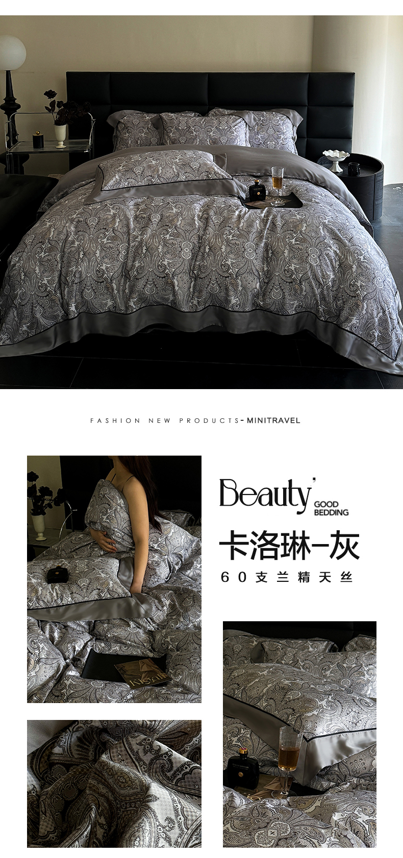 商品名称:娇逸家居 2025新款60支兰精天丝数码印花宽边四件套 卡洛琳-灰