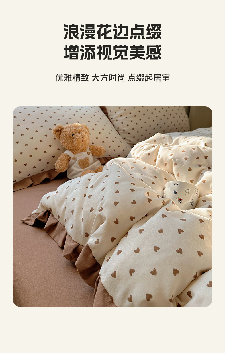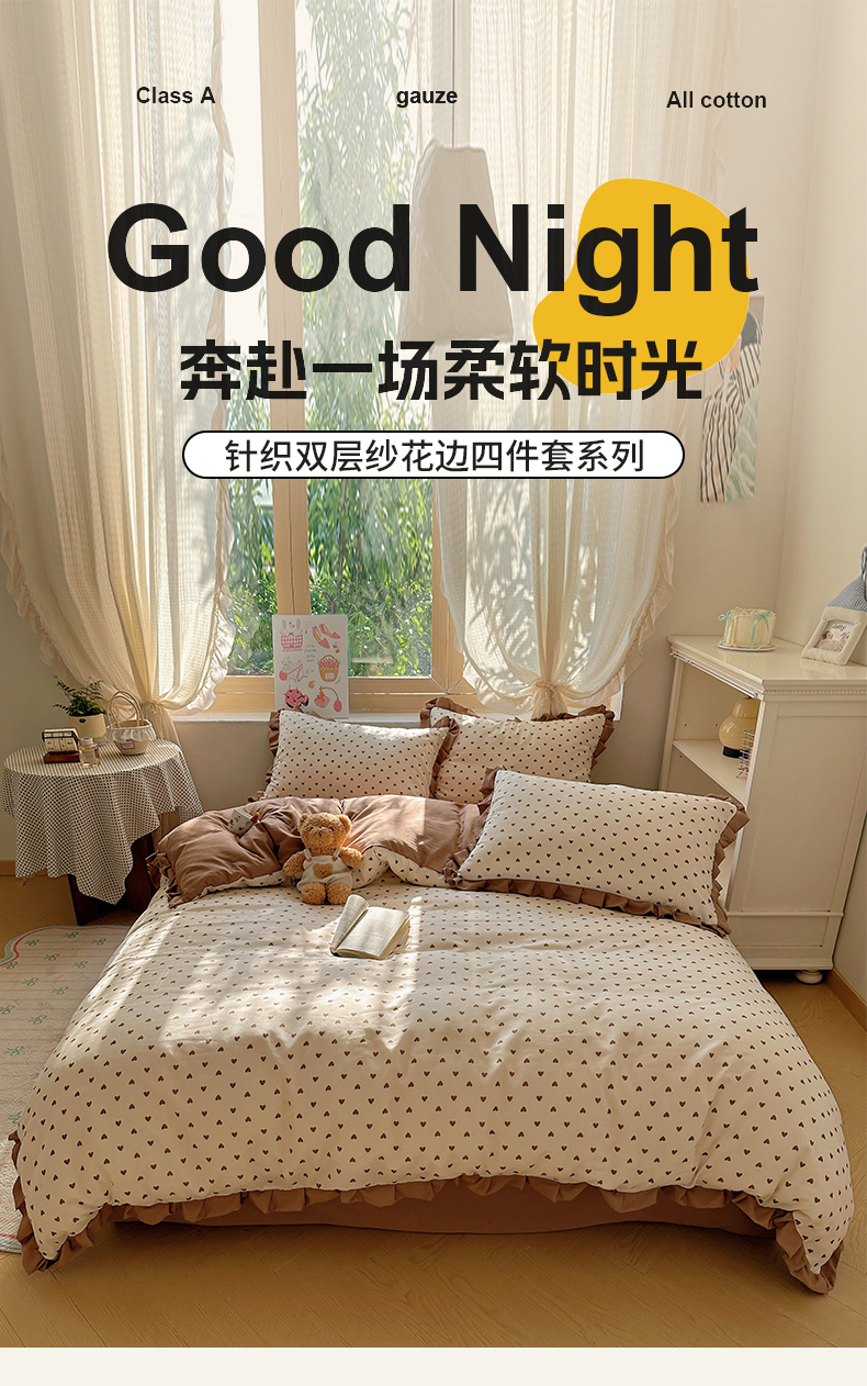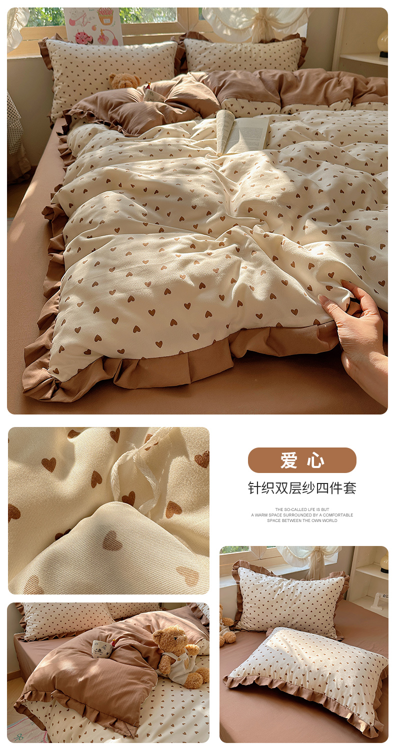 当前位置: 91家纺网 > 商品网购 > 床品套件 > 四件套 > 双层纱四件套 > 韩巢家纺 2025新款针织双层纱花边款被套直播热销款四件套学生宿舍床单三件套-(提供卖家秀) 爱心