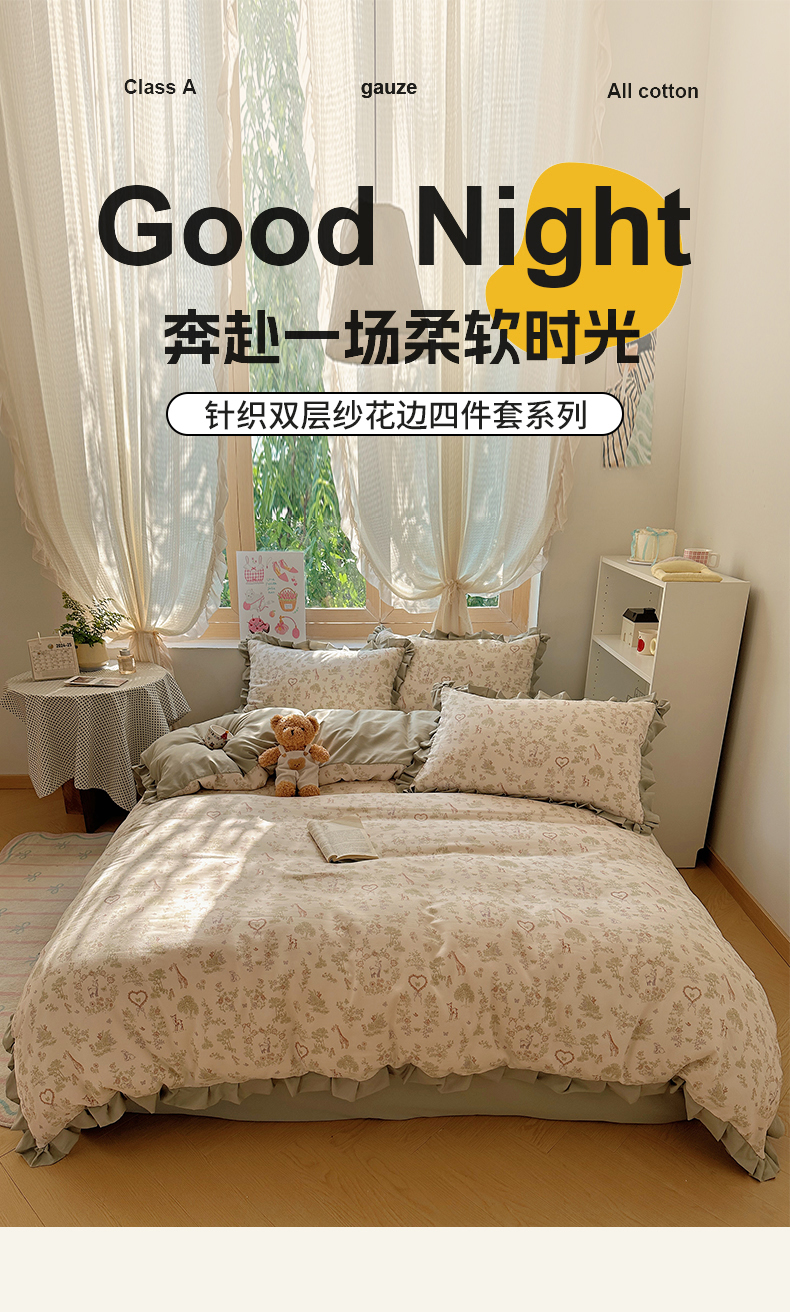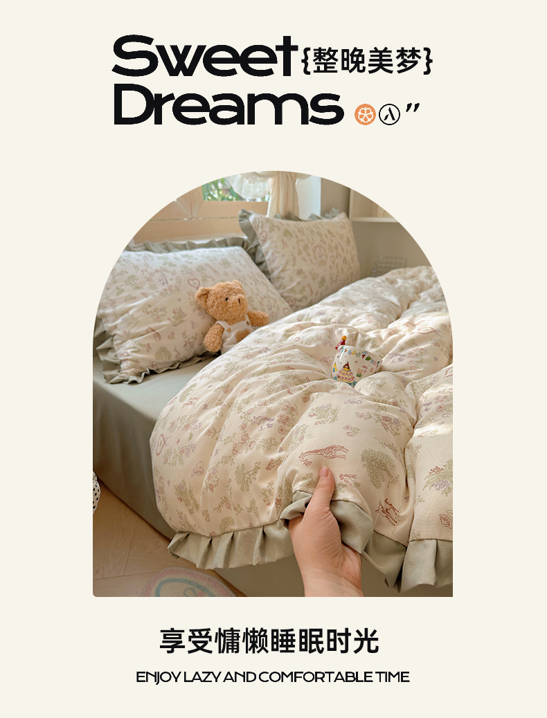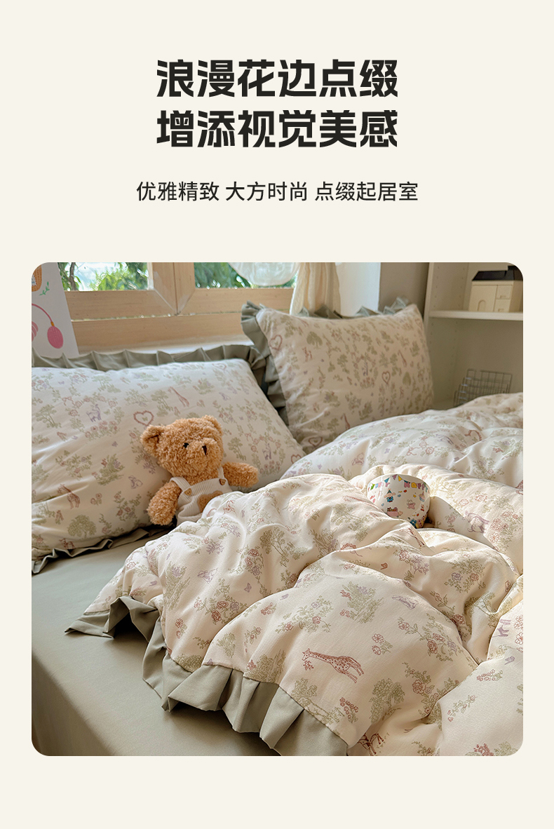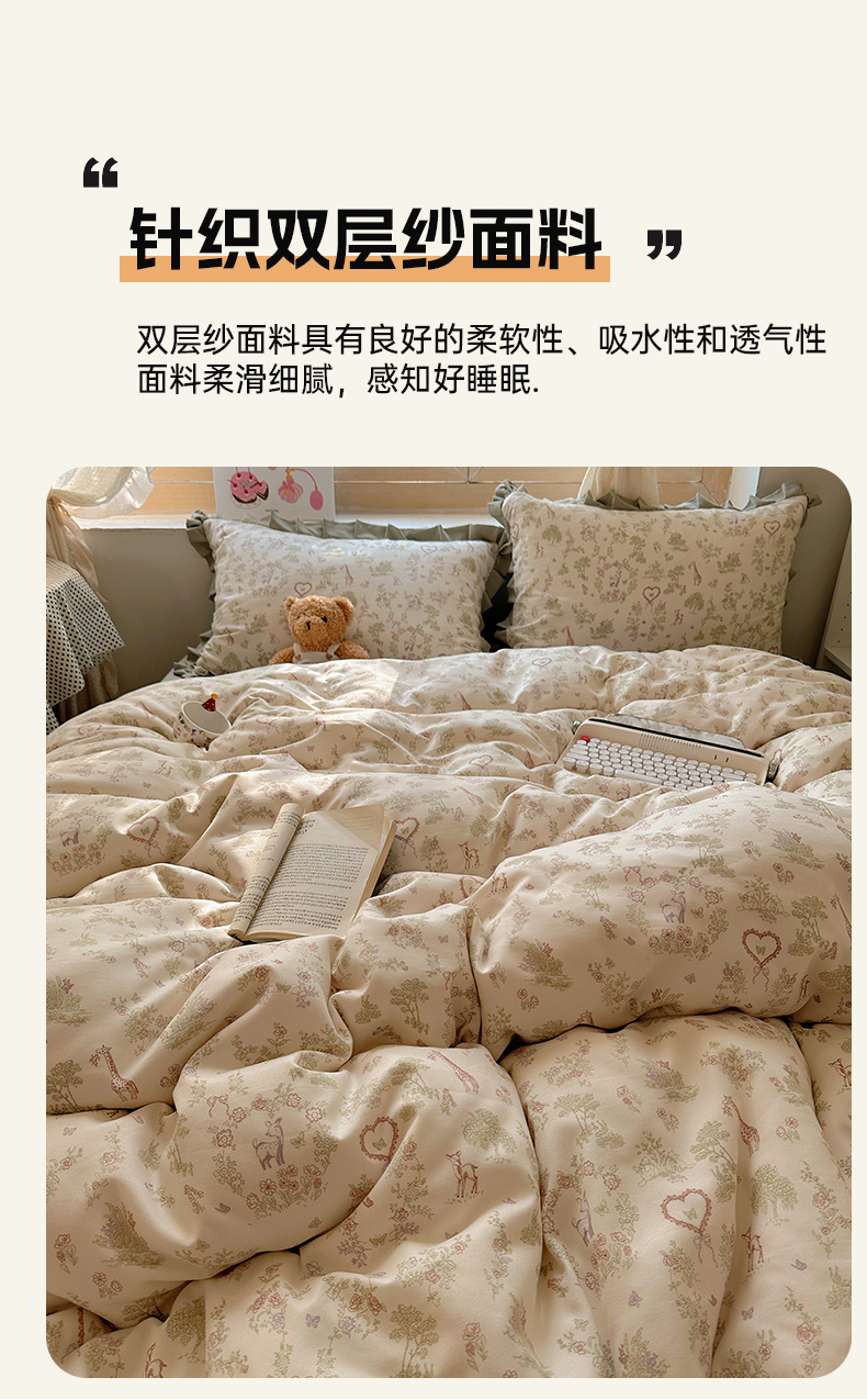 当前位置: 91家纺网 > 商品网购 > 床品套件 > 四件套 > 双层纱四件套 > 韩巢家纺 2025新款针织双层纱花边款被套直播热销款四件套学生宿舍床单三件套-(提供卖家秀) 魔法森林