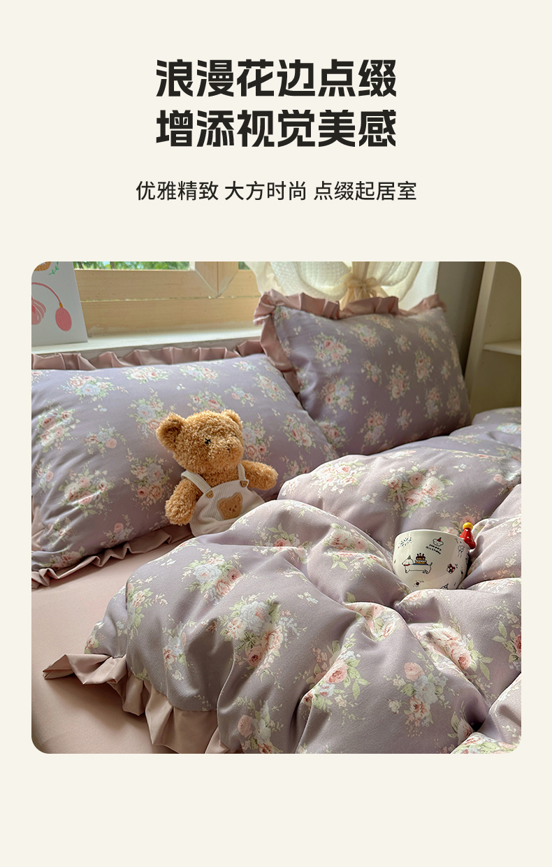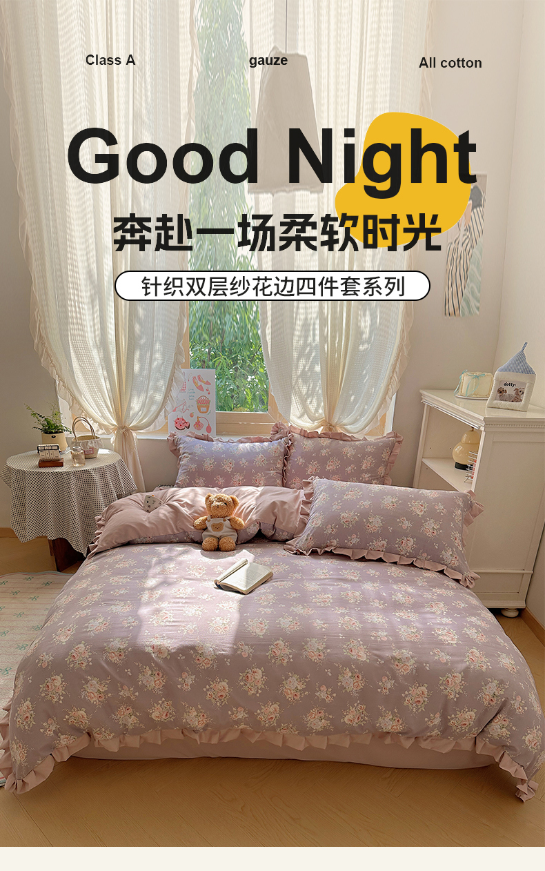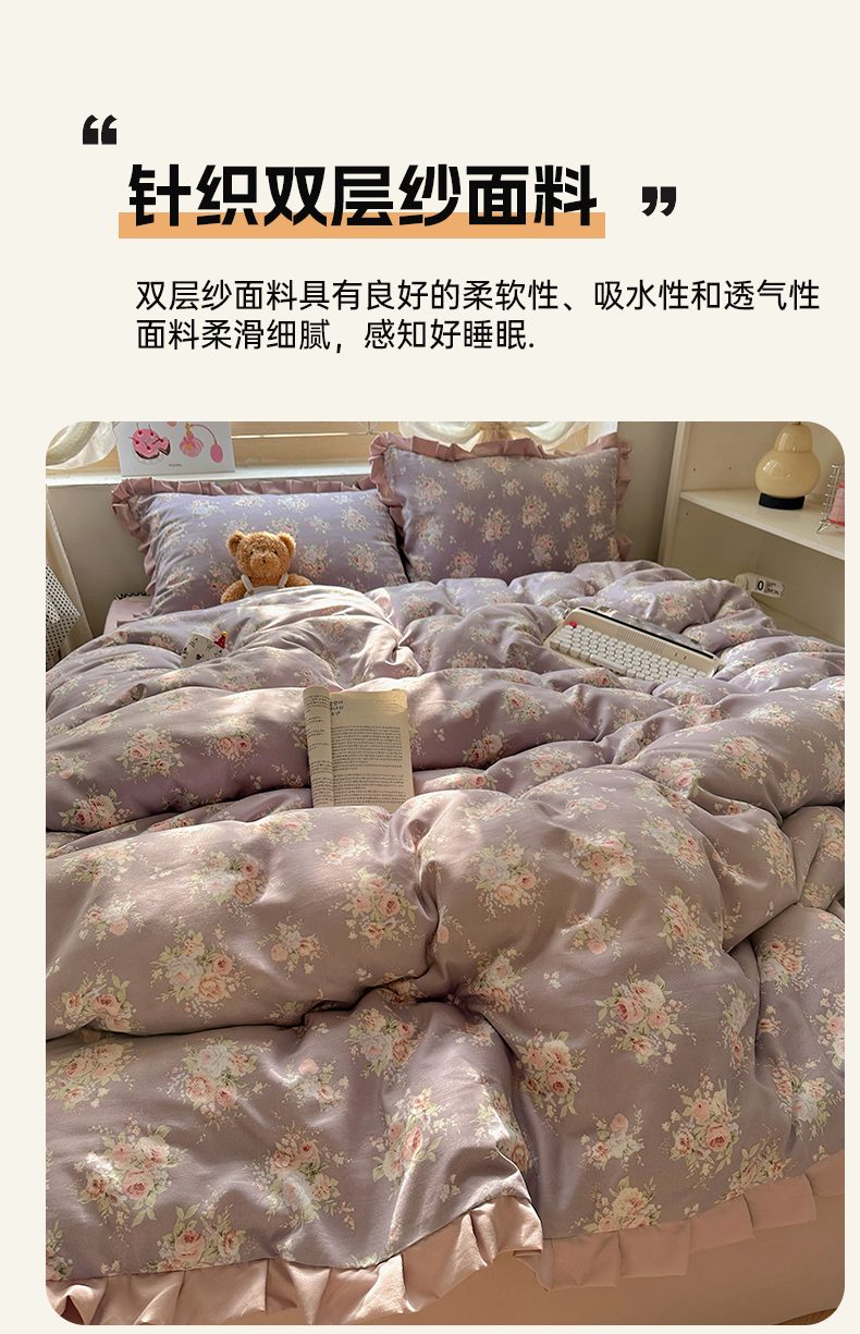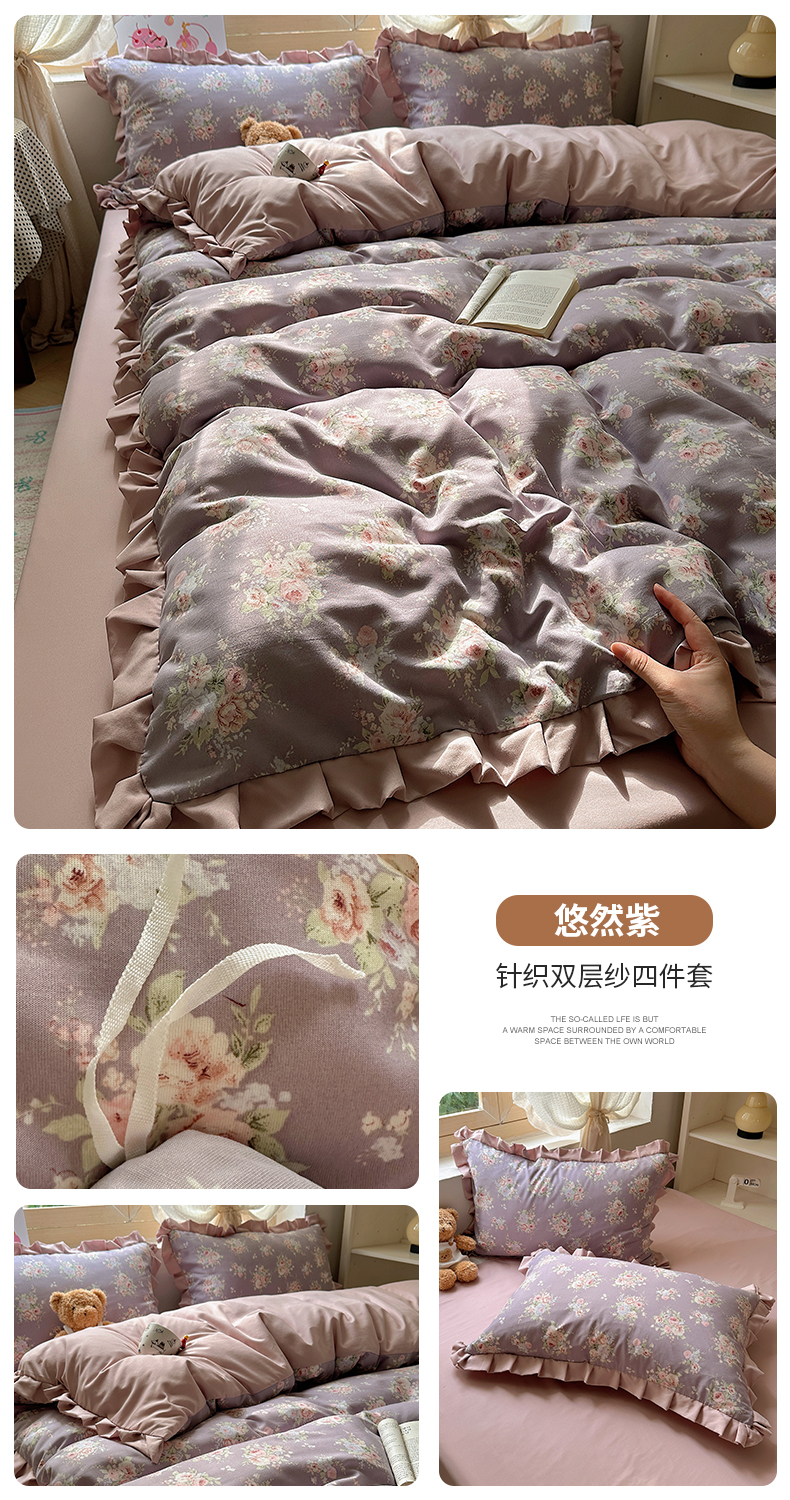 当前位置: 91家纺网 > 商品网购 > 床品套件 > 四件套 > 双层纱四件套 > 韩巢家纺 2025新款针织双层纱花边款被套直播热销款四件套学生宿舍床单三件套-(提供卖家秀) 悠然紫