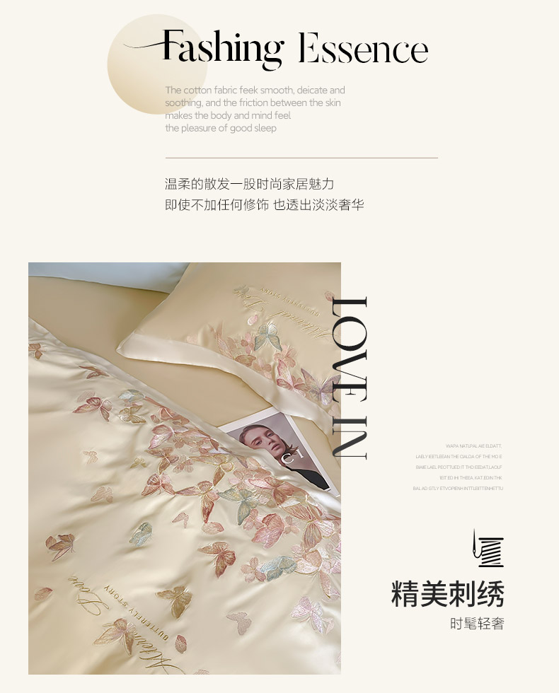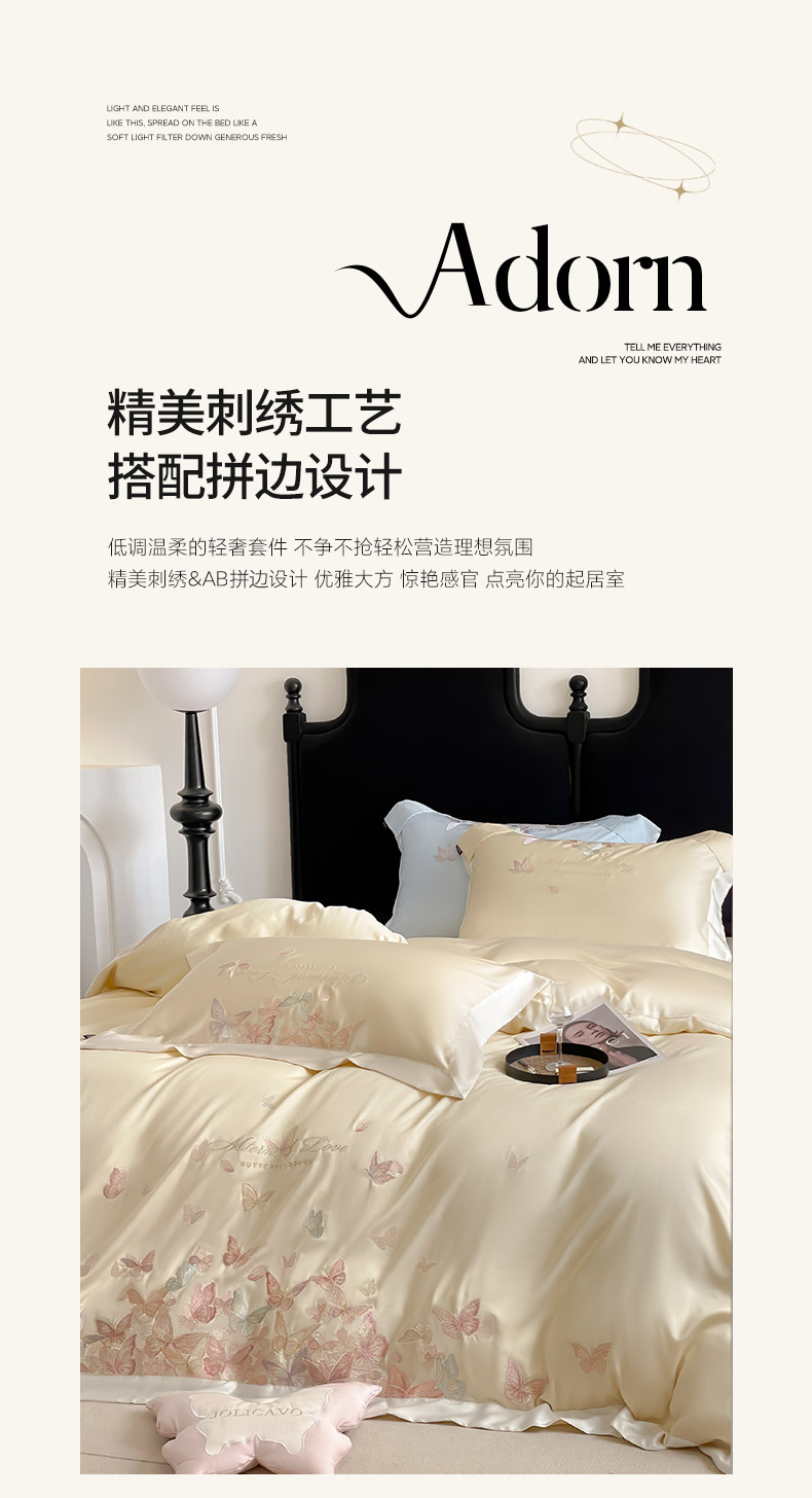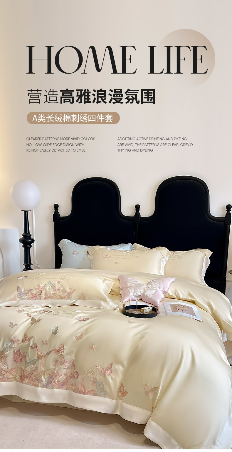 商品名称: 2025直播爆款A类贡缎长绒棉四件套纯棉全棉重工刺绣被套床单高端拼接床上用品 七彩蝶梦-奶芙黄
