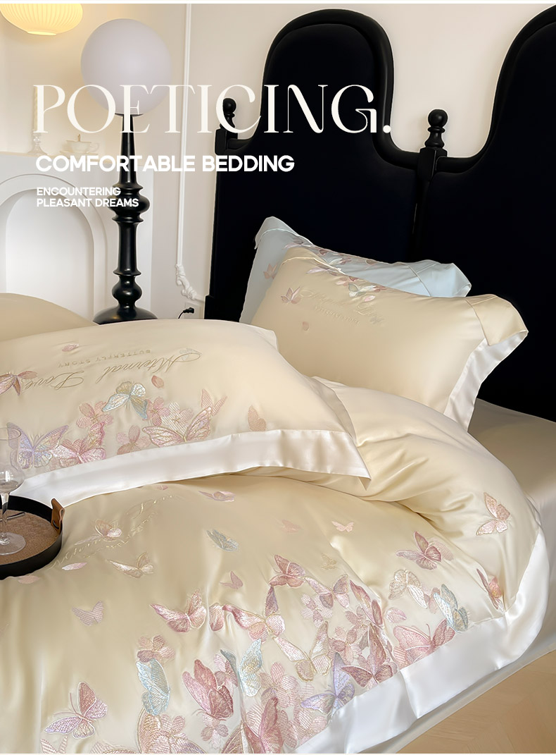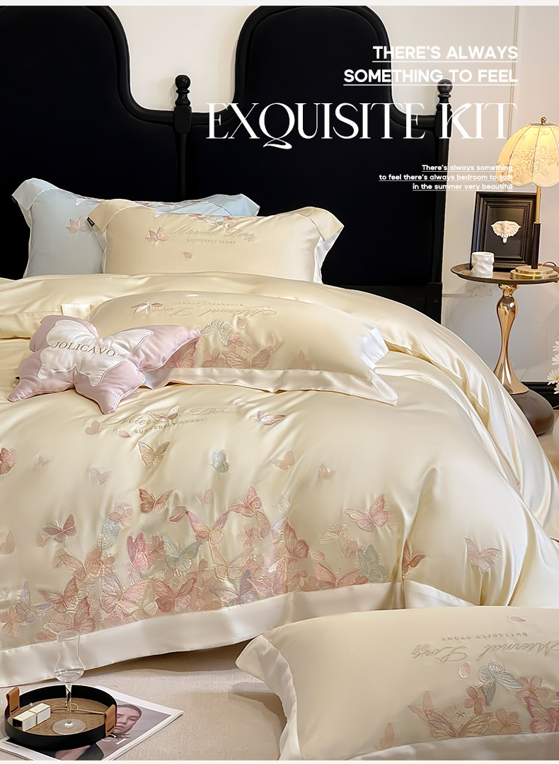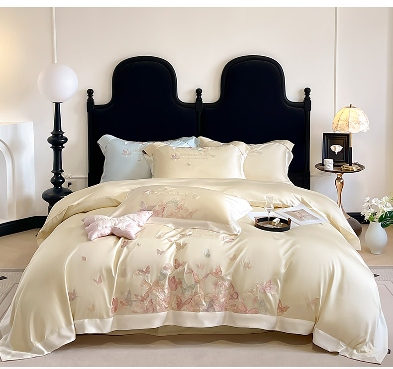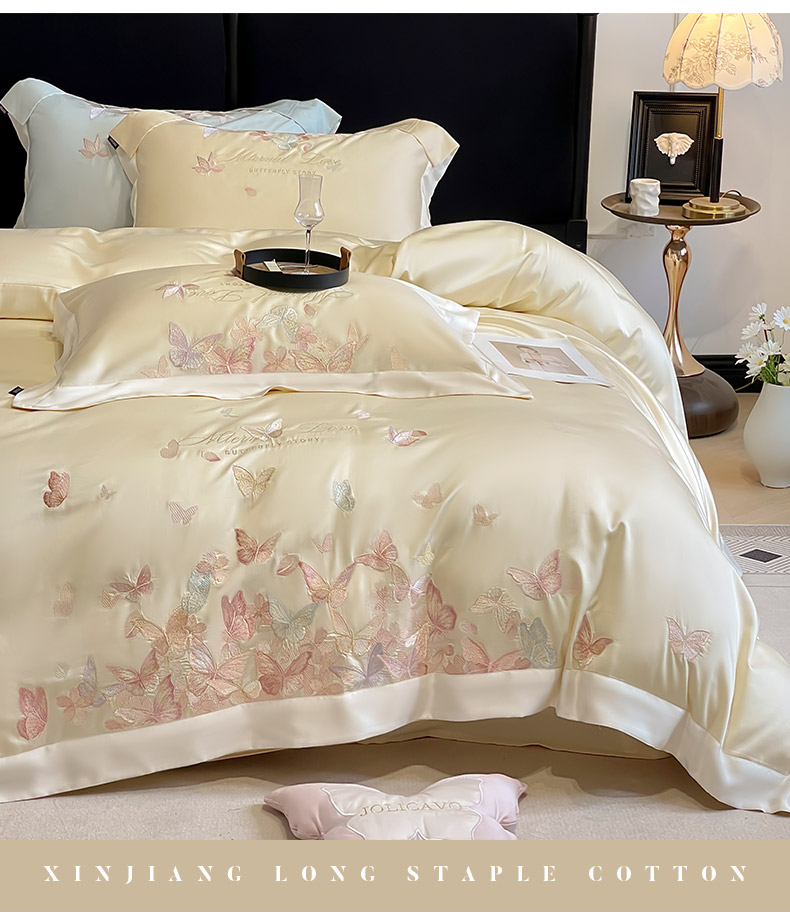 2025直播爆款A类贡缎长绒棉四件套纯棉全棉重工刺绣被套床单高端拼接床上用品 七彩蝶梦-奶芙黄