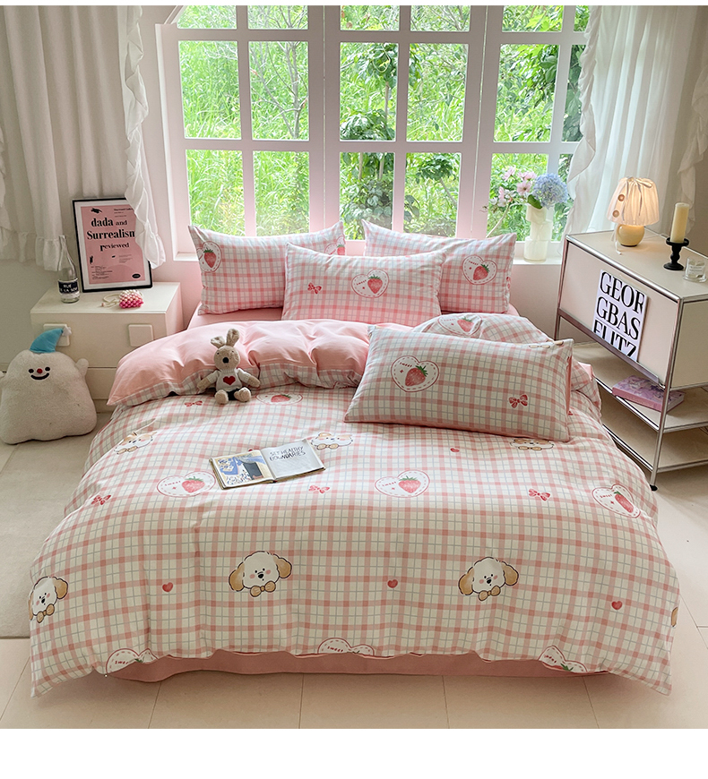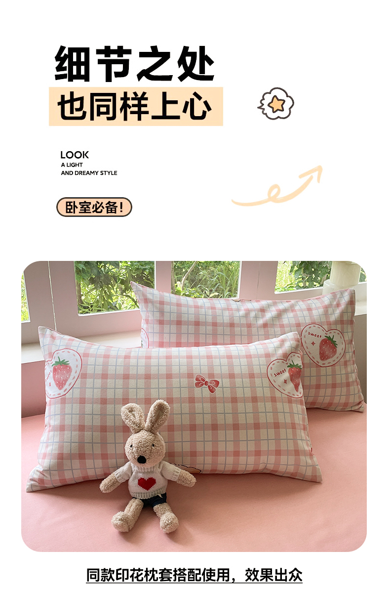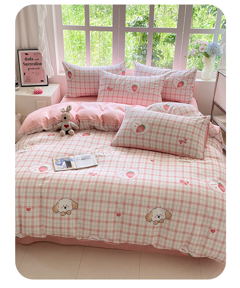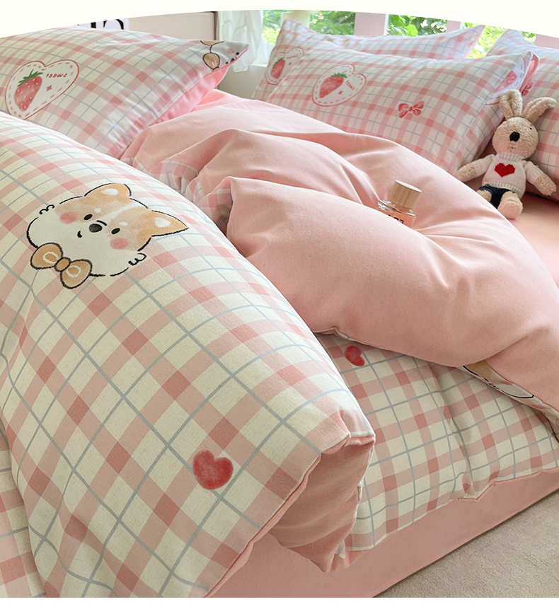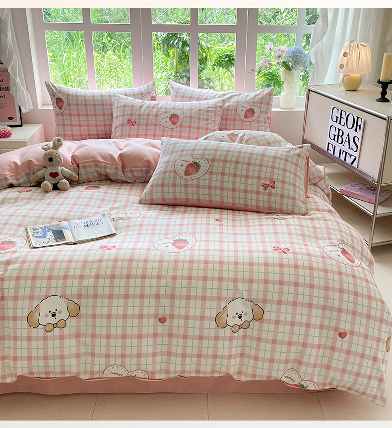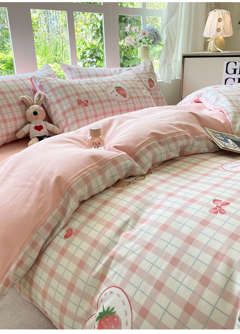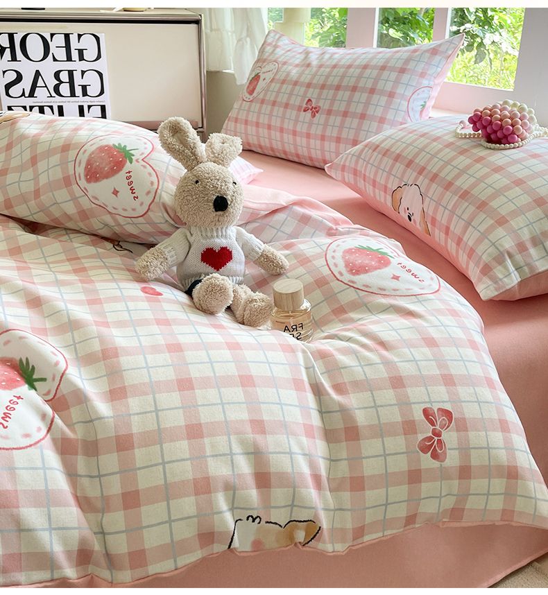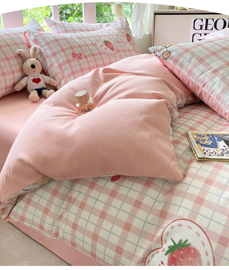 本制 2025秋冬新款全棉混纺磨毛印花四件套 草莓泡芙-杨妃粉