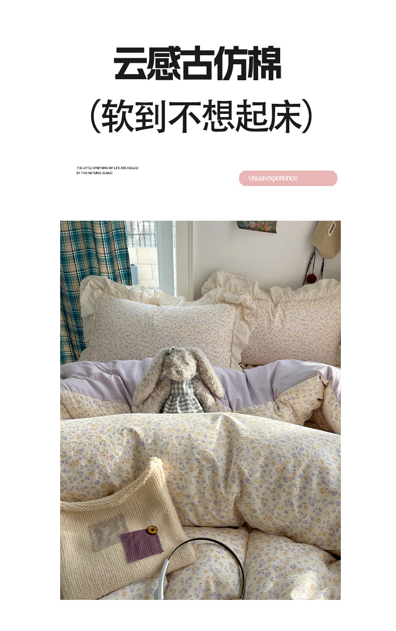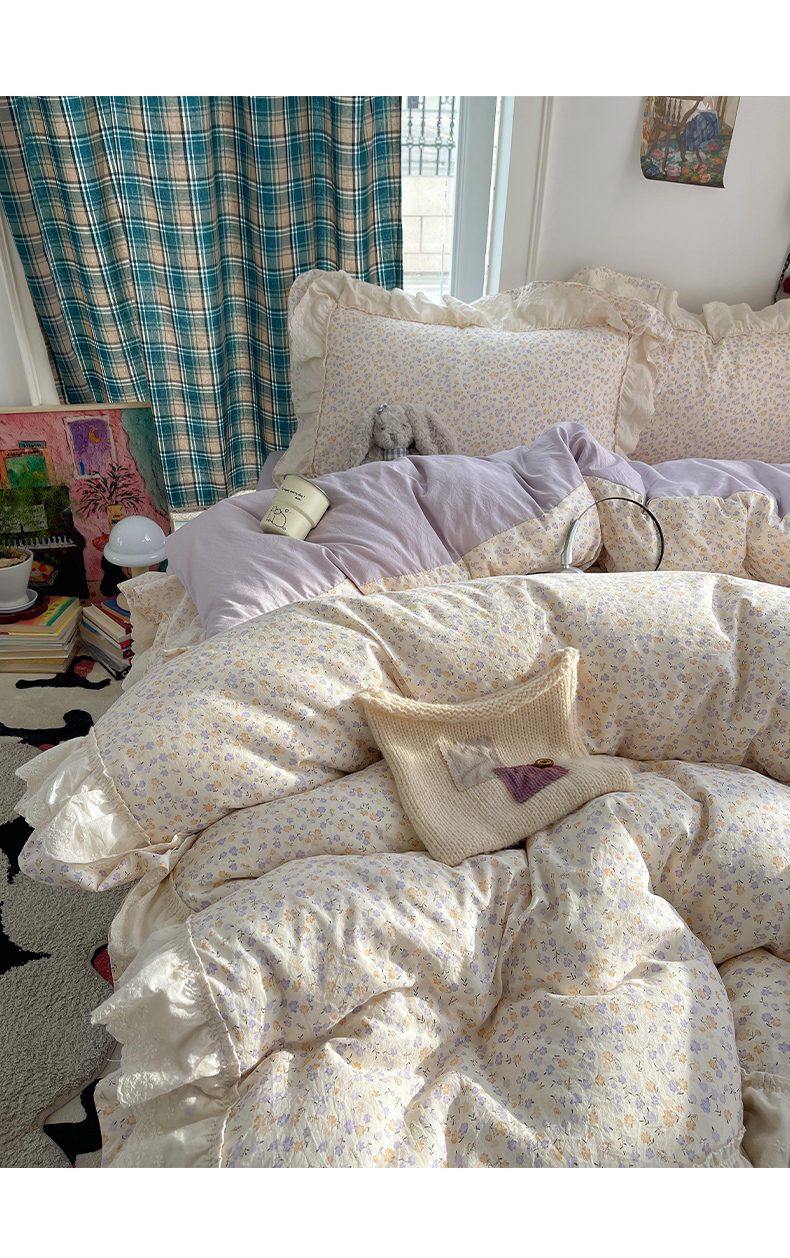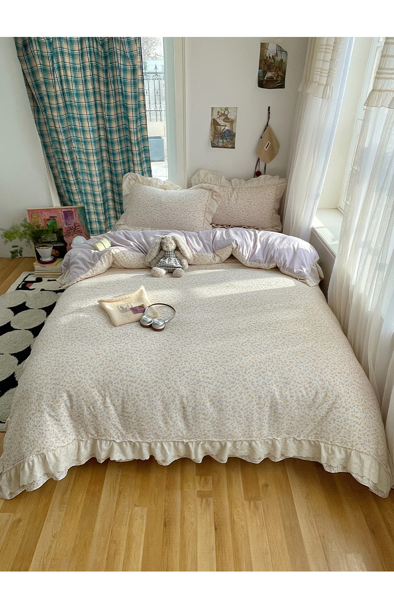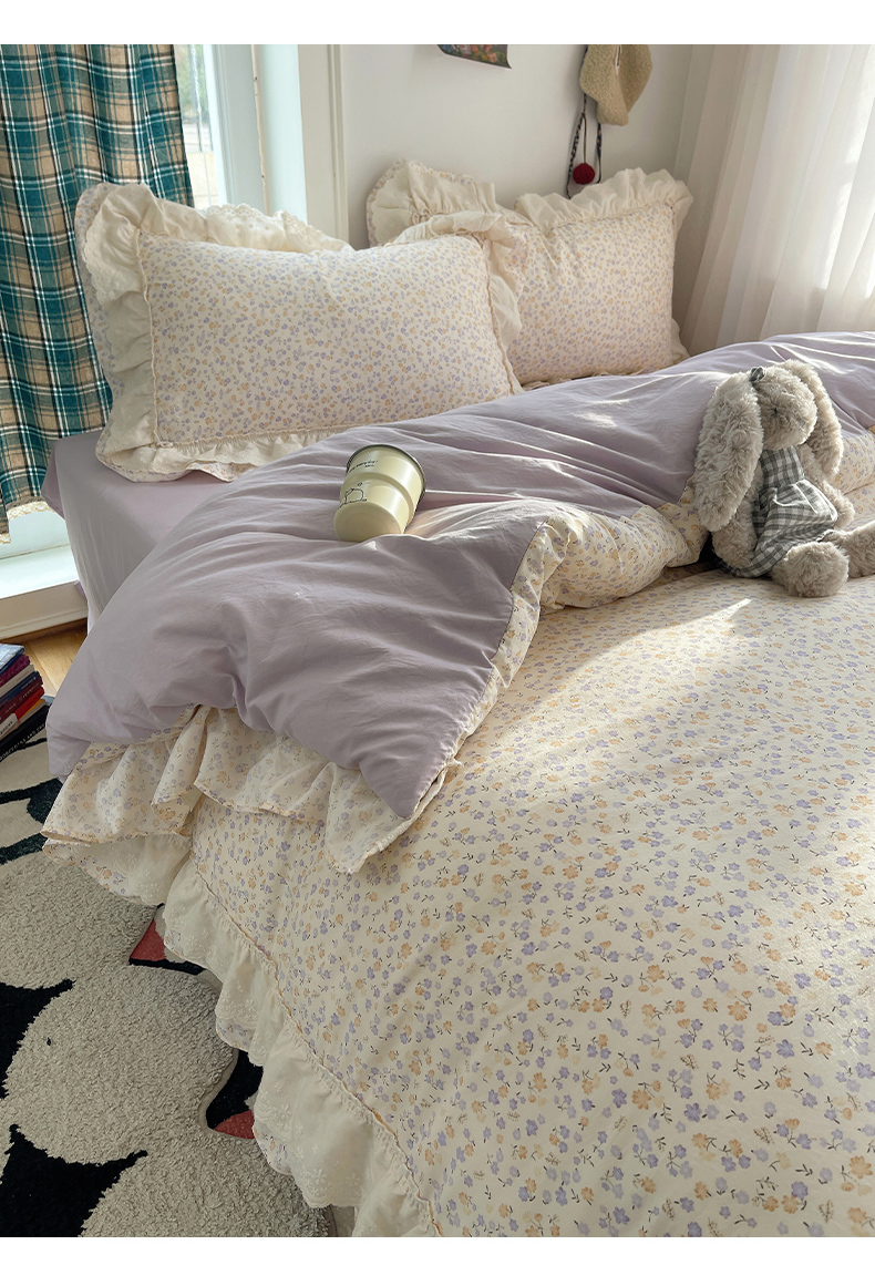 当前位置: 91家纺网 > 商品网购 > 床品套件 > 四件套 > 其它四件套 > 韩都家居 2026春夏新款古法仿棉蕾丝花边四件套 芋泥碎花