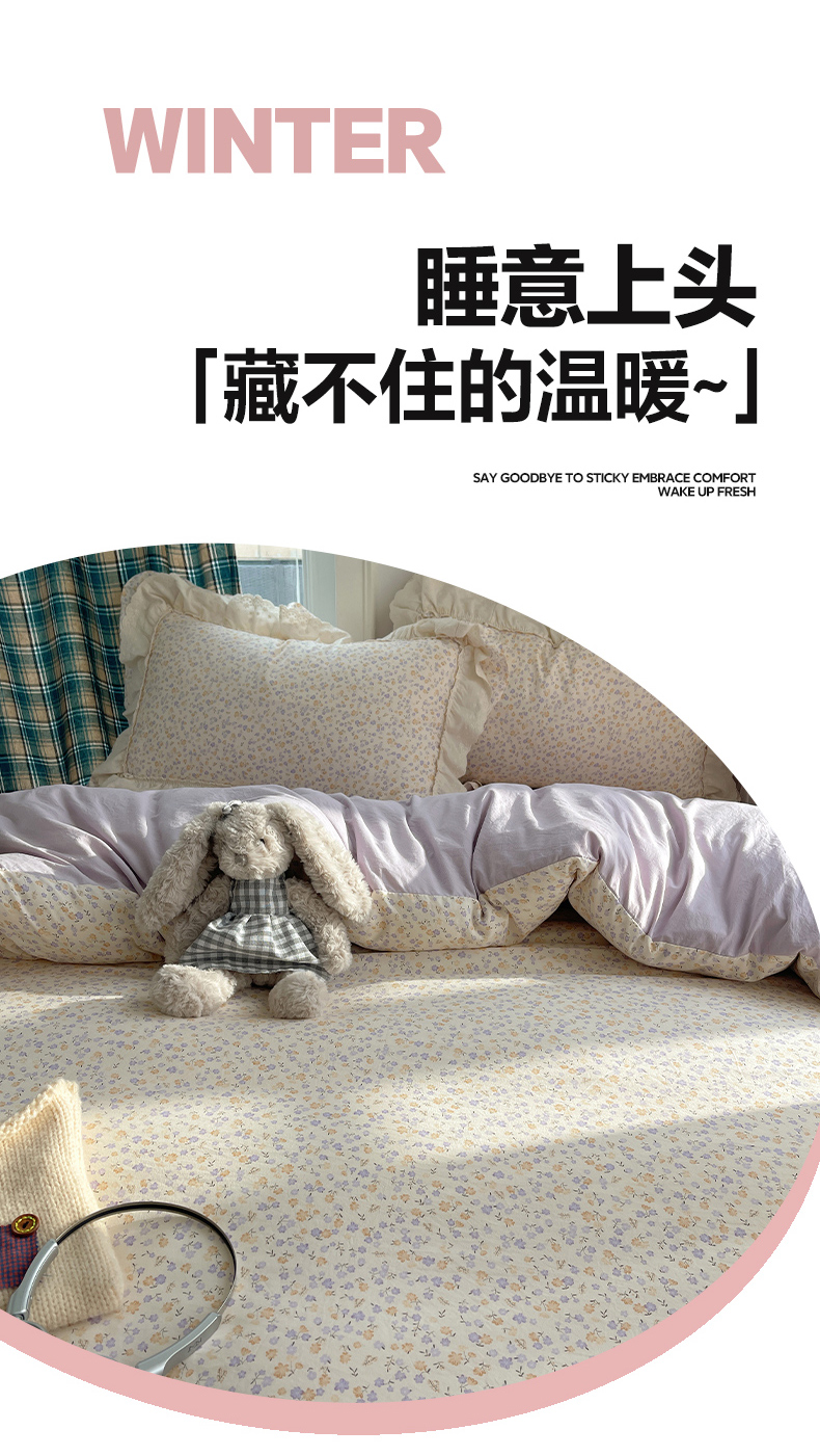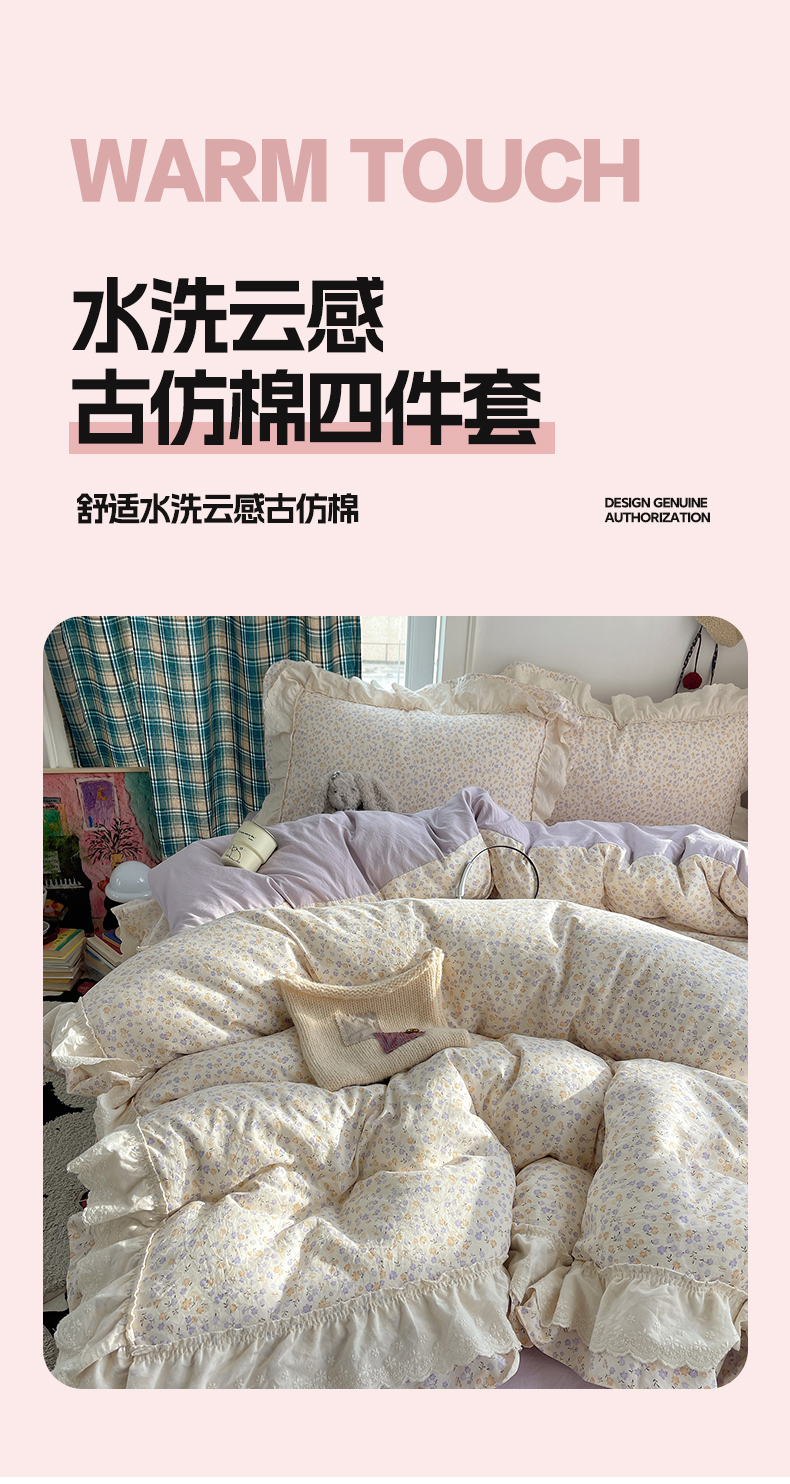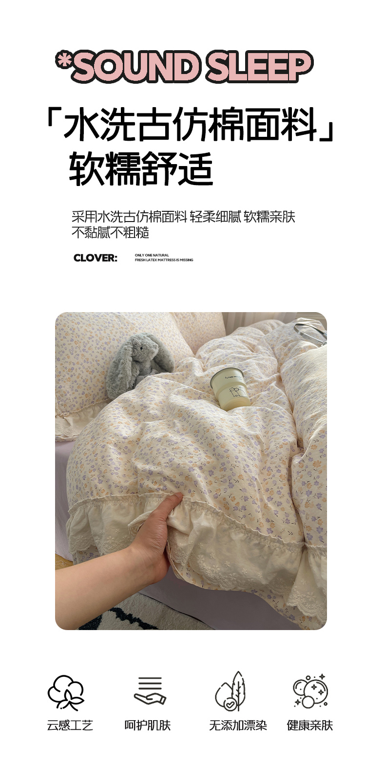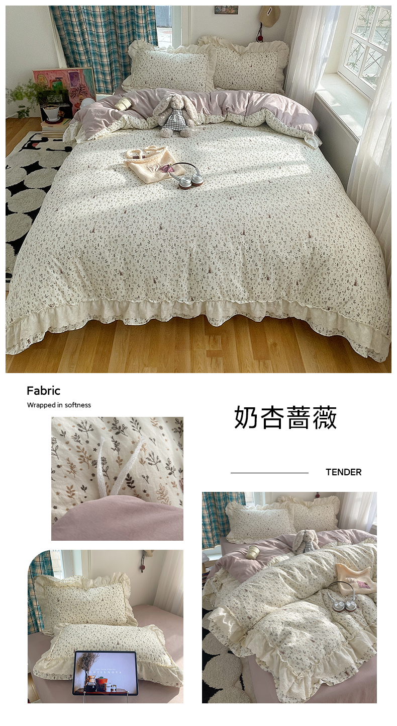 当前位置: 91家纺网 > 商品网购 > 床品套件 > 四件套 > 其它四件套 > 韩都家居 2026春夏新款古法仿棉蕾丝花边四件套 芋泥碎花