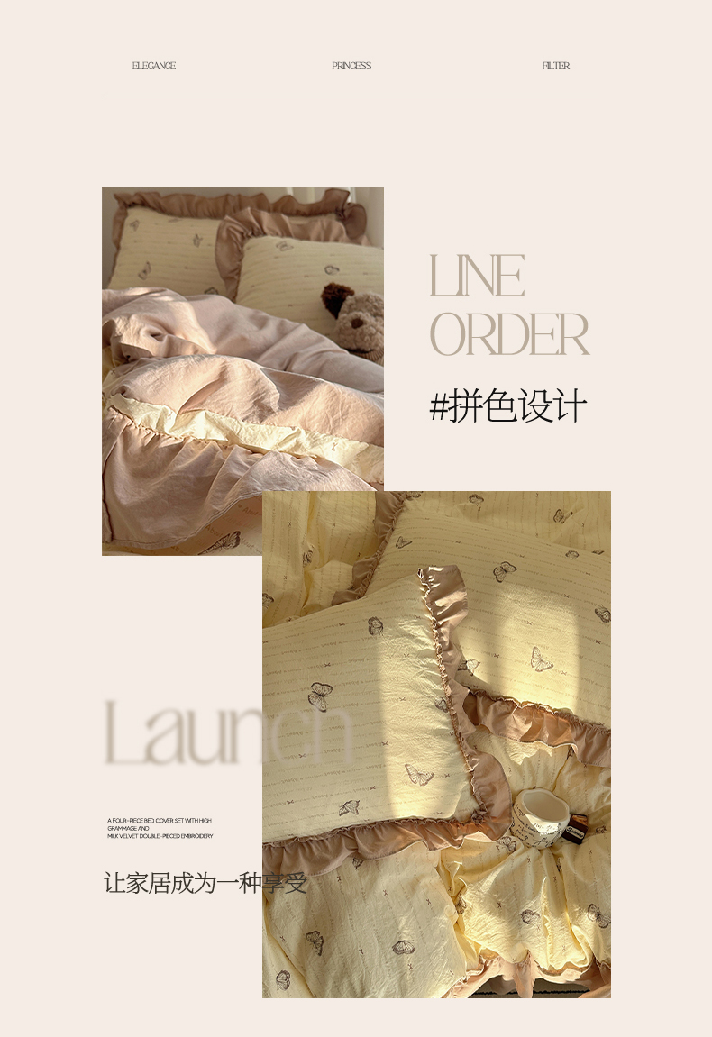 (总)韩都家居 2023新款公主风花边双拼四件套,粉玉奶黄,粉玉浅紫,奶油黄,奶油青绿,青绿奶黄,天蓝浅粉