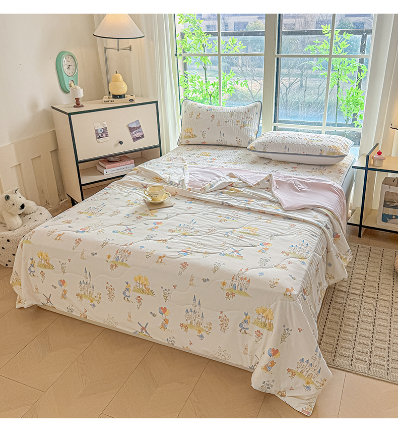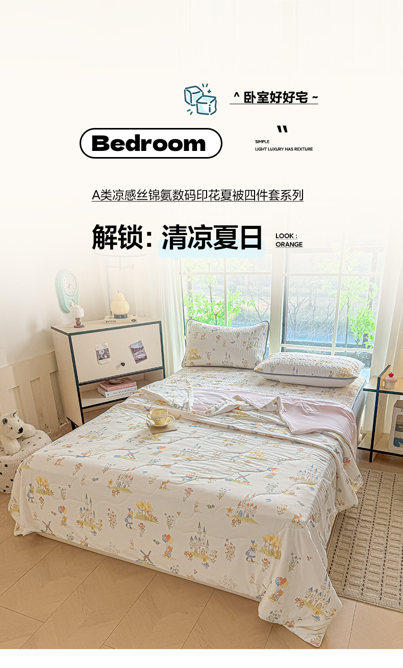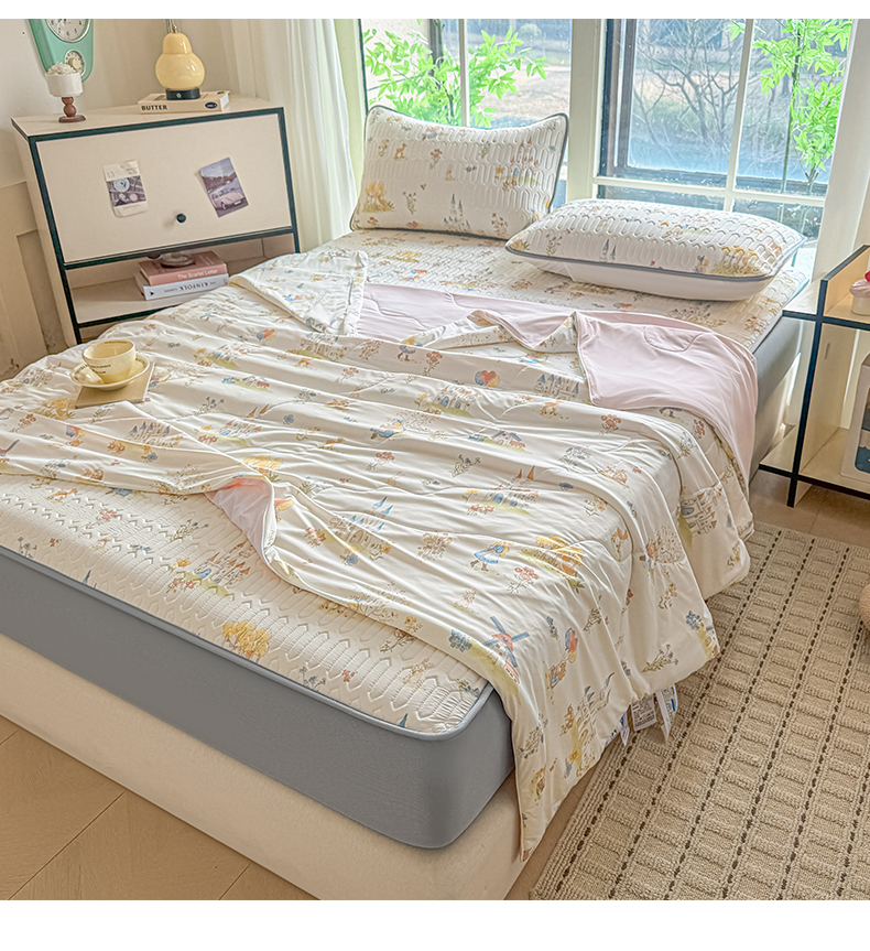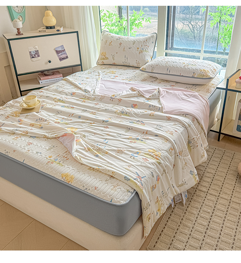 当前位置: 91家纺网 > 商品网购 > 床品套件 > 四件套 > 夏被四件套 > 莱登卡奴 2026新款新款A类凉感丝锦氨数码印花夏被四件套 浅梦田园