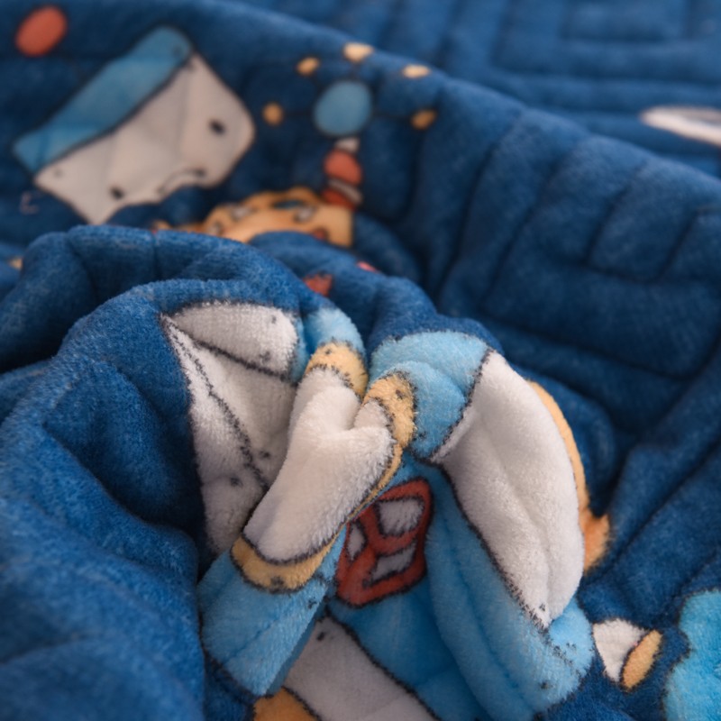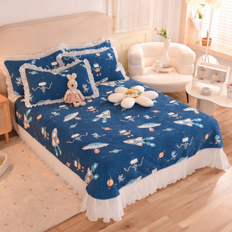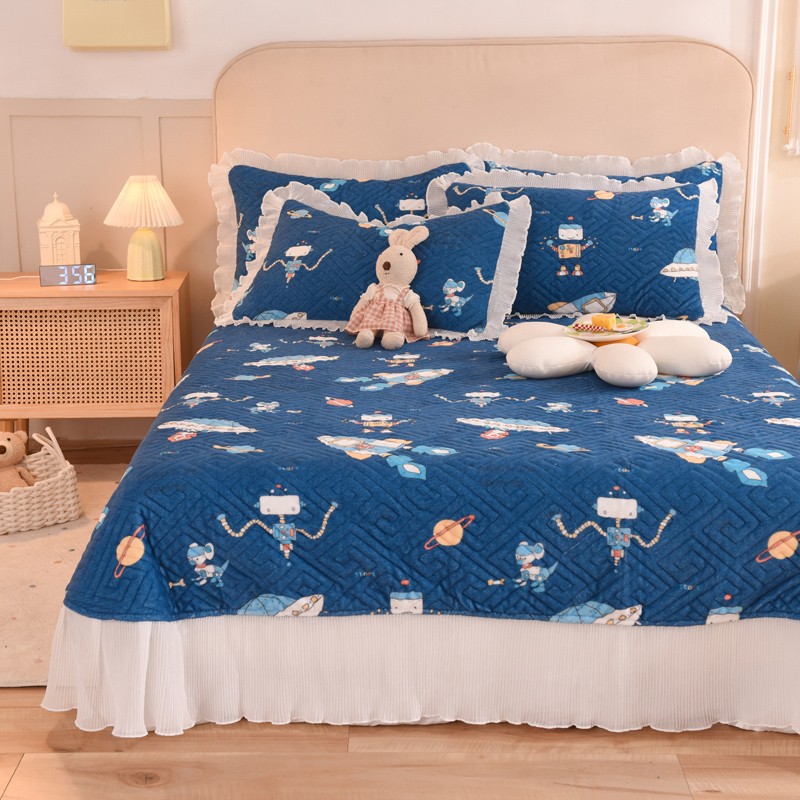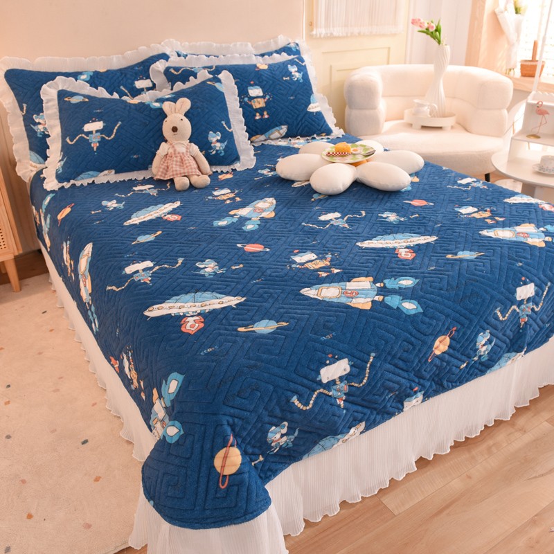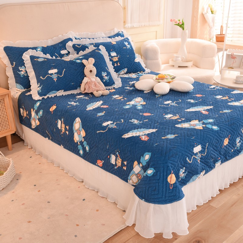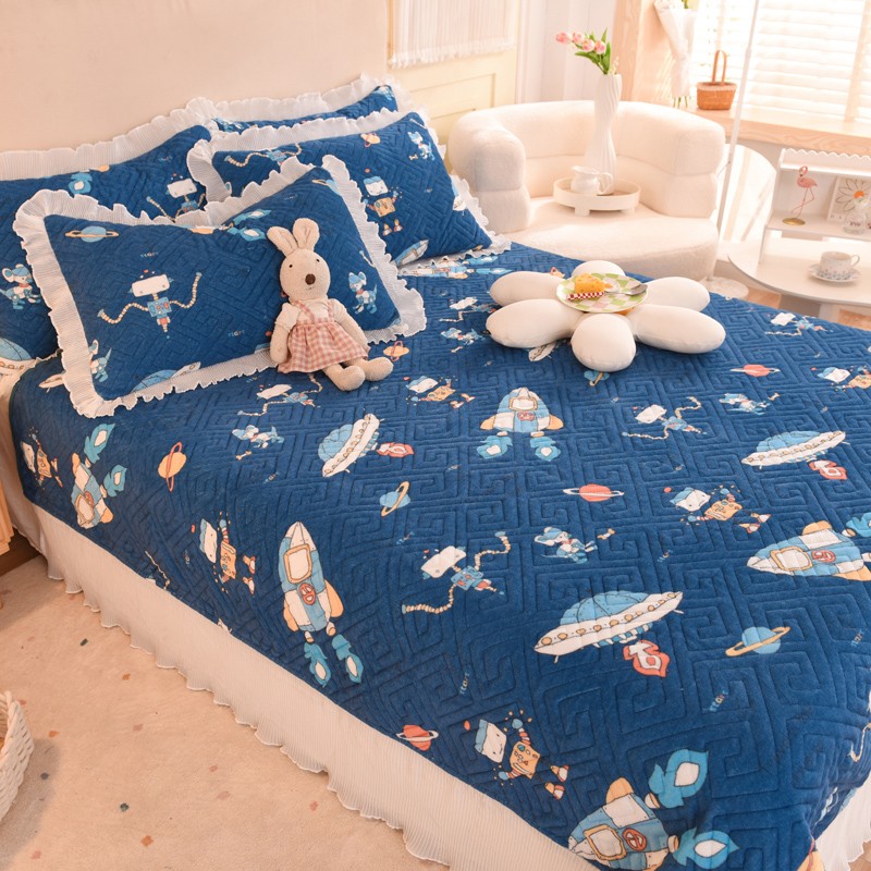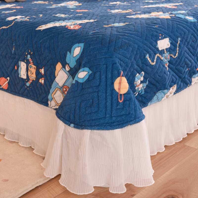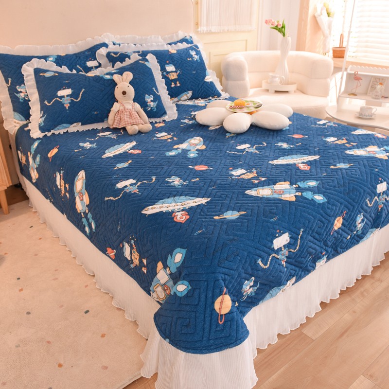 2025新款牛奶绒印花夹棉花边 单品床盖 太空机器人北卡蓝