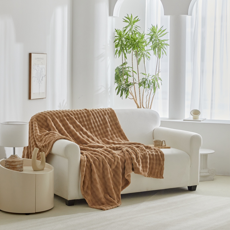 巴木赫 2024新款法兰绒泡泡卷边毯子毛毯 卡其