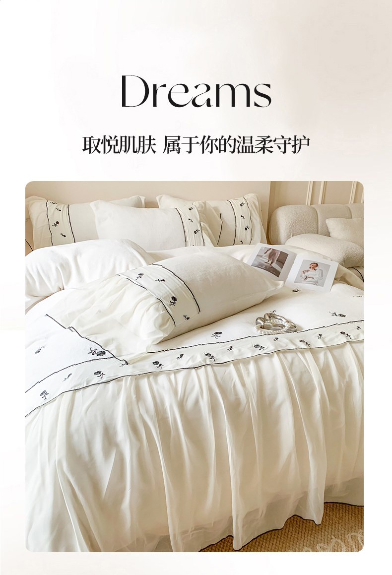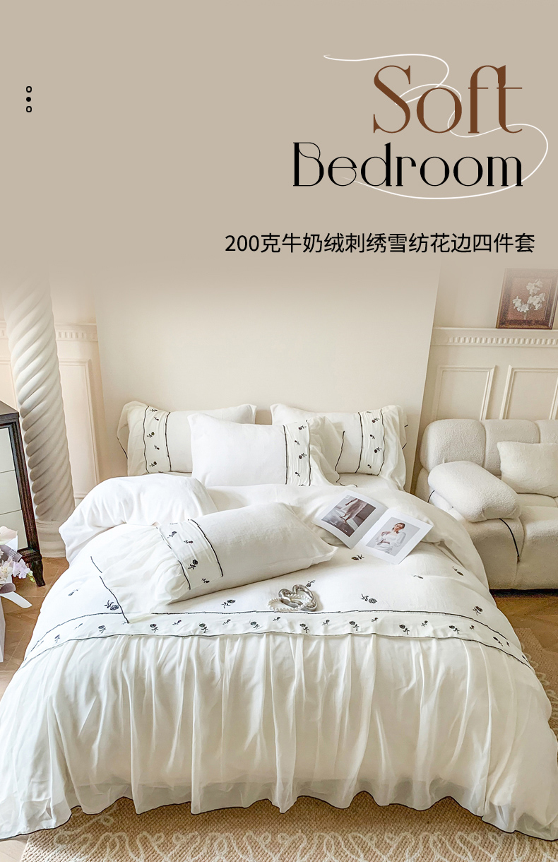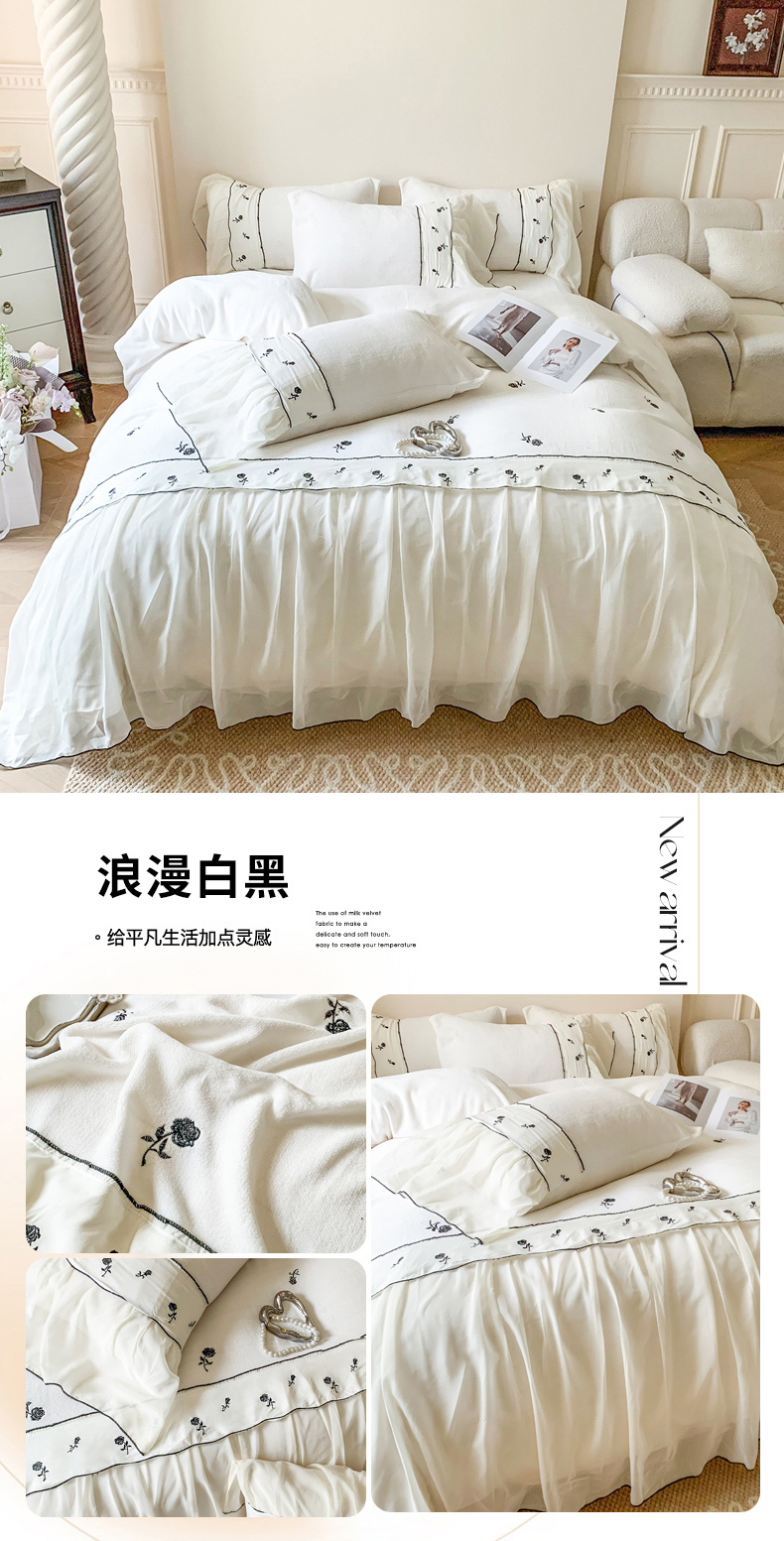 当前位置: 91家纺网 > 商品网购 > 床品套件 > 四件套 > 牛奶绒四件套 > 你好美丽 2025新款200克A类牛奶绒蕾丝花边工艺款四件套 浪漫白黑