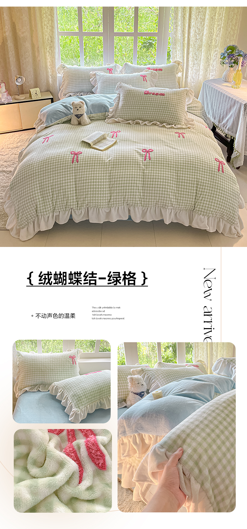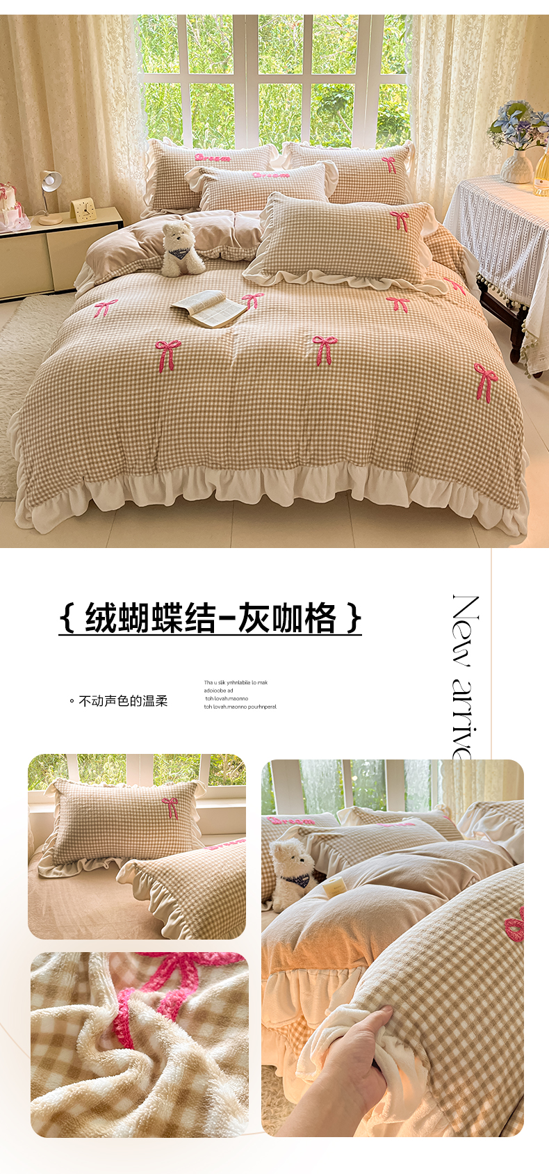 当前位置: 91家纺网 > 商品网购 > 床品套件 > 四件套 > 牛奶绒四件套 > 沐辰 2025新款牛奶绒绣花蝴蝶结花边款四件套 绒蝴蝶结-蓝格