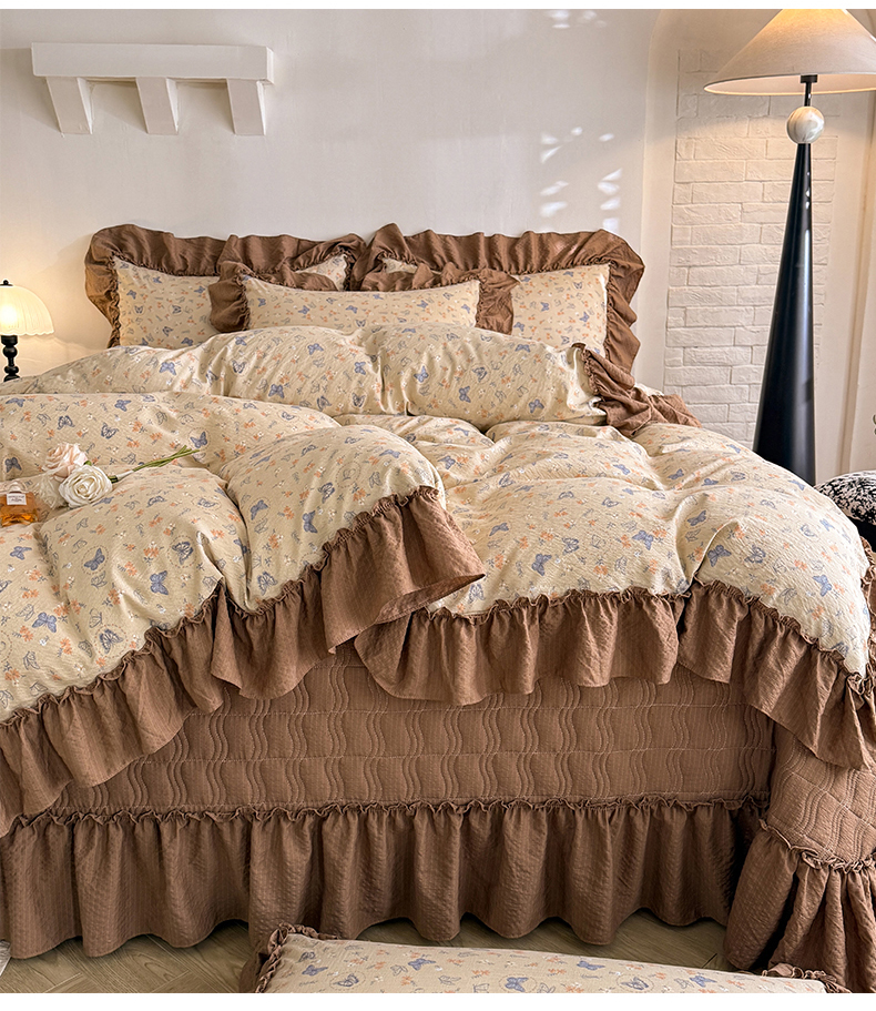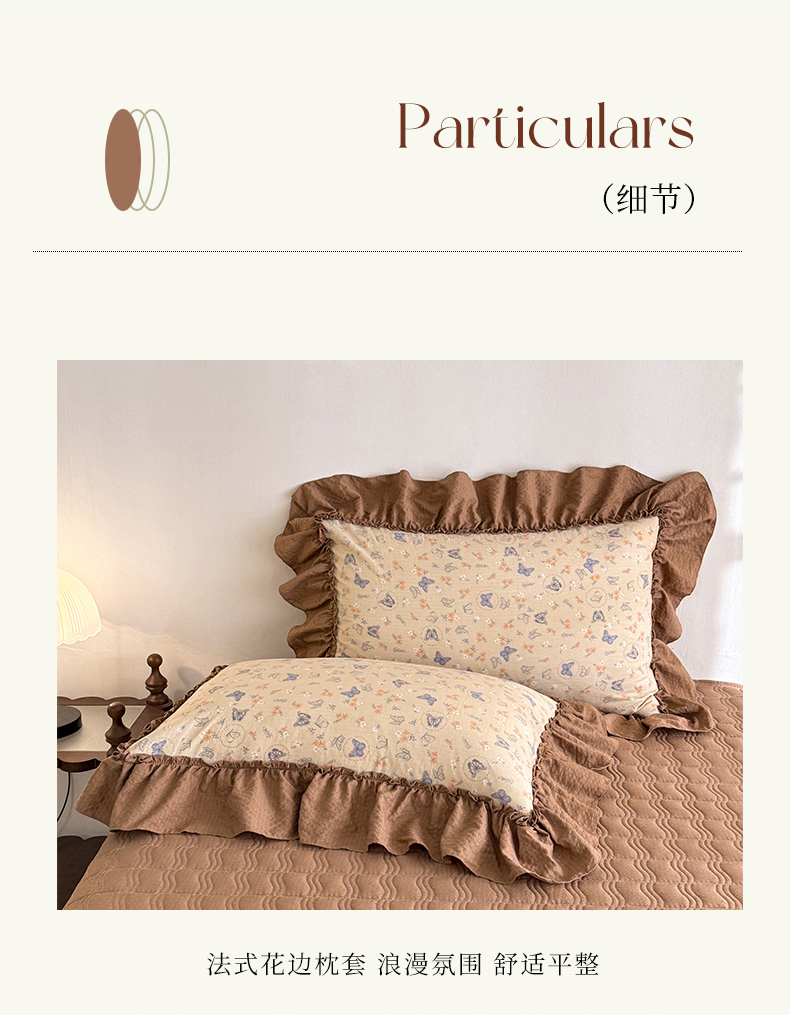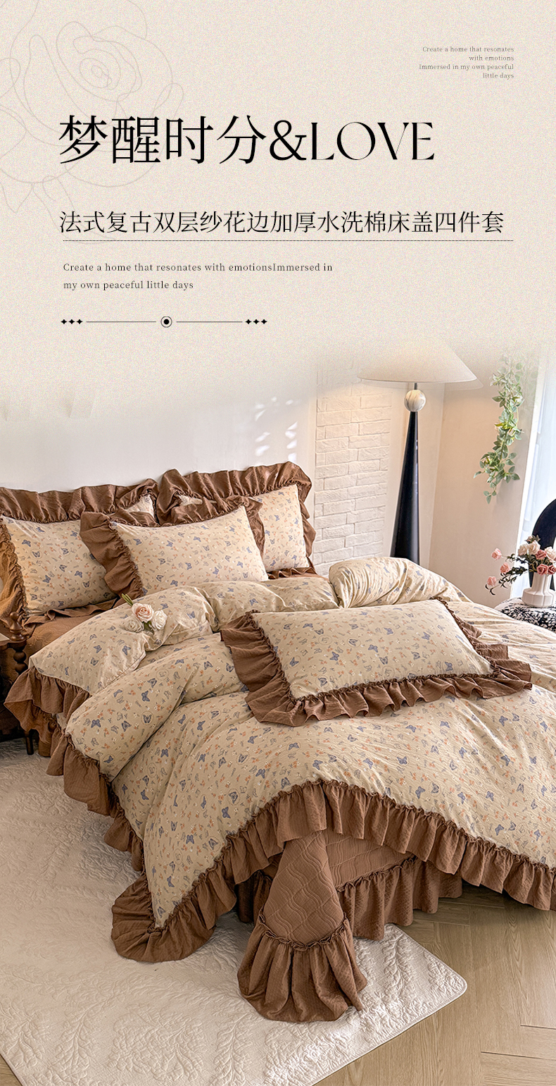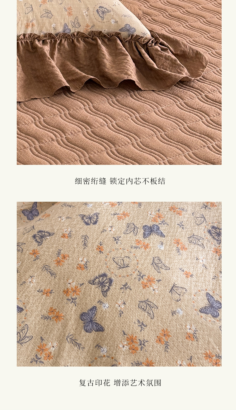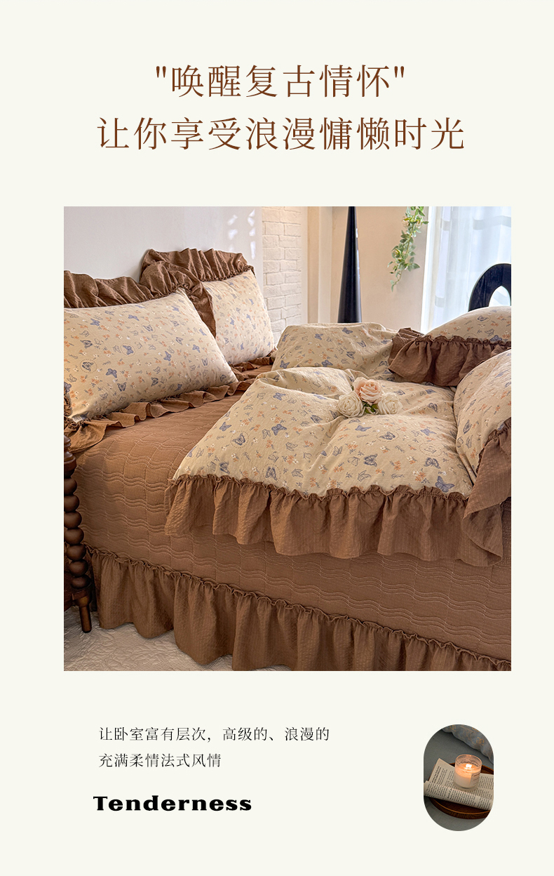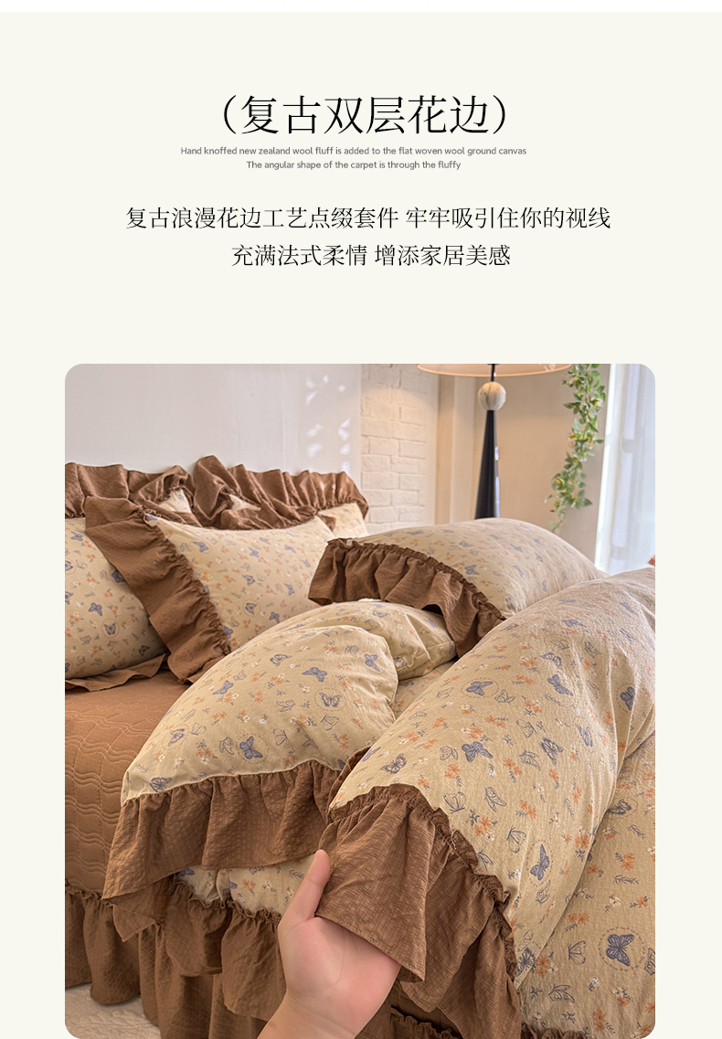 当前位置: 91家纺网 > 商品网购 > 床品套件 > 四件套 > 双层纱四件套 > 贝凯瑞 2026新款双层纱木棉水洗棉法式复古花边床盖单件三件四件套-焦糖系列 焦糖蓝蝶
