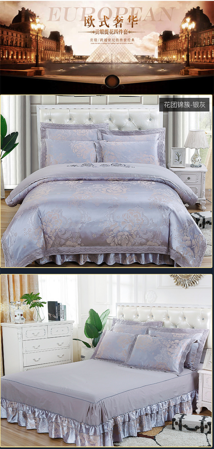 福丽莱家纺 贡缎提花床裙四件套(单层)花团锦簇-银灰