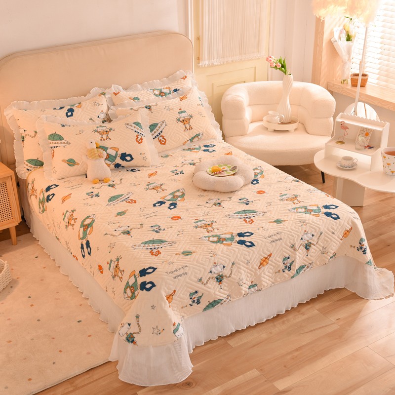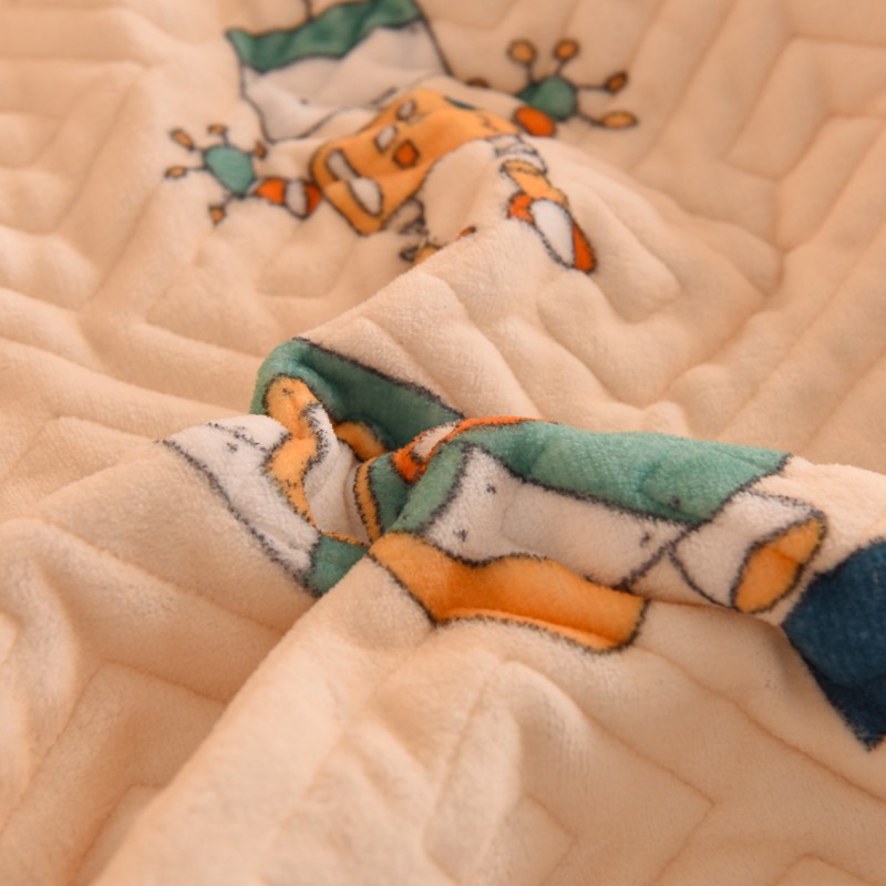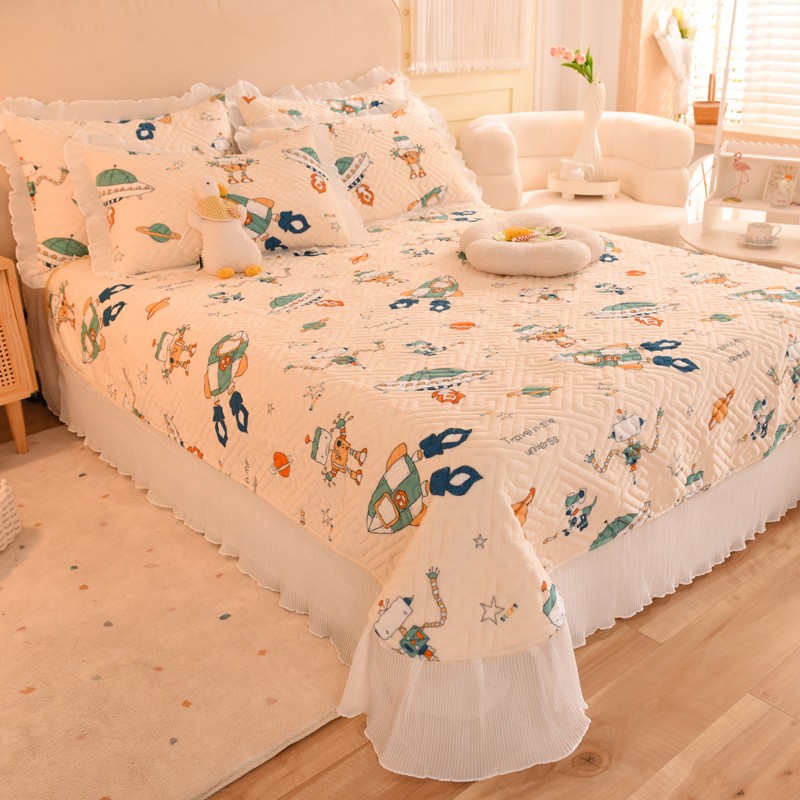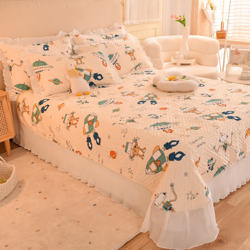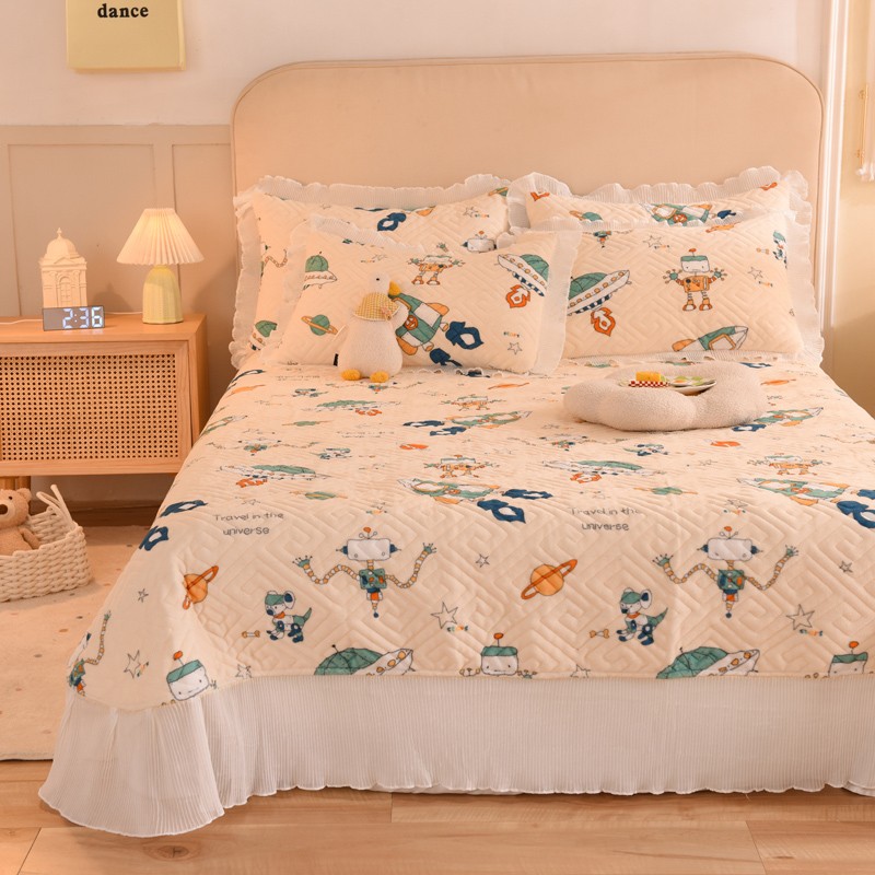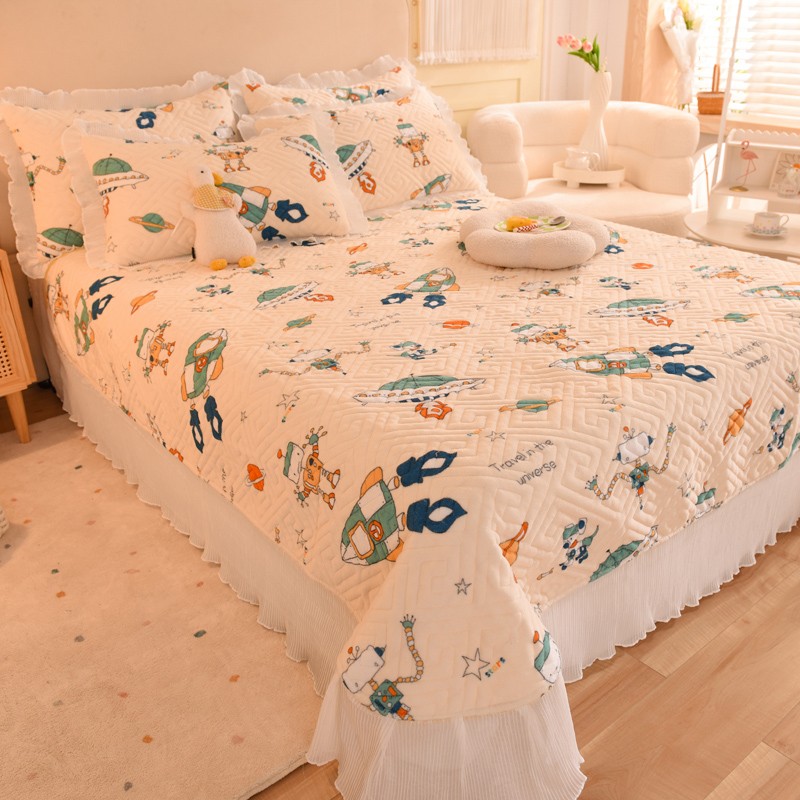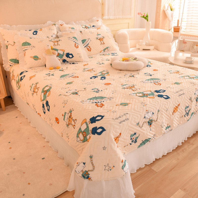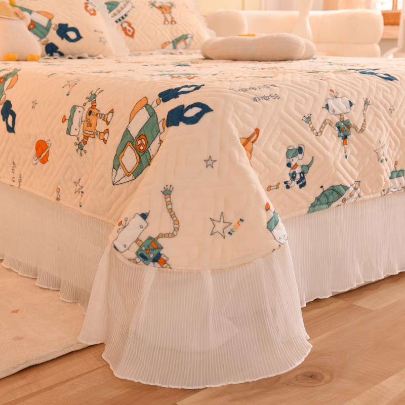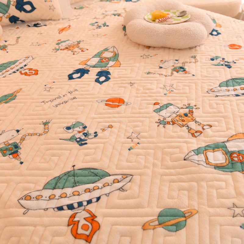 2025新款牛奶绒印花夹棉花边 单品床盖 太空机器人米白