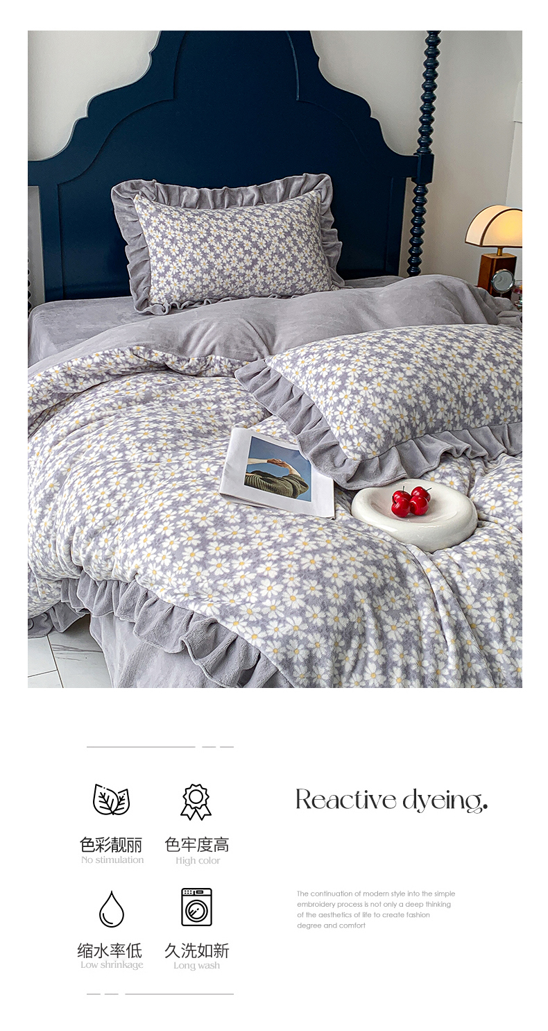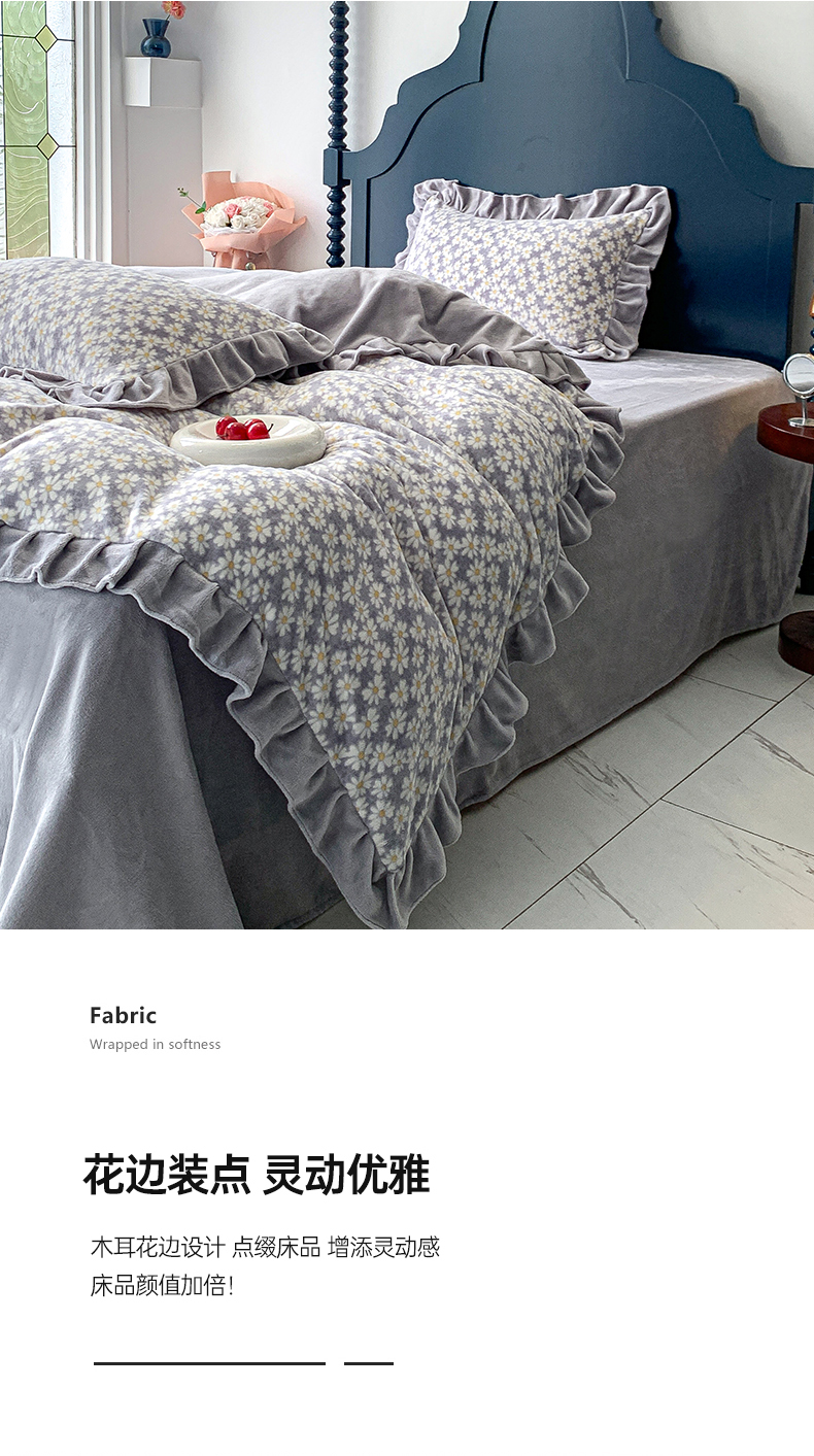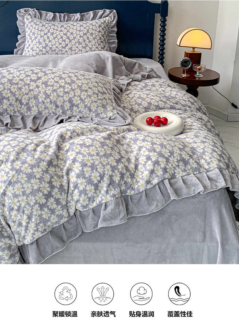 商品名称:春光里-2023新款高克重花边款直播热卖牛奶绒四件套 小雏菊-灰