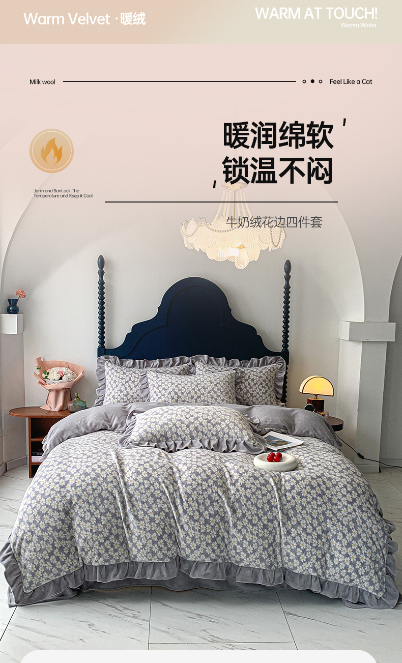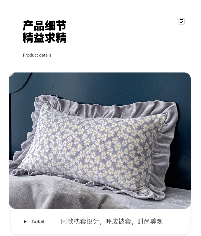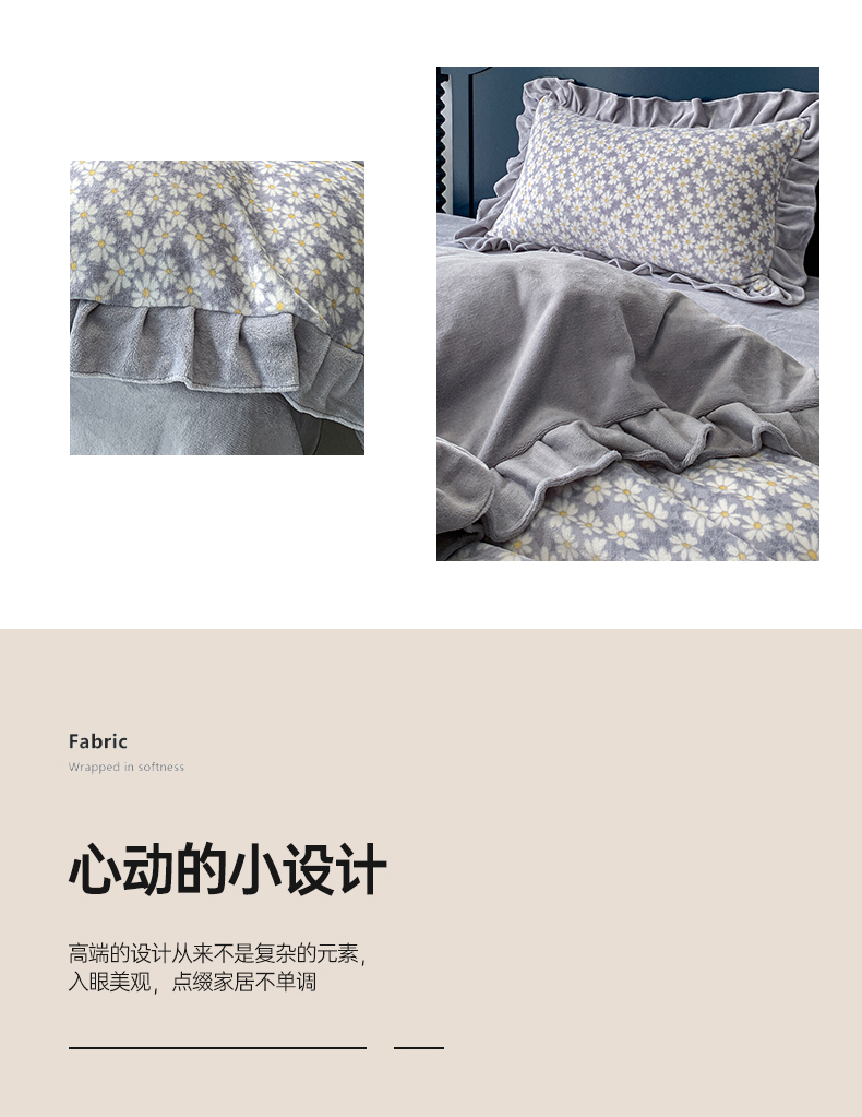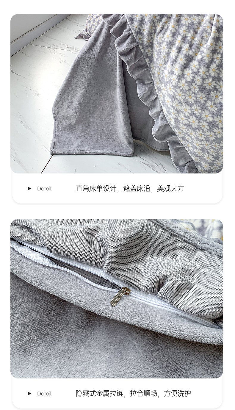 商品名称:春光里-2023新款高克重花边款直播热卖牛奶绒四件套 小雏菊-灰
