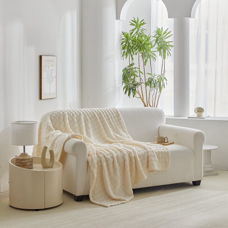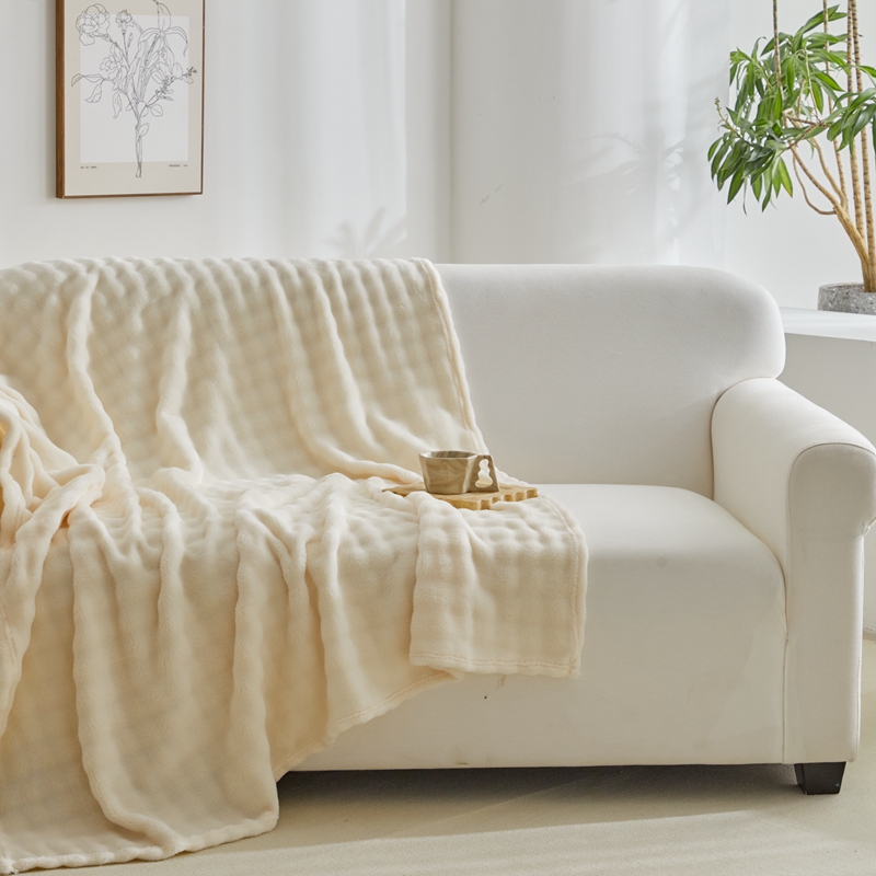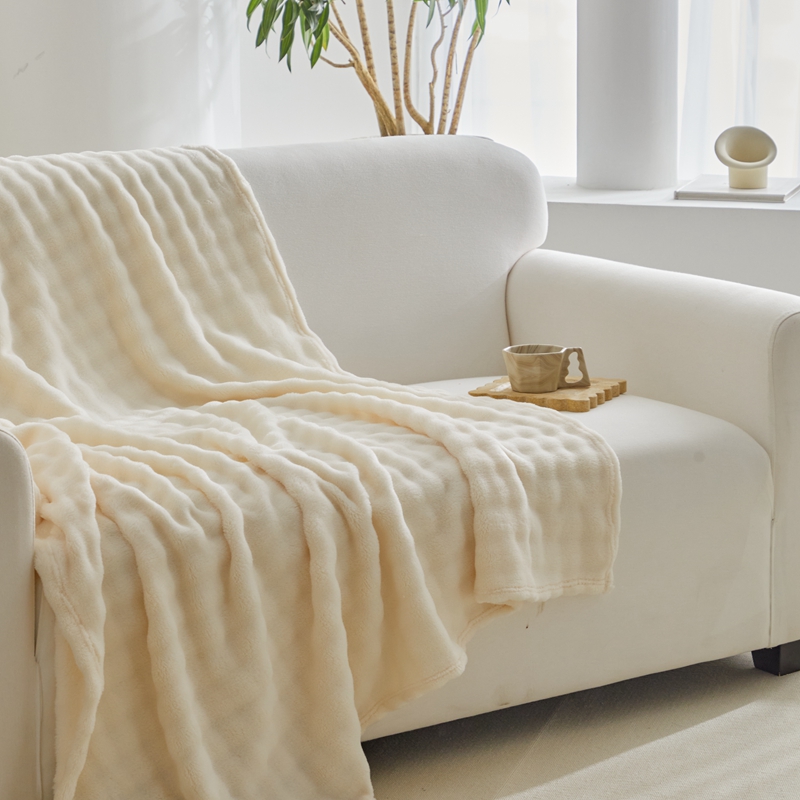 巴木赫 2024新款法兰绒泡泡卷边毯子毛毯 米白