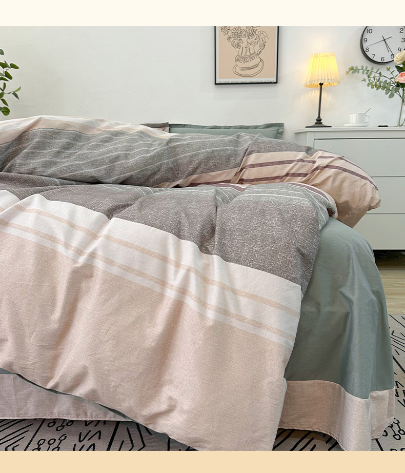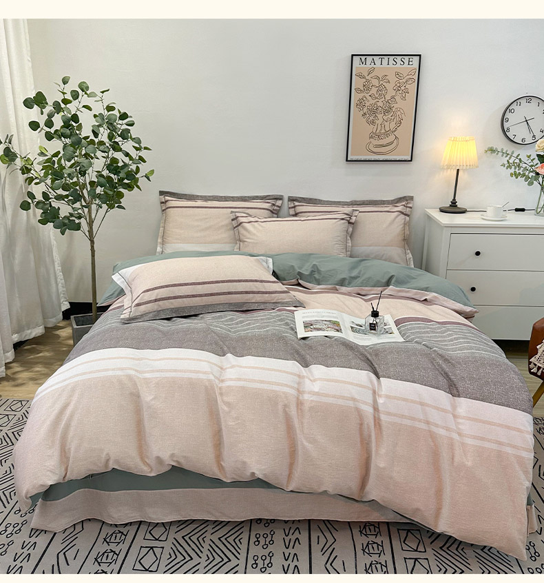 (总)橙艺家居 2022新款全棉色织水洗花边细条纹四件套套件,蜜桃粉,牛仔蓝,浅卡其