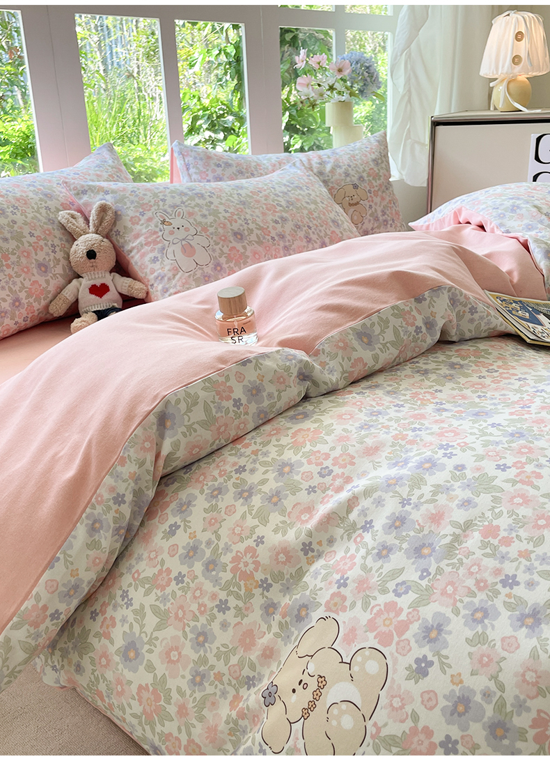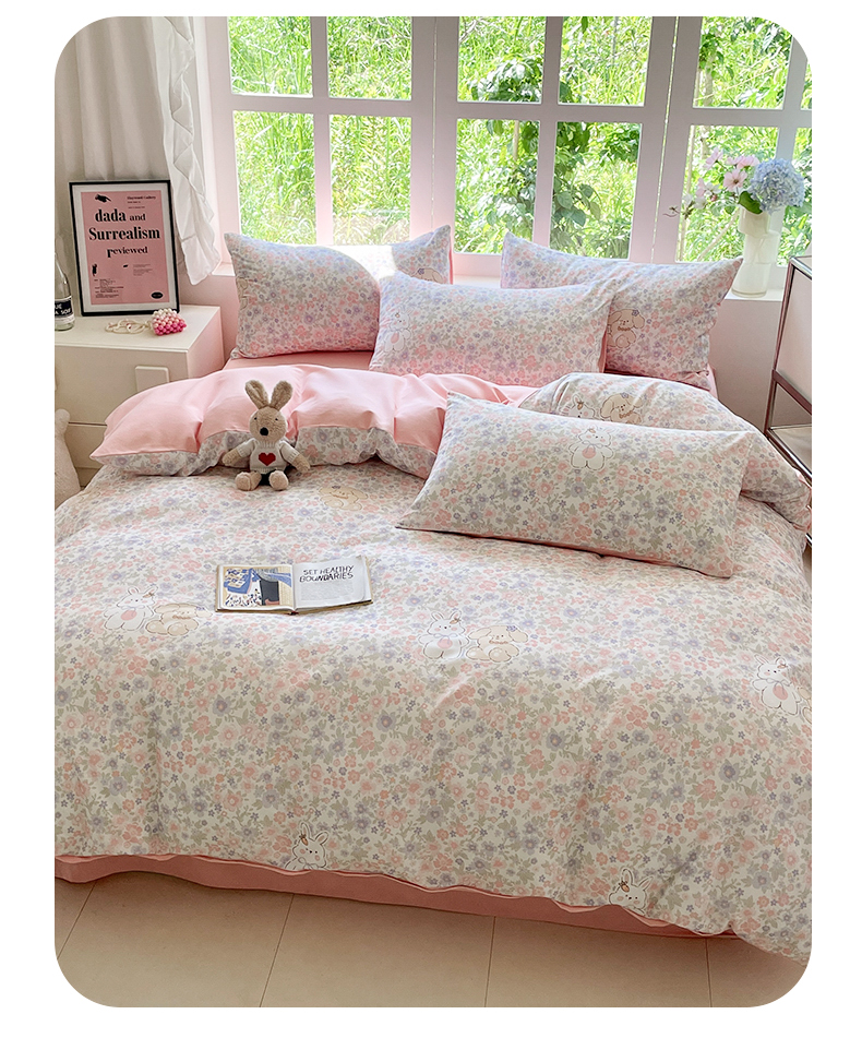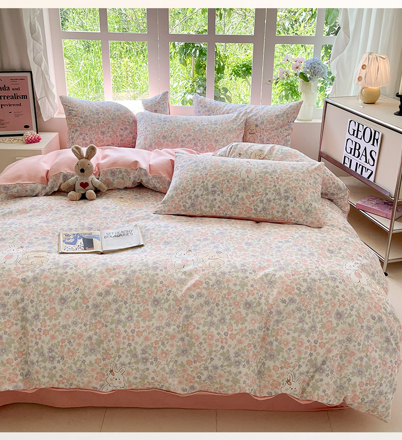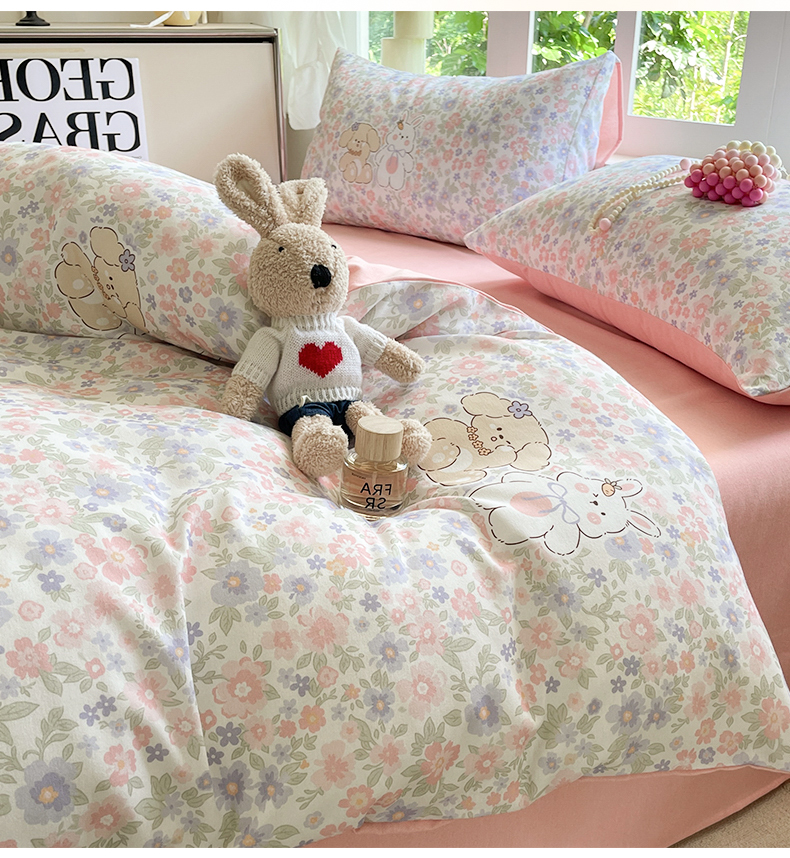本制 2025秋冬新款全棉混纺磨毛印花四件套 花涧小兔-杨妃粉
