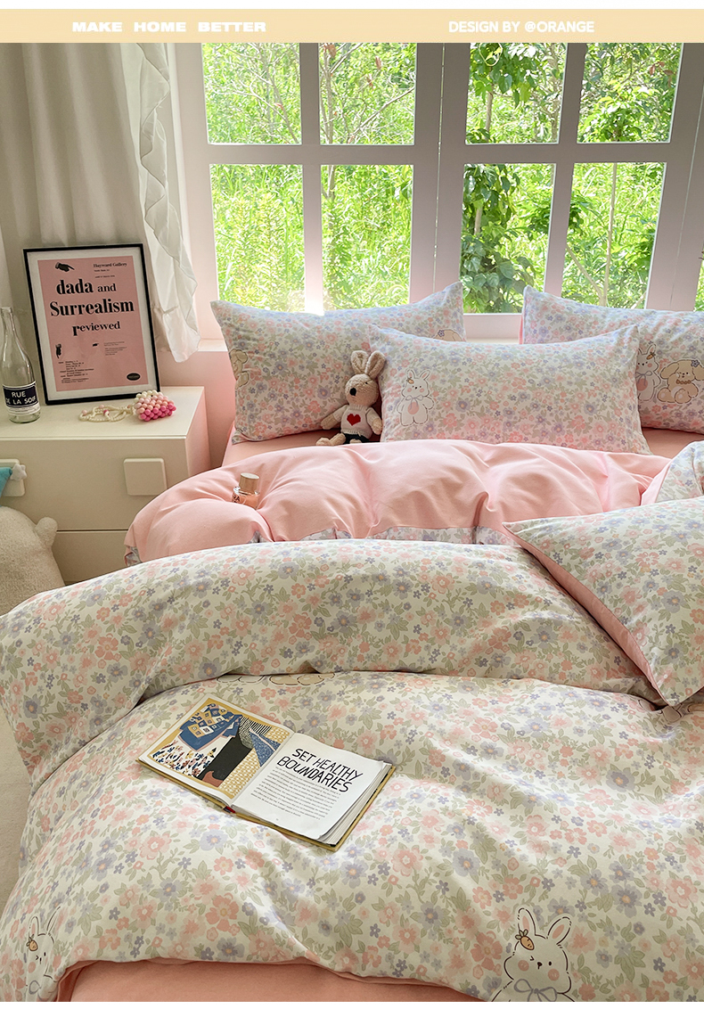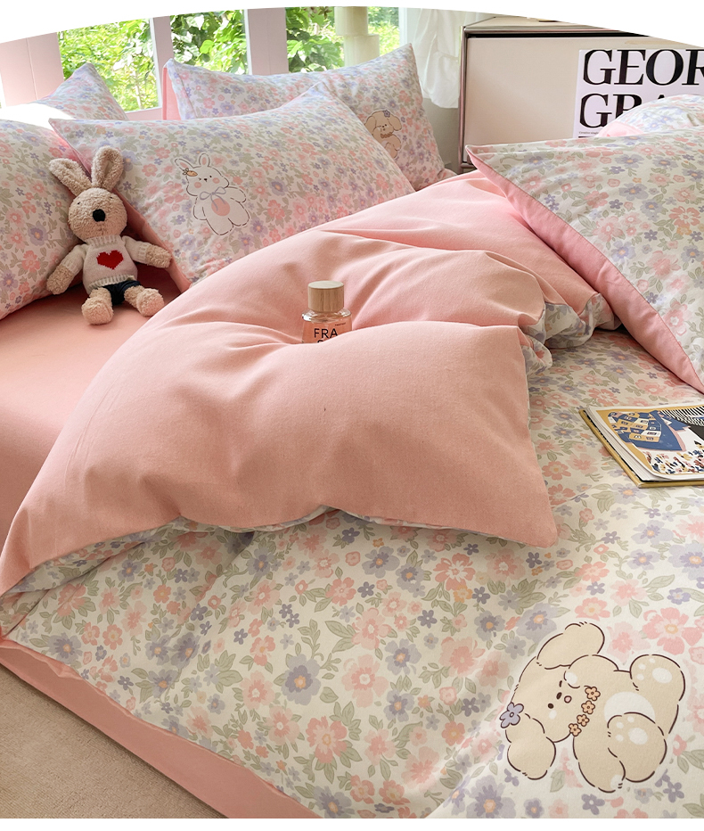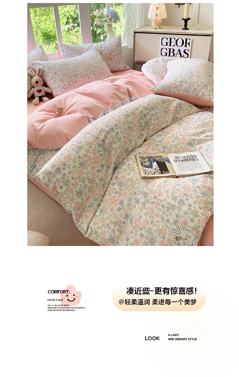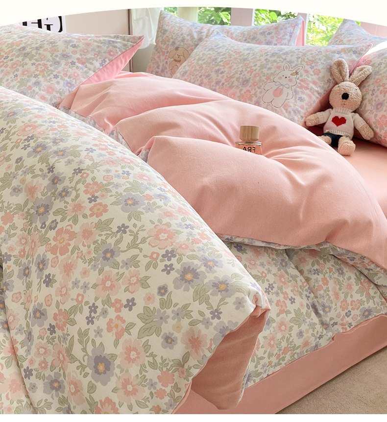 本制 2025秋冬新款全棉混纺磨毛印花四件套 花涧小兔-杨妃粉