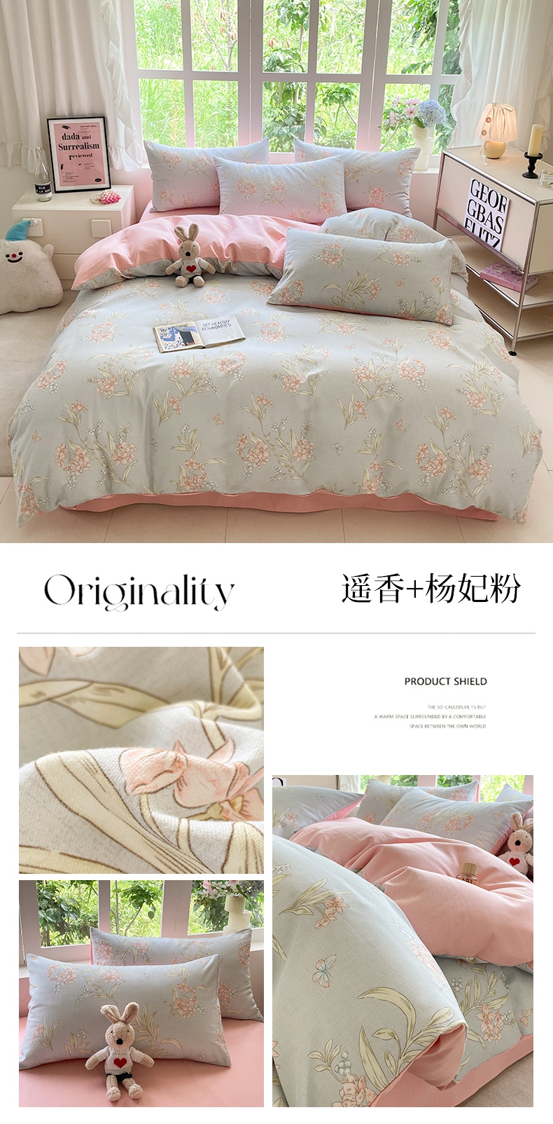 商品名称:本制 2025秋冬新款全棉混纺磨毛印花四件套 花涧小兔-杨妃粉