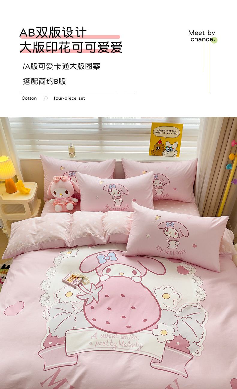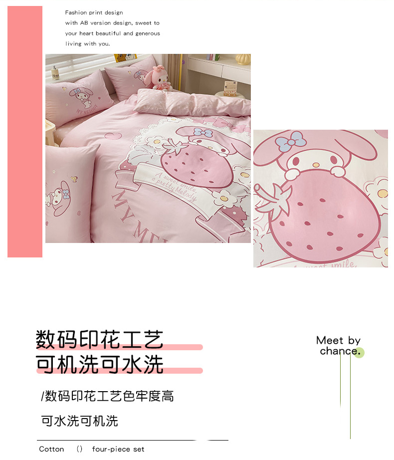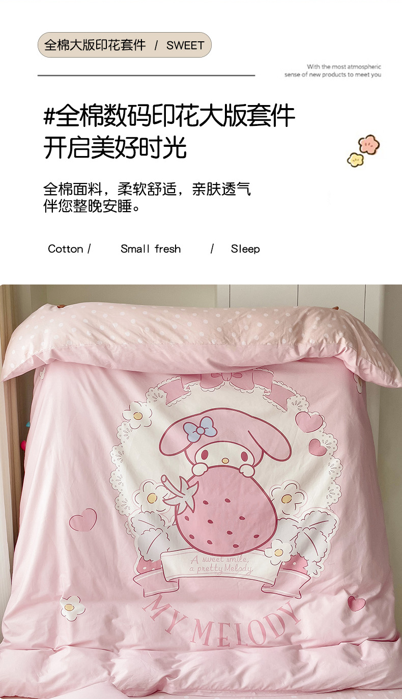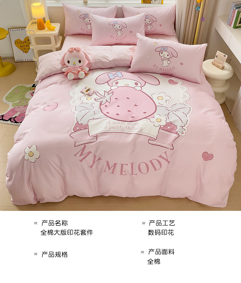 商品名称:朵希曼 2026新款正版授权全棉大版数码印花三丽鸥系列四件套 粉兔草莓
