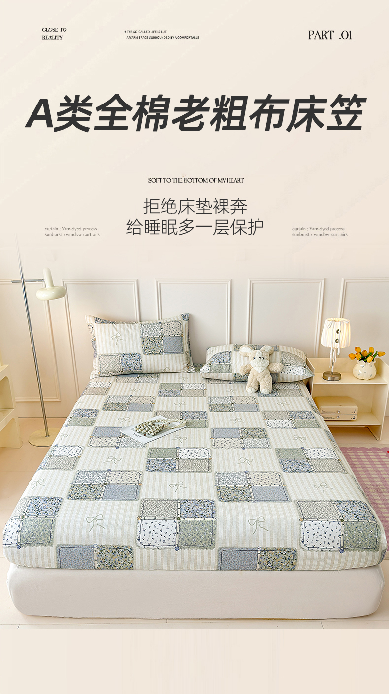 (总)缦彩 2026新款A类全棉老粗布床笠单件加厚床罩三件套,素锦花窗,彼得花镜,简纹蓝调,萌犬格纹,浅草花信,森系小菇,素墨芳华,星点萌宠,云间青色,金灰格调