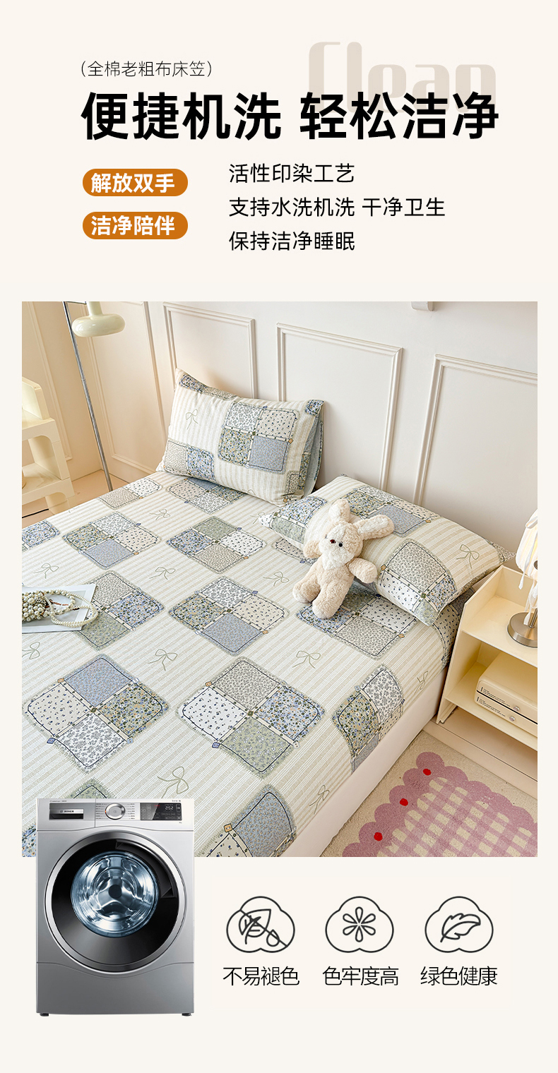 • 91家纺网 家纺一手货源 找家纺 缦彩 2026新款A类全棉老粗布床笠单件加厚床罩三件套 星点萌宠