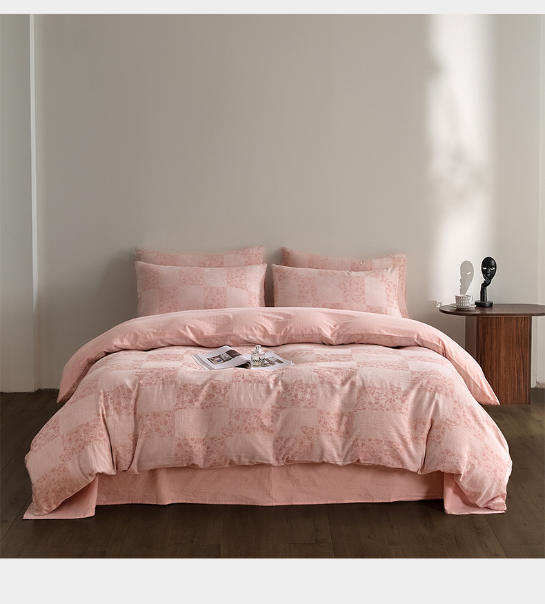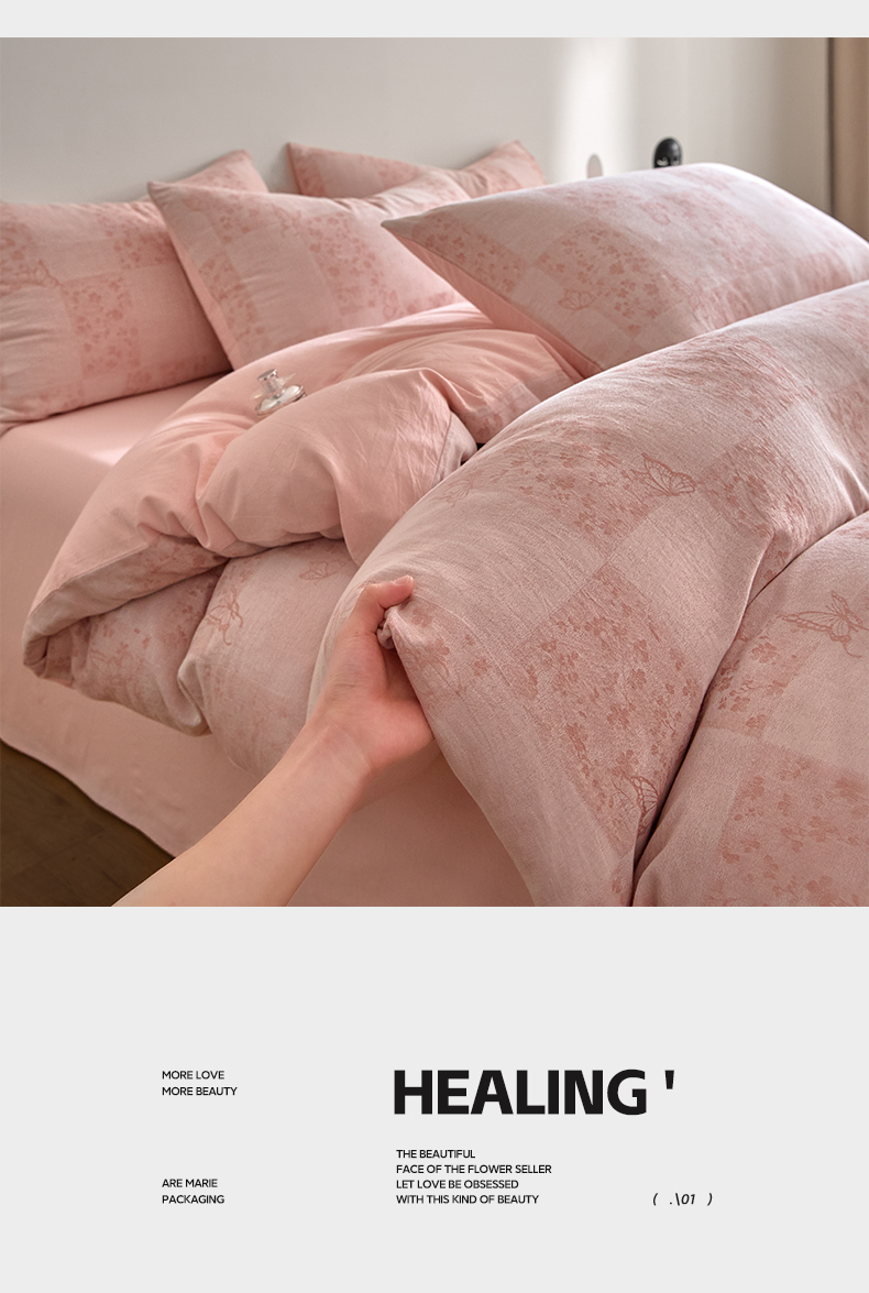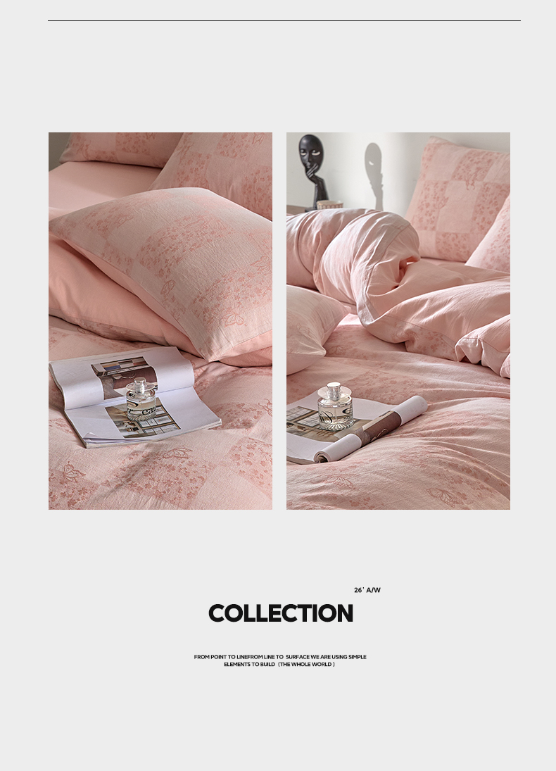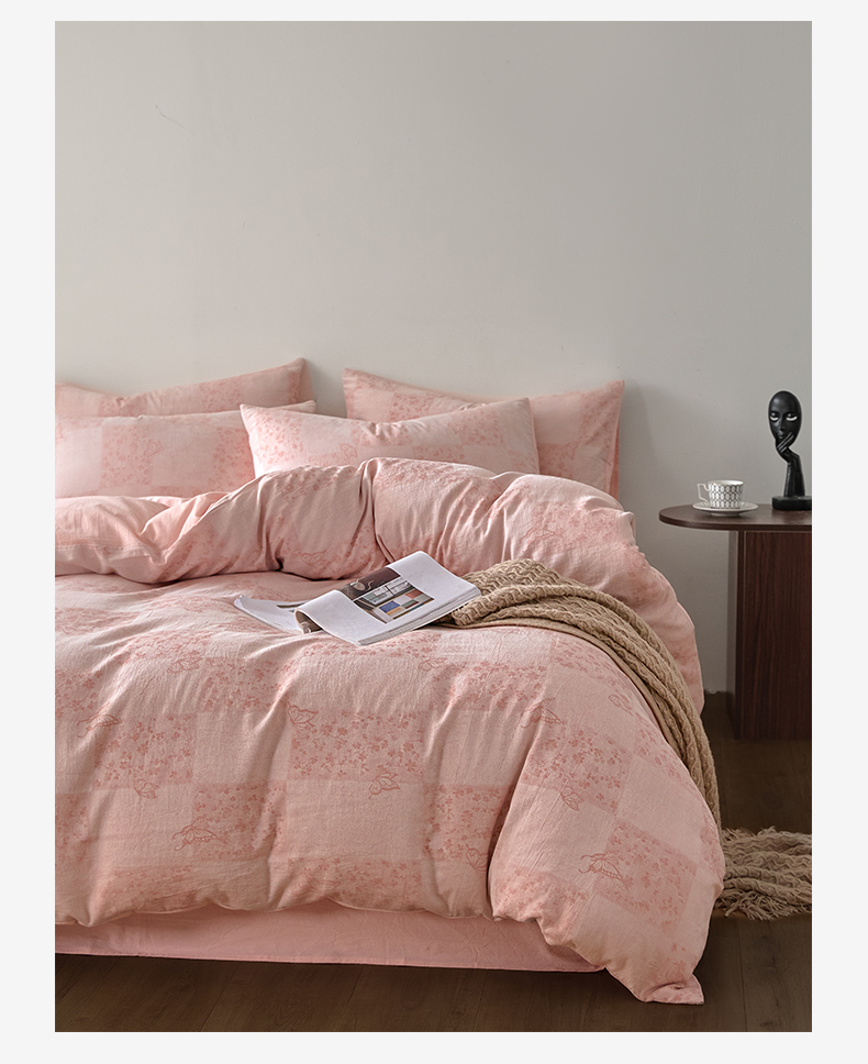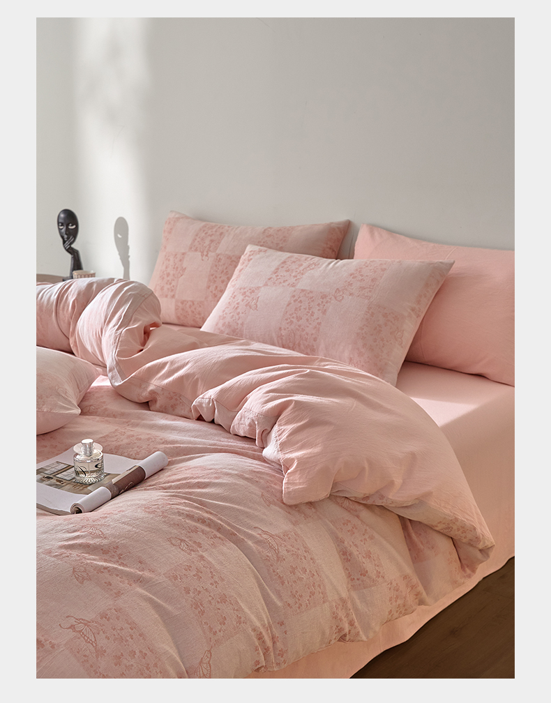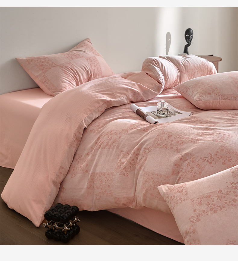 如一 2026新款A类色织提花全棉双层纱水洗棉四件套 蝶漫粉