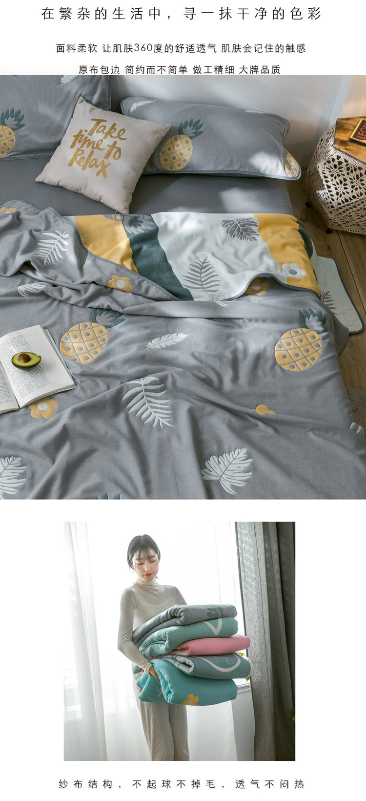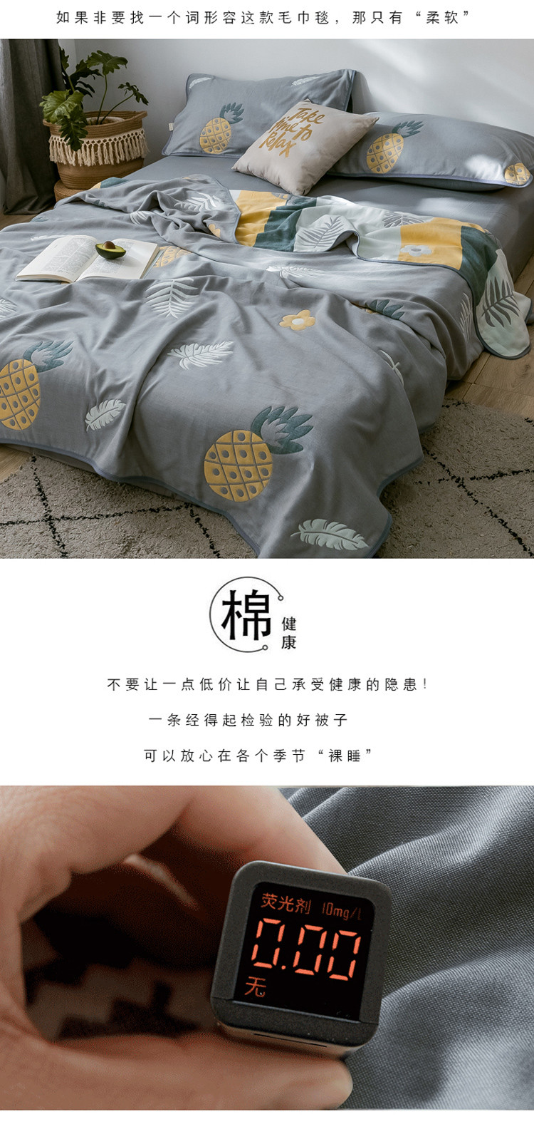 商品名称:朴尔2020新款时尚六层全棉纱布盖毯夏季毛巾被 菠萝物语-灰