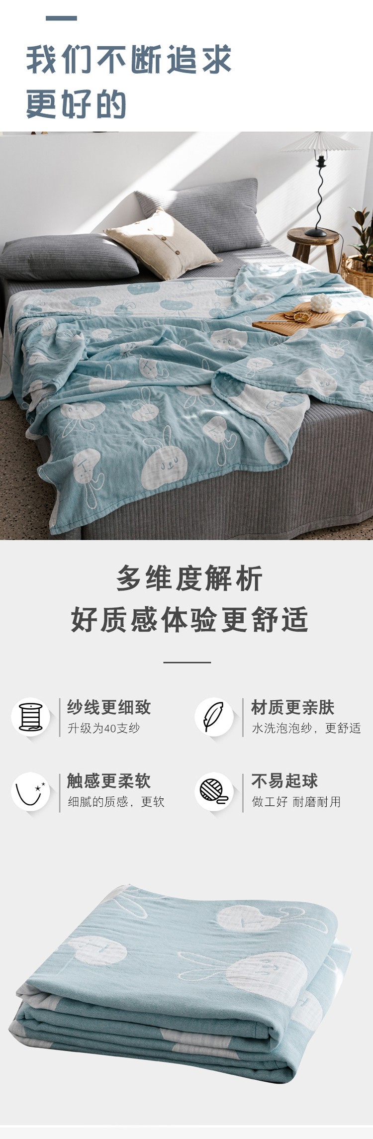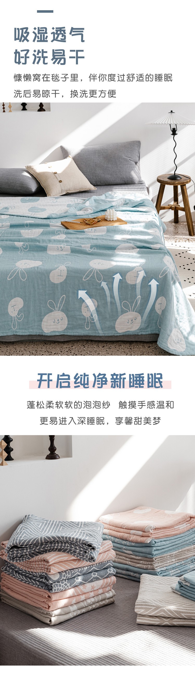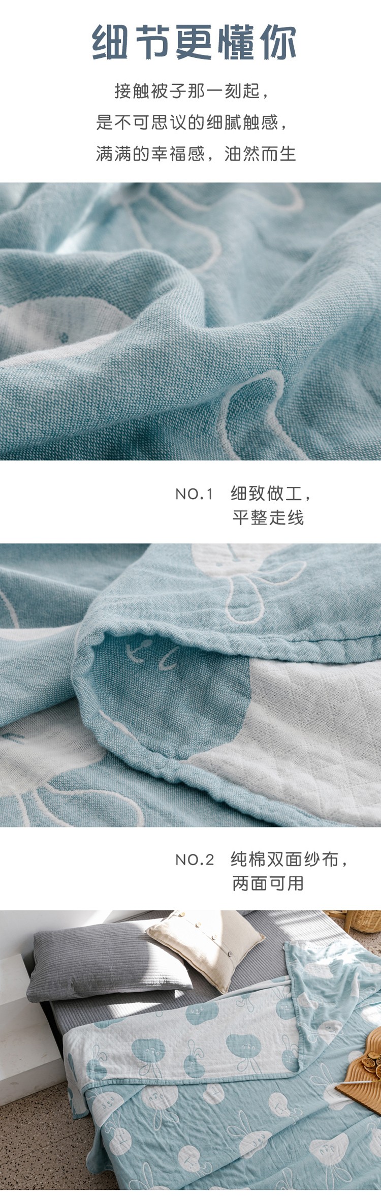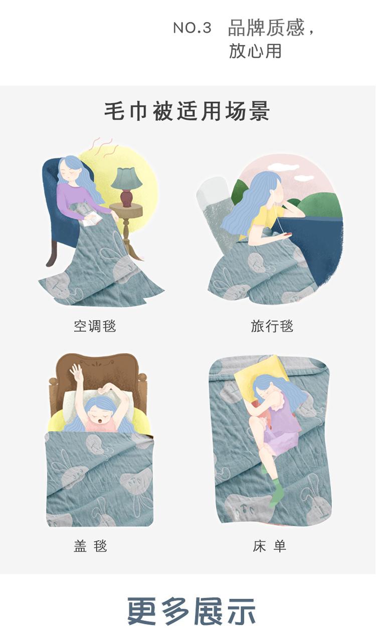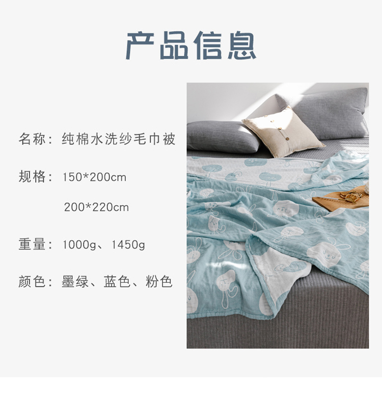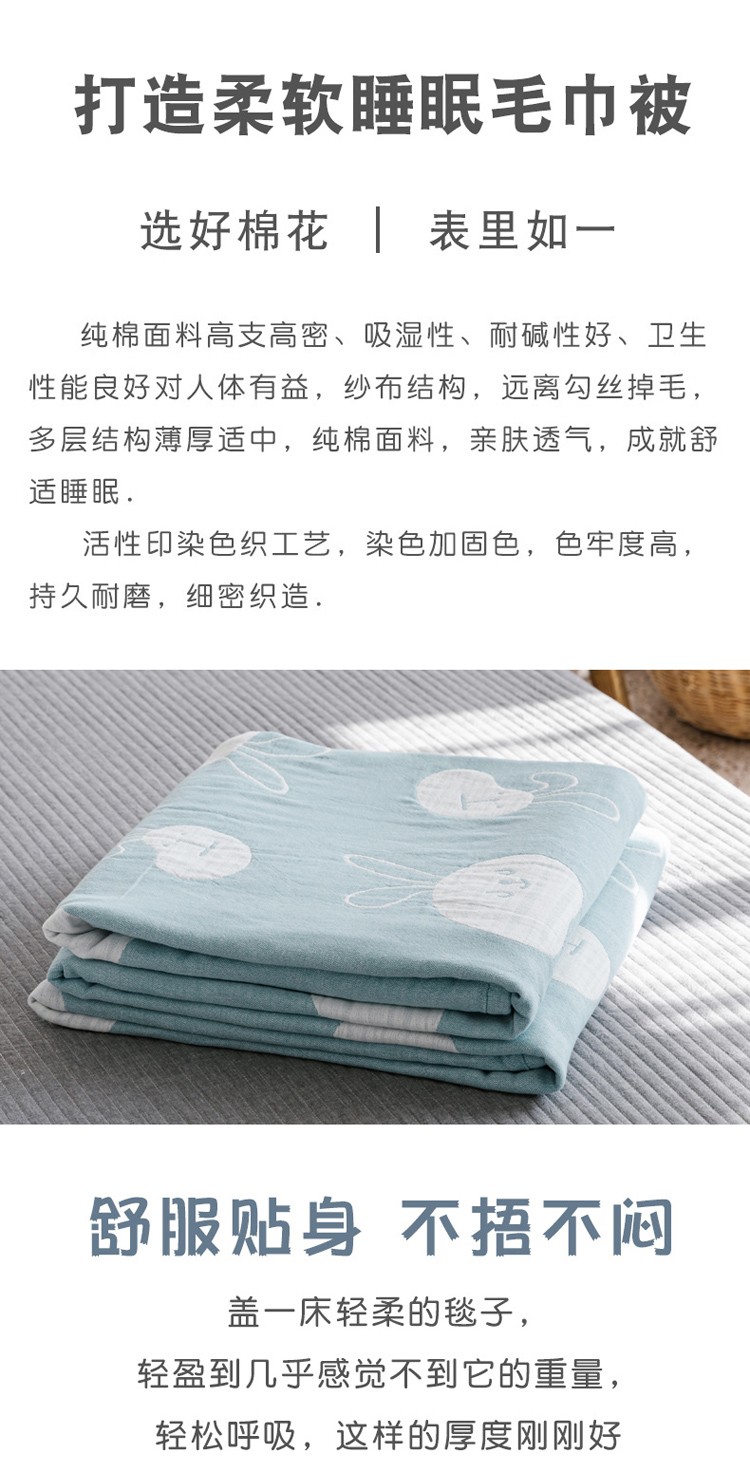 商品名称:朴尔家纺 新款加厚三层水洗棉全棉纱布毛巾被 灵动兔-兰