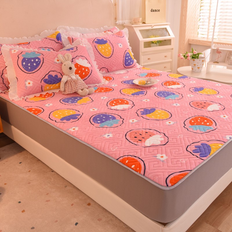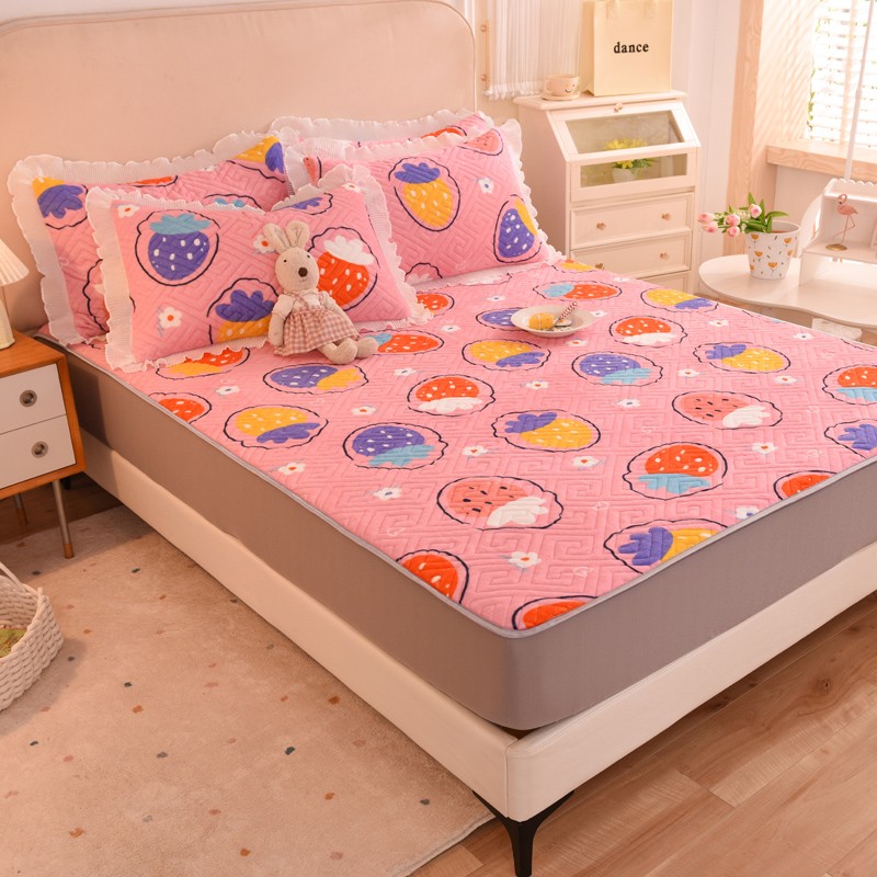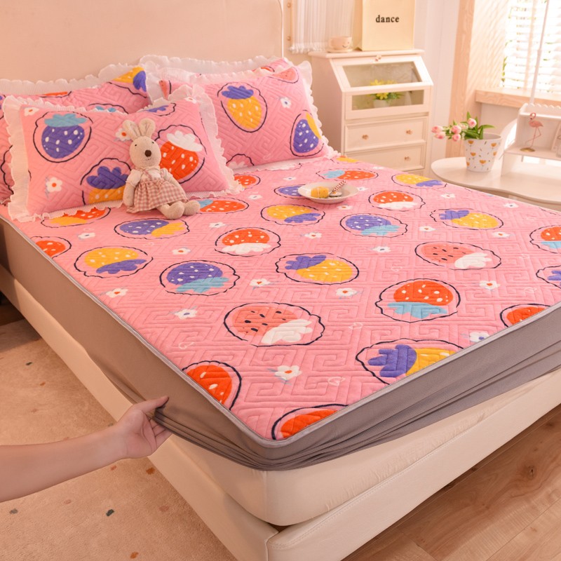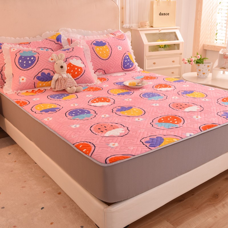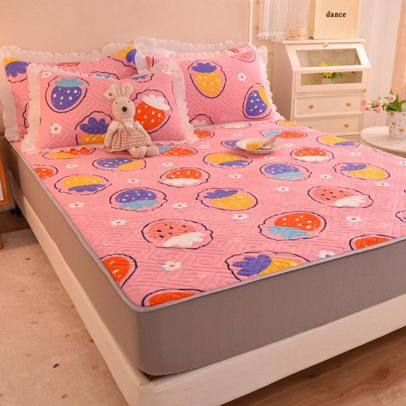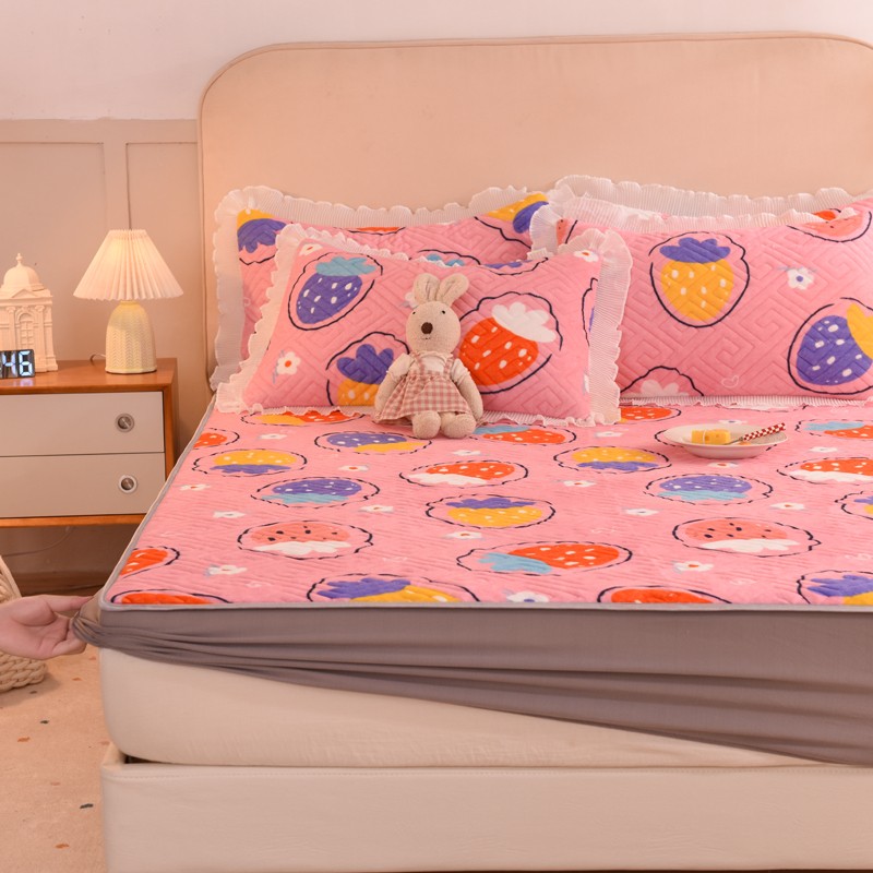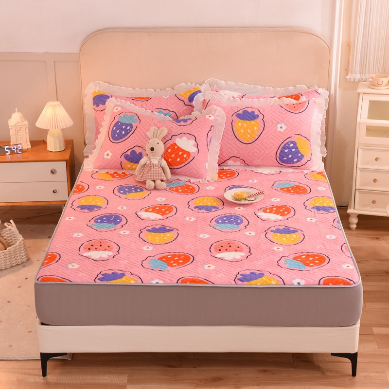 甜之梦 2025新款牛奶绒印花夹棉花边系列单品床笠 粉红草莓