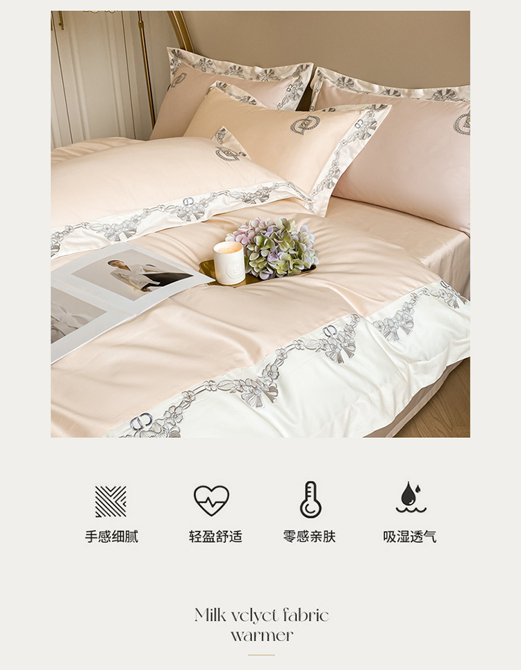 (总)品家居 2025新款5D雕花牛奶绒绣花大拼角四件套-岁月静好,粉色,蓝色,秋黄